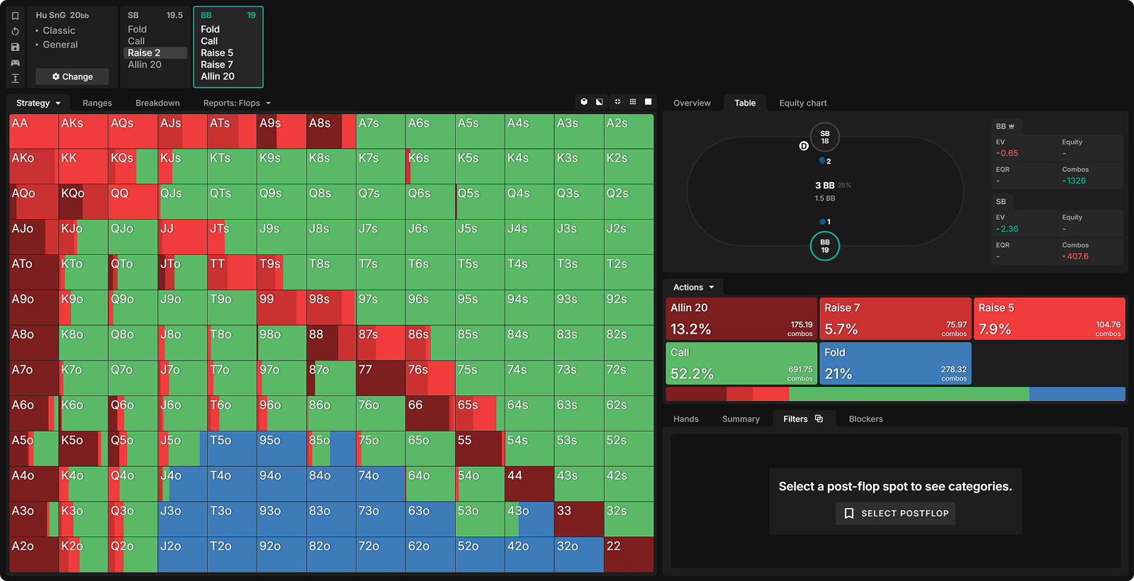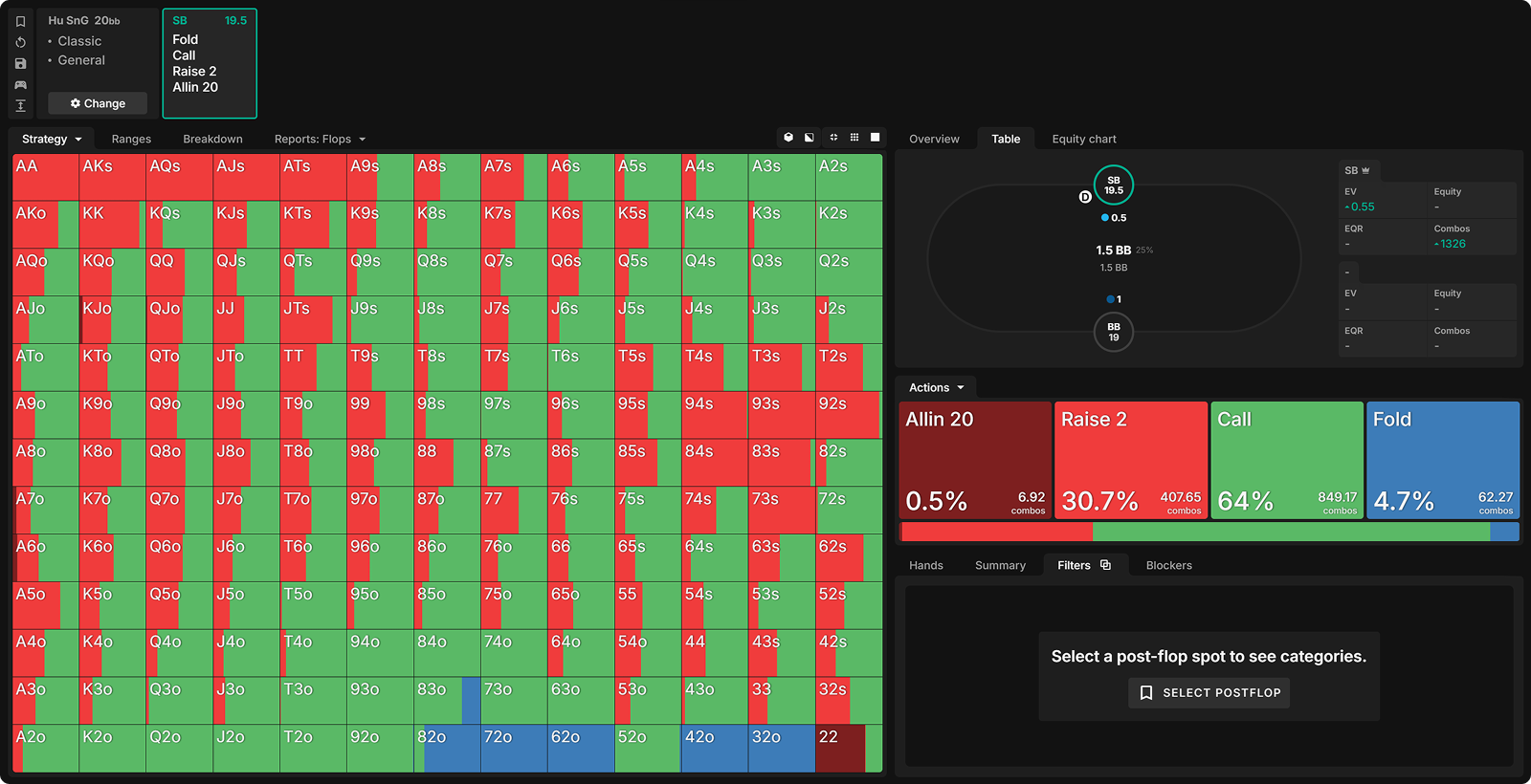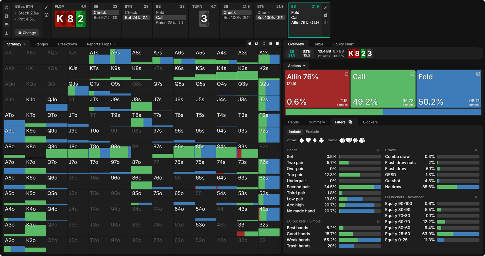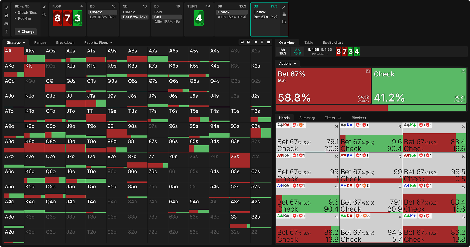 We see that a small size is being used at a high frequency. This will keep our range wide when we get called on the flop and arrive on the turn.