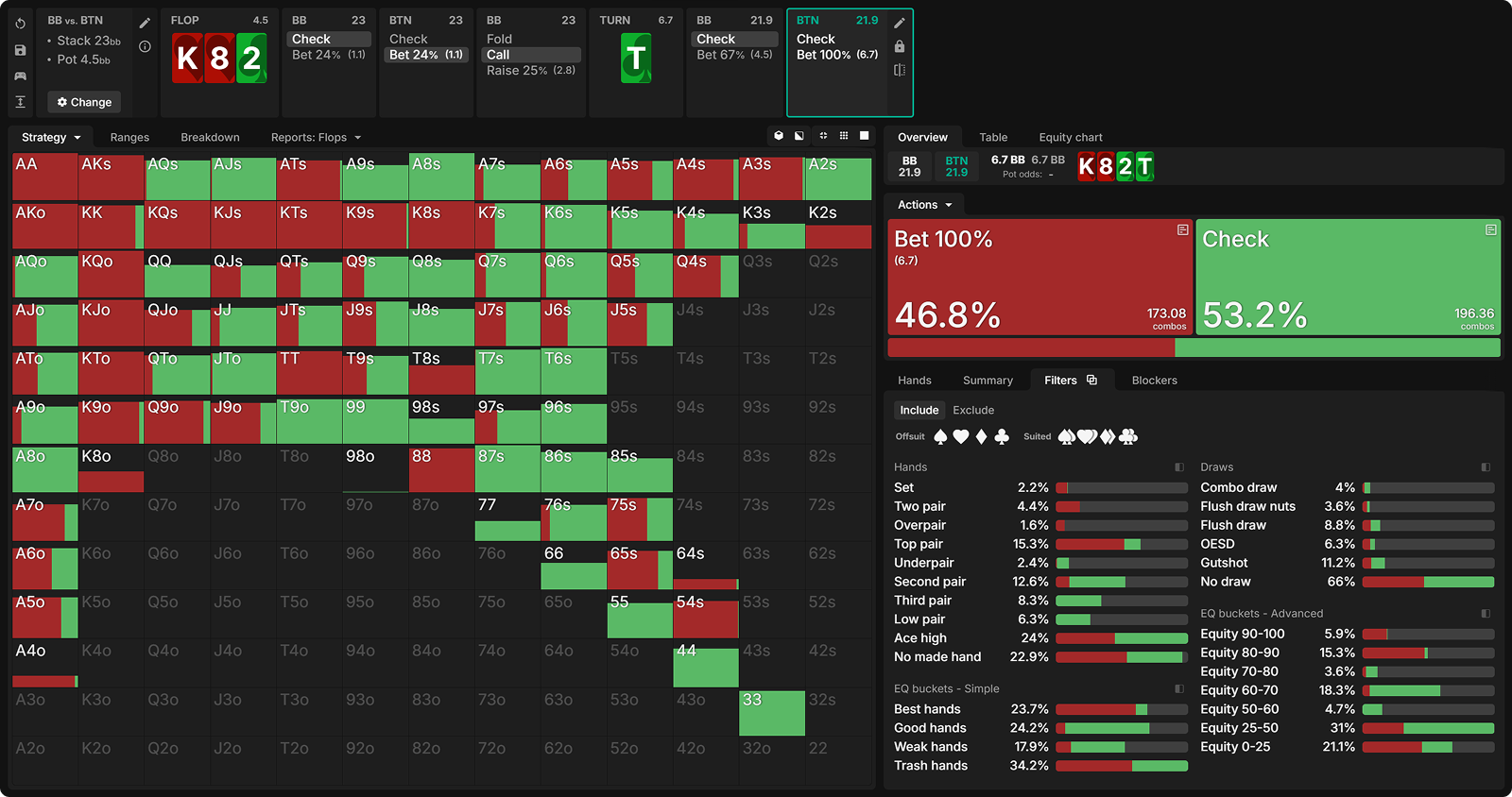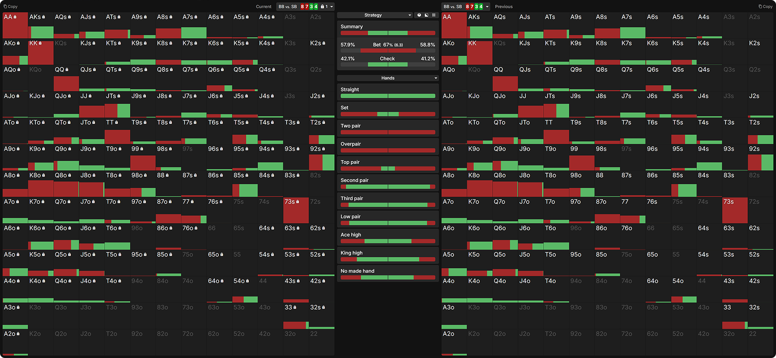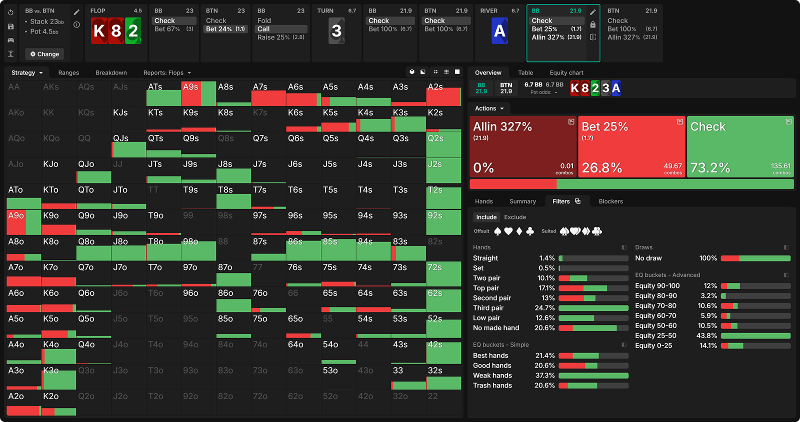 In comparison, we see that in the bet-check-bet line, the top pairs (Ace) with low kickers are not strong enough to value bet as the BB has many Ace-x or stronger to call with. This is why those hands prefer barreling the turn to fold out the better kickers. Meanwhile, our strongest suited Ace-x hands actually benefit from checking the turn, since this allows them to collect extra chips from hands that would have folded had we fired a second barrel.