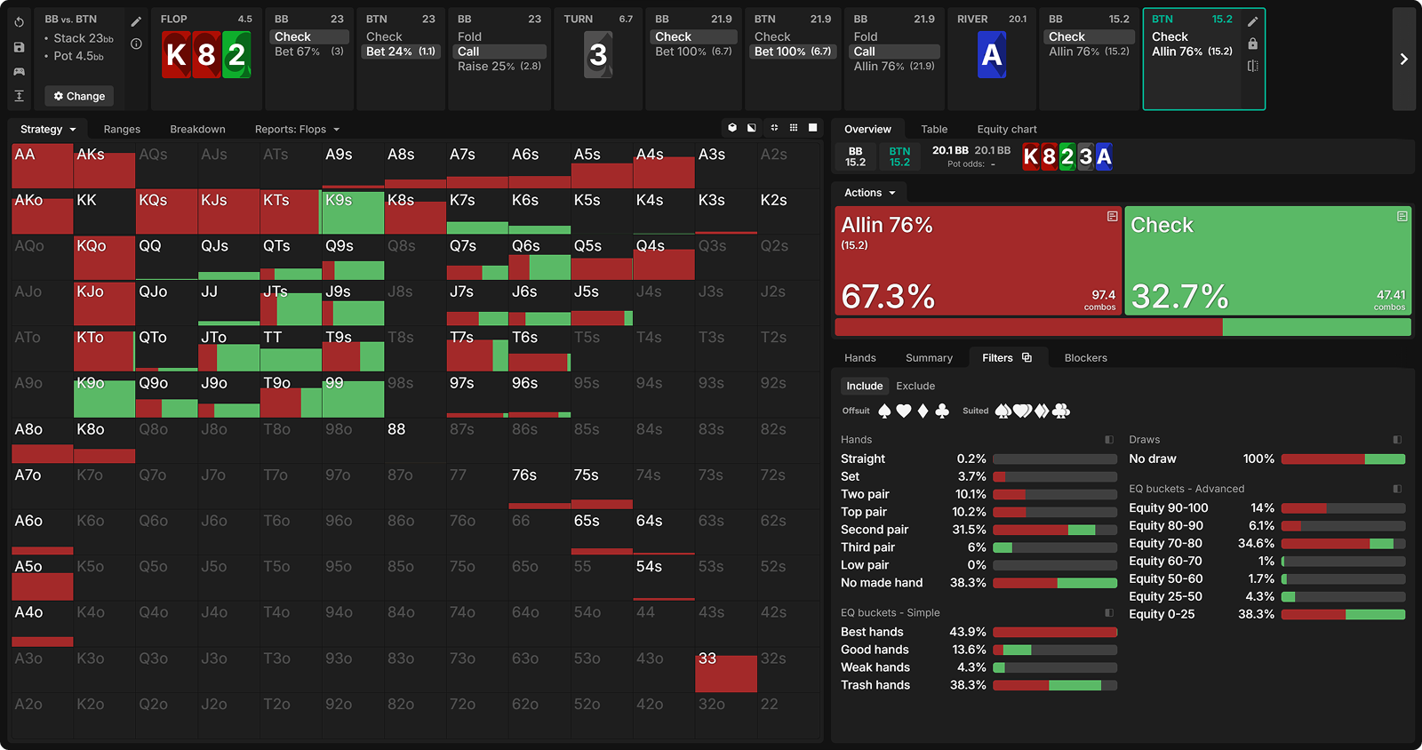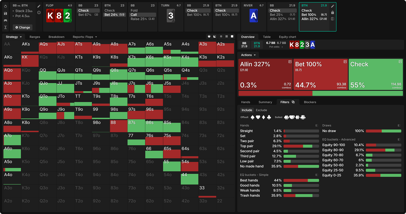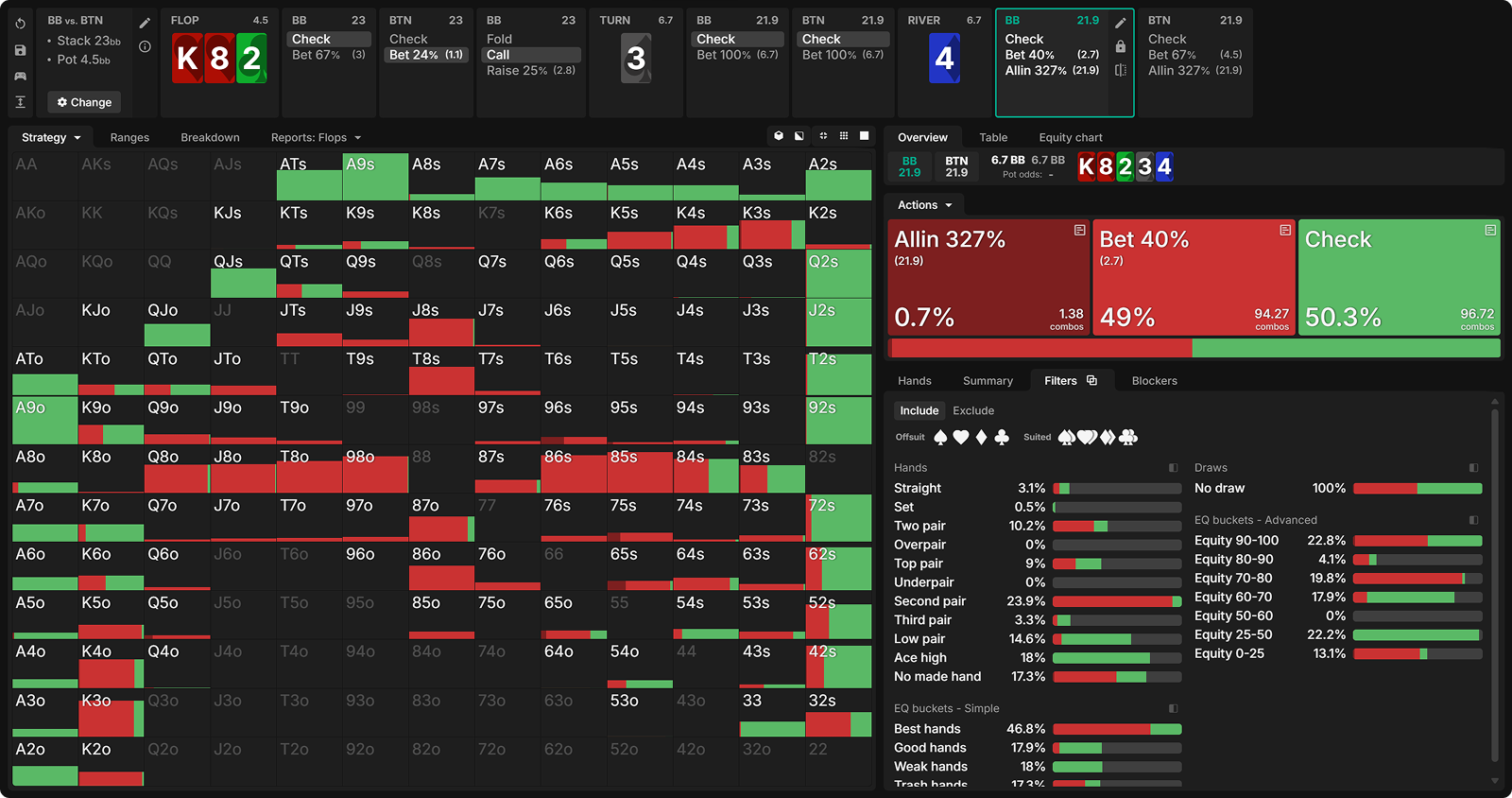 In comparison, we see that in the bet-check-bet line, the top pairs (Ace) with low kickers are not strong enough to value bet as the BB has many Ace-x or stronger to call with. This is why those hands prefer barreling the turn to fold out the better kickers. Meanwhile, our strongest suited Ace-x hands actually benefit from checking the turn, since this allows them to collect extra chips from hands that would have folded had we fired a second barrel.