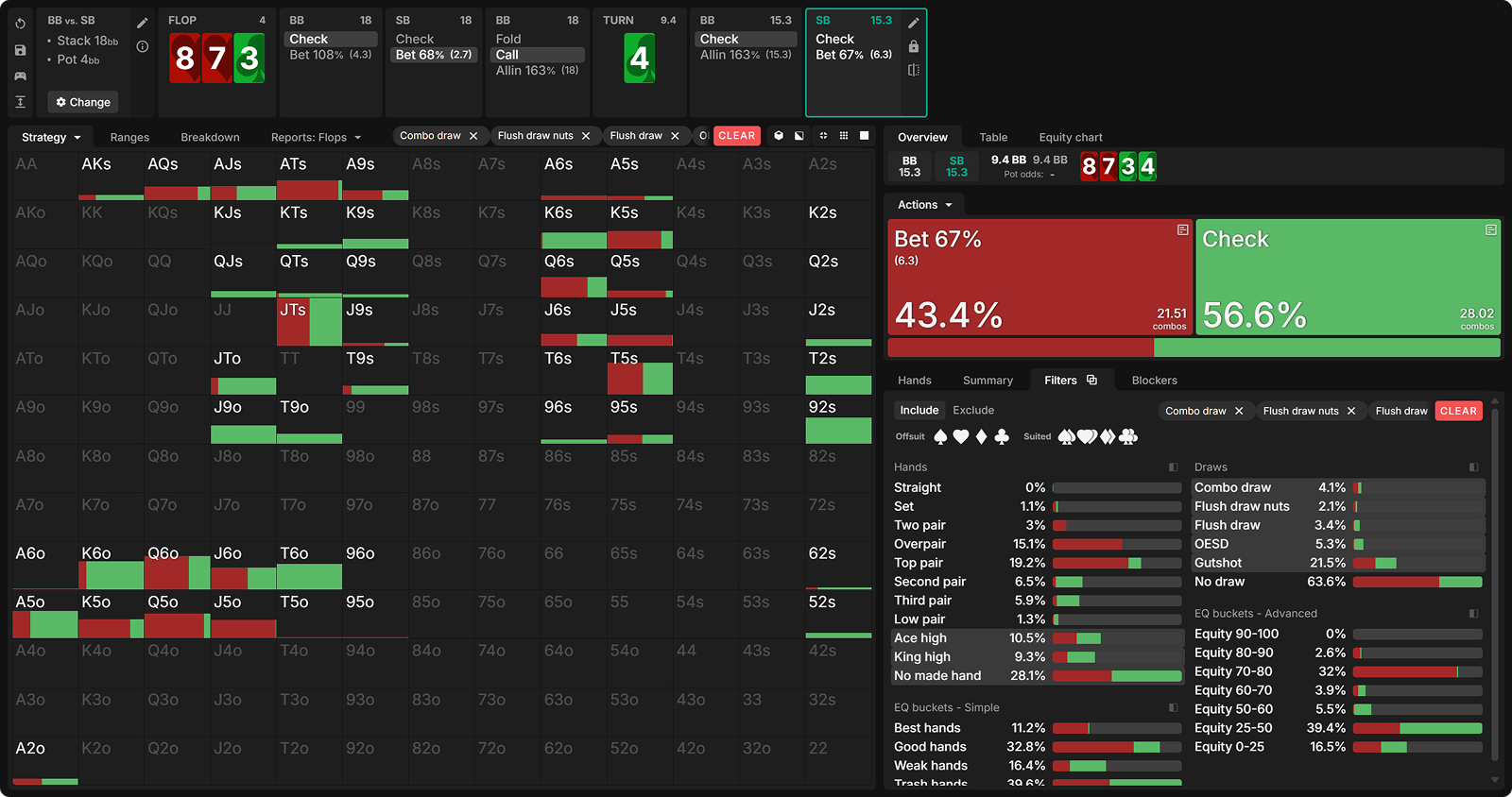 There will be players who simply barrel all their unpaired draws that they chose to c-bet on the flop. Let’s revisit our first example: 8♥7♥3♣ flop in a SB min-raised HU pot, 20bb effective.