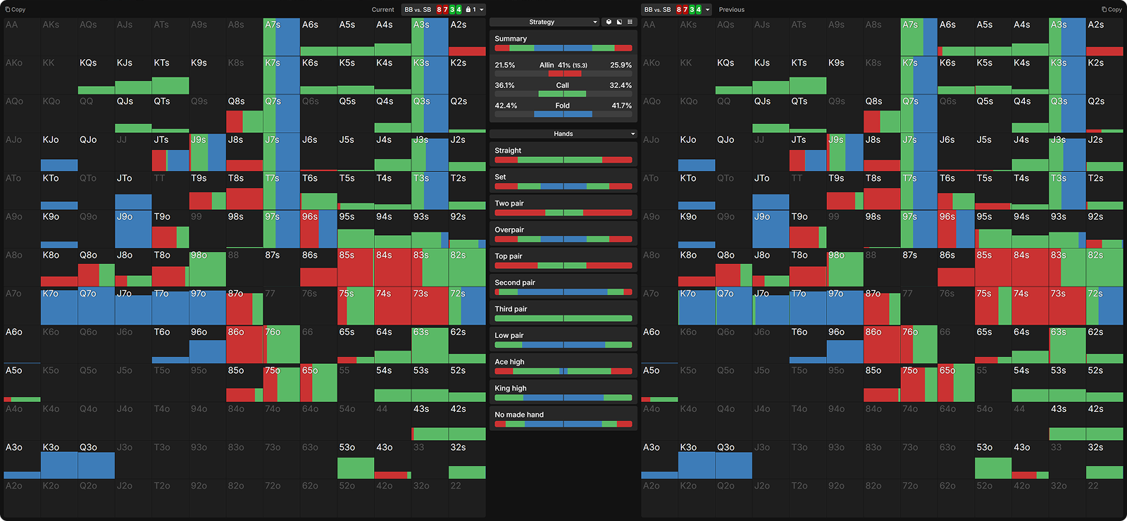 Here, barreling more draws and keeping the betting frequency the same means the SB barrel range has actually become stronger. Drawing hands have more direct equity than polarized bluffs. So the BB now cuts their worst SDV bluff-raises from before, such as T♥5♥, and now just calls them.