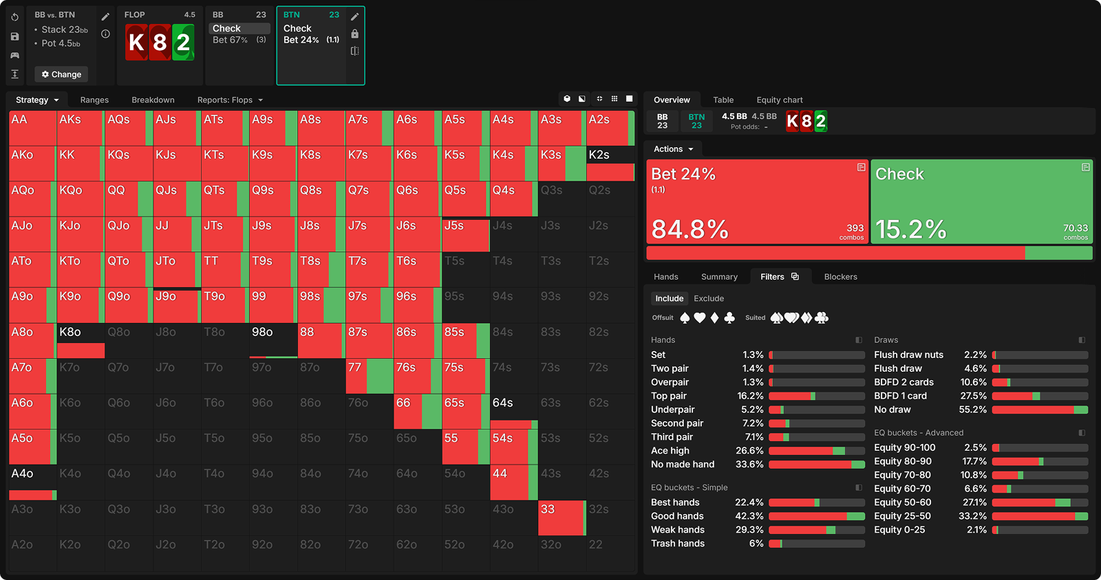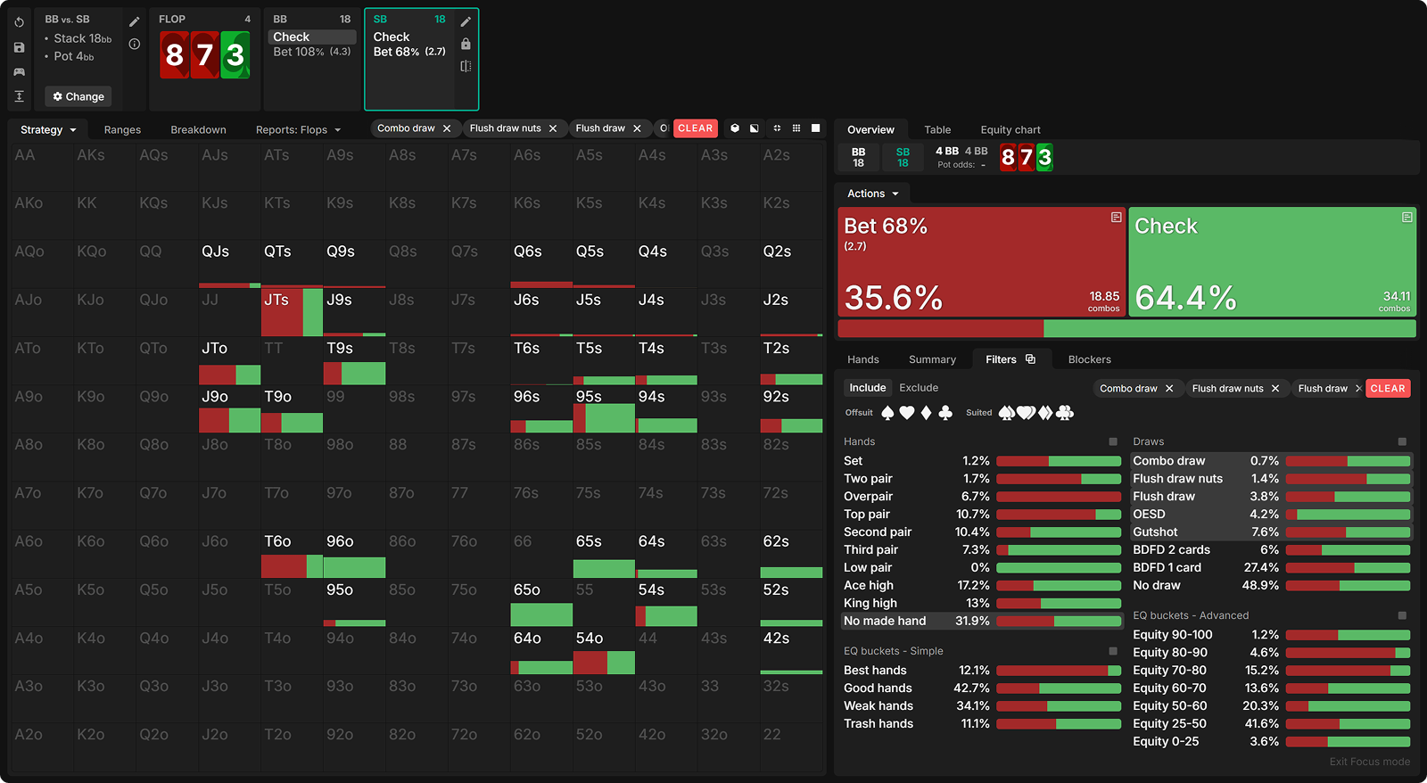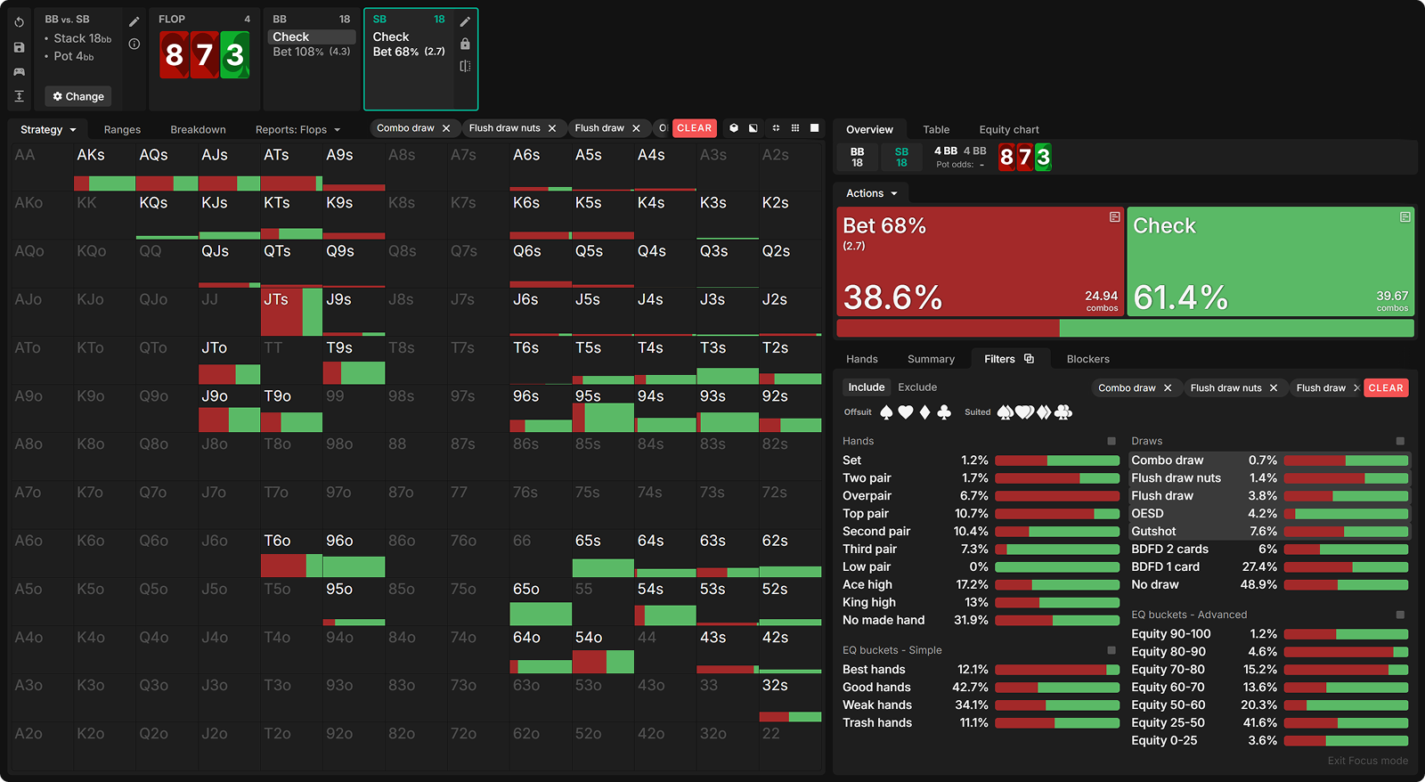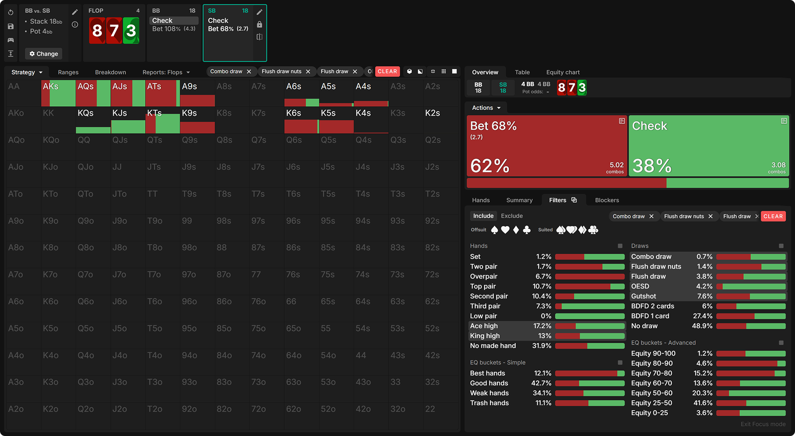 Let’s see how often draws are bet at equilibrium and dive into the why behind the solver’s decisions.