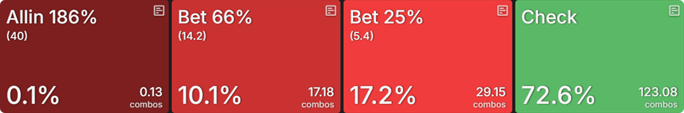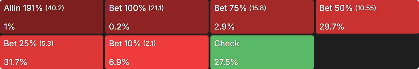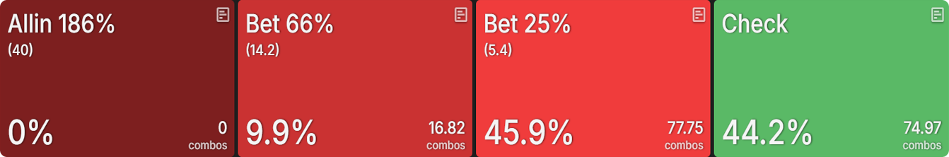 There’s only one 2-high flop, so that’s an easy one to look at to help us understand this phenomenon. In the cEV sim, BB c-bets around 27% of their range, with a weak preference for 25% pot: