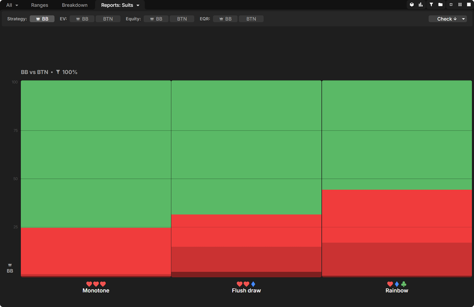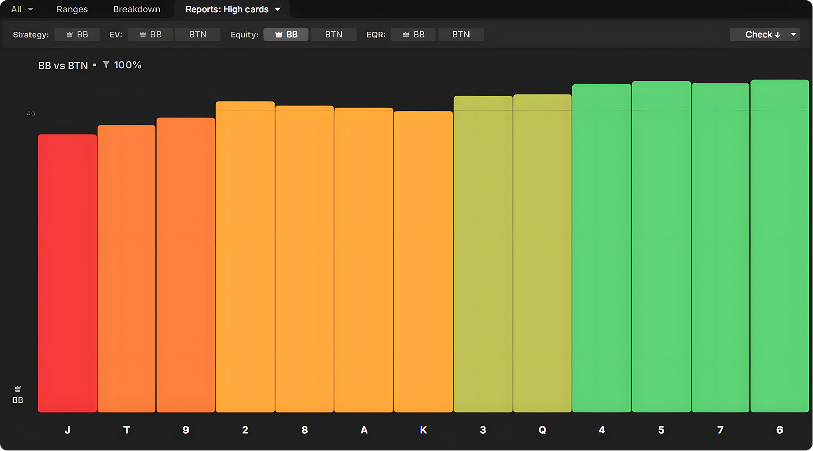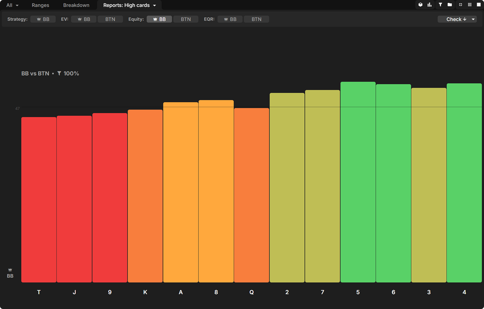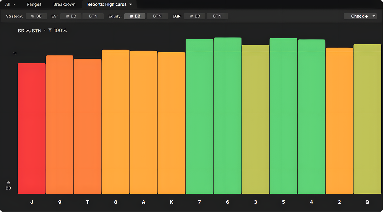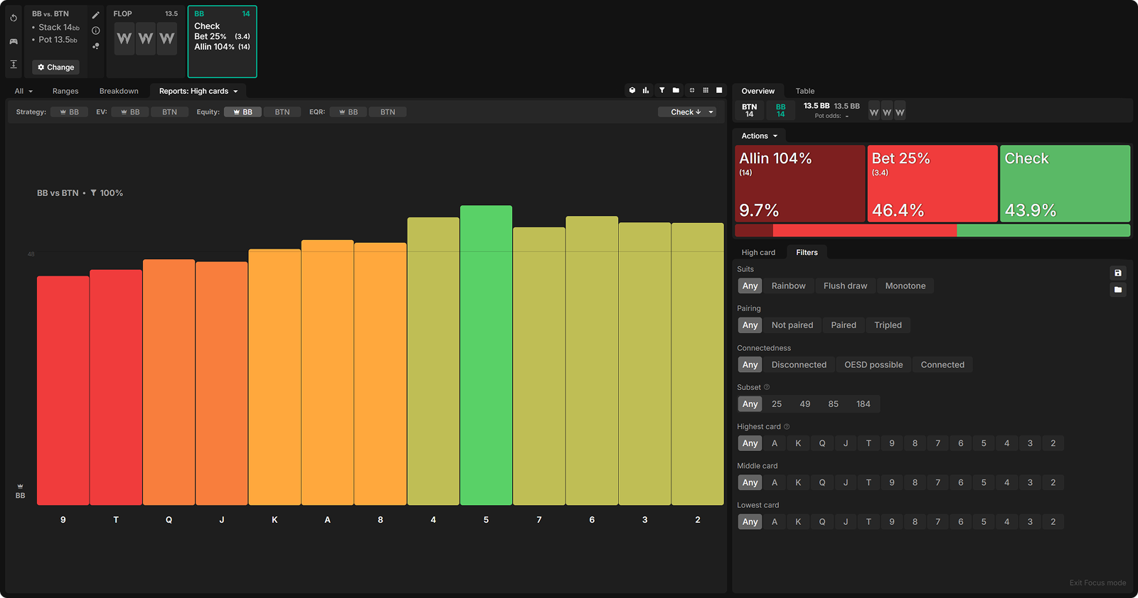 Broadway cards feature prominently in BTN’s calling range, so when BB does c-bet, they prefer to do so on the low card boards, which connect less well with this range: