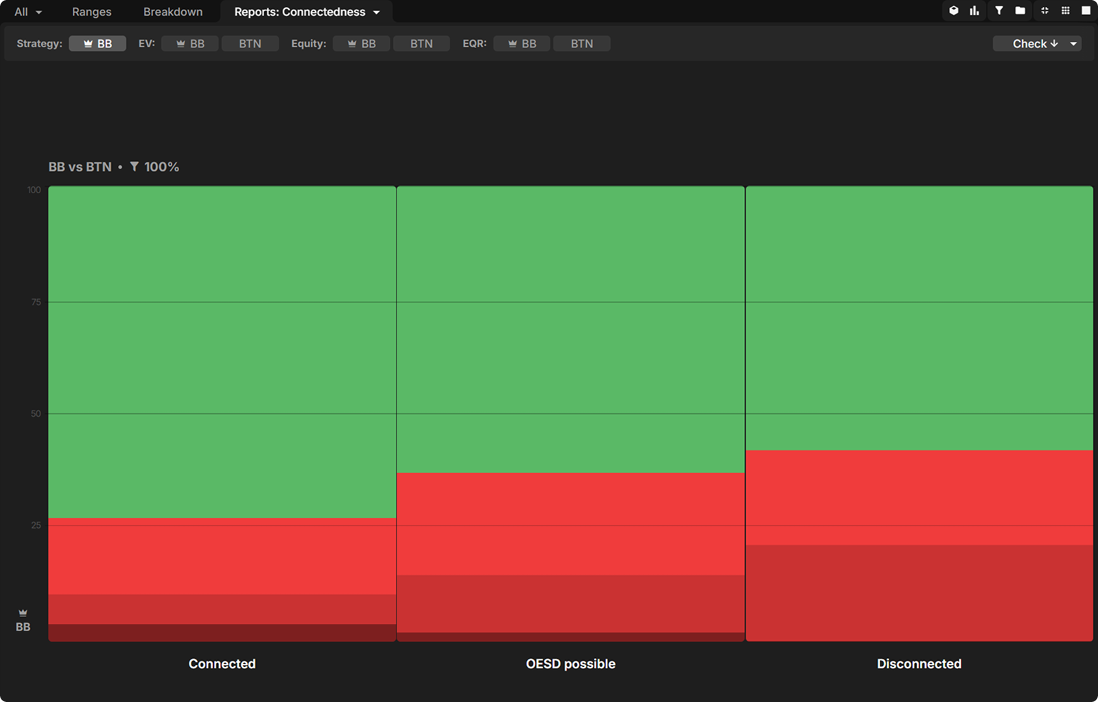 BB’s 3-betting range is highly polar, with very few hands strong enough to 3-bet for value. Their bluff 3-bets are almost exclusively disconnected offsuit hands with a good blocker but poor postflop playability.