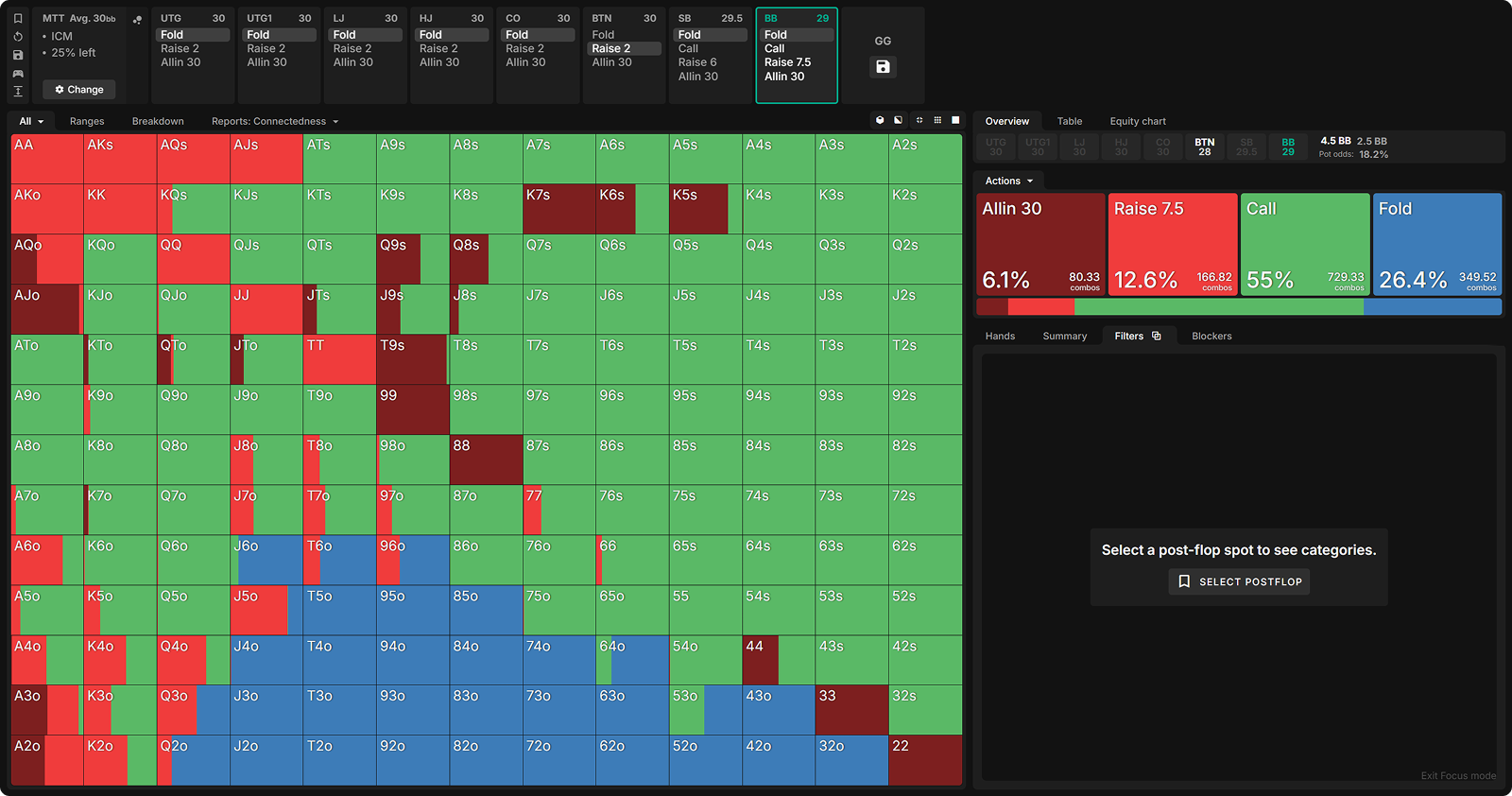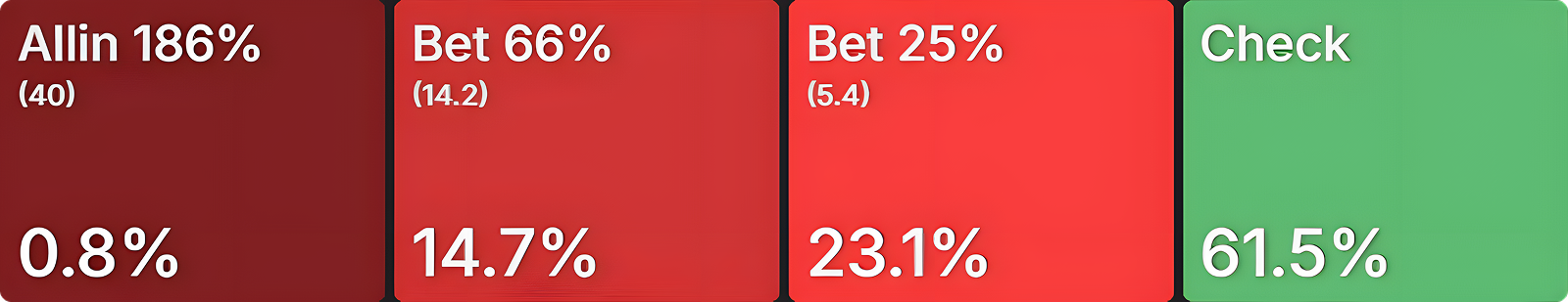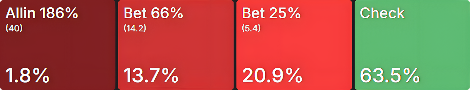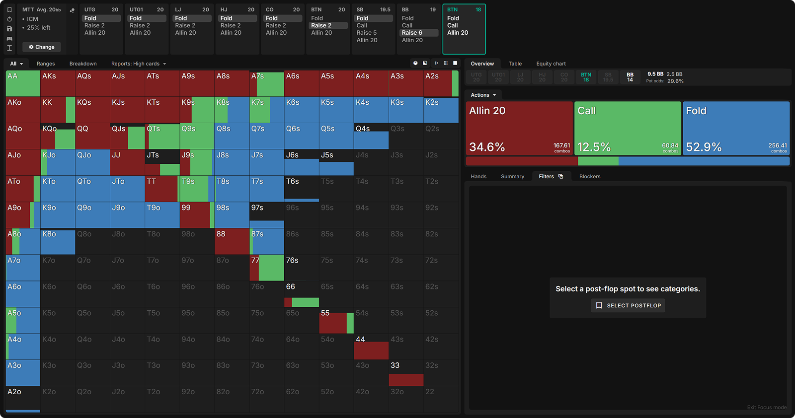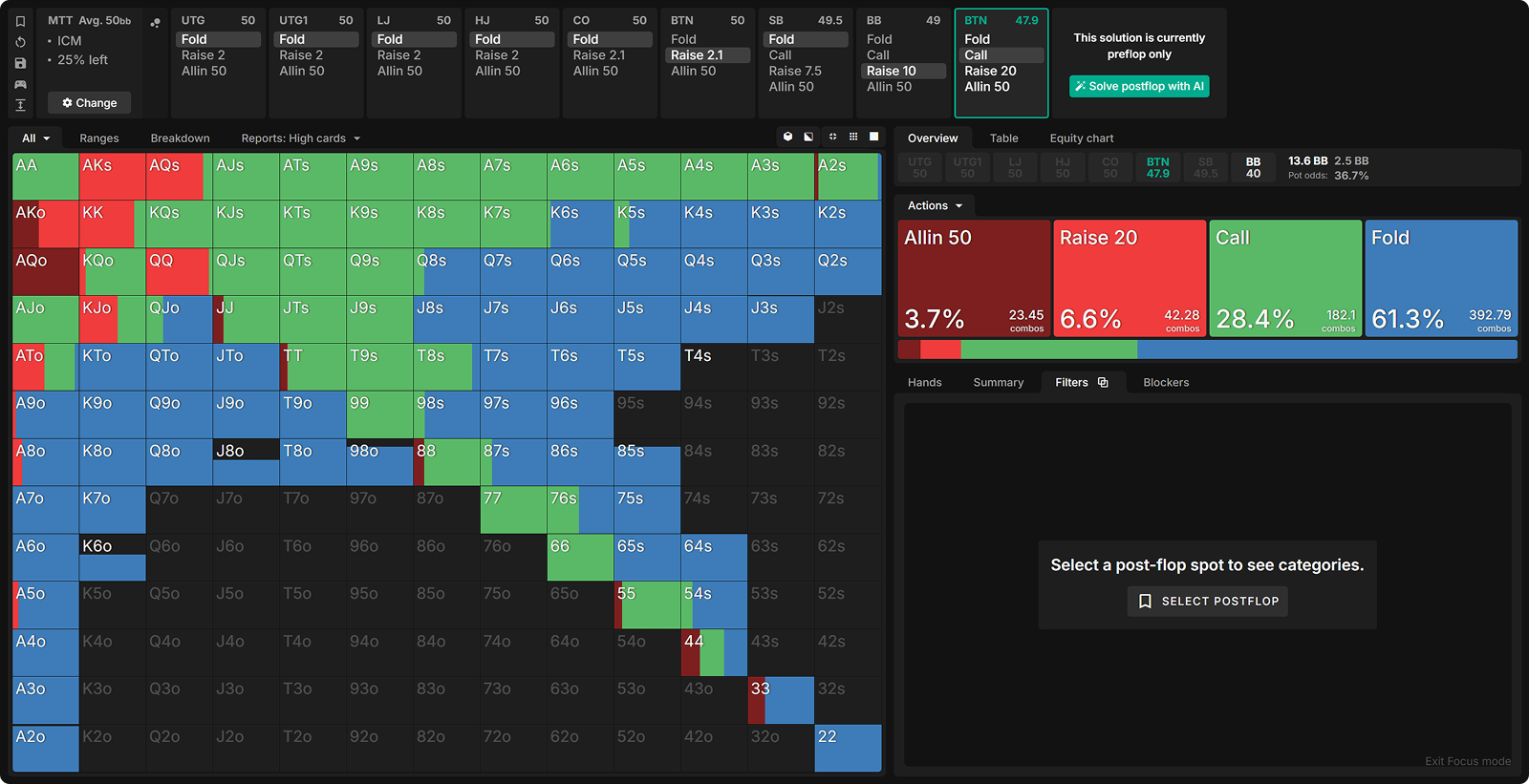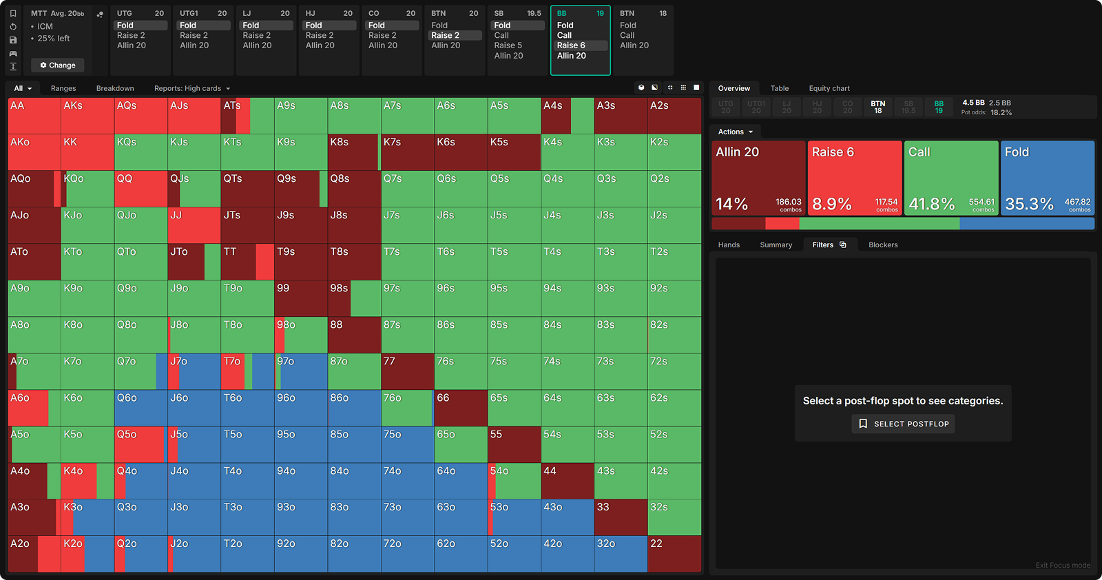 This suggests that exact preflop ranges matter more for our postflop strategy than risk premia itself. In other words, once players see the flop with these ranges, BB’s c-bet strategy is largely unaffected by ICM considerations.