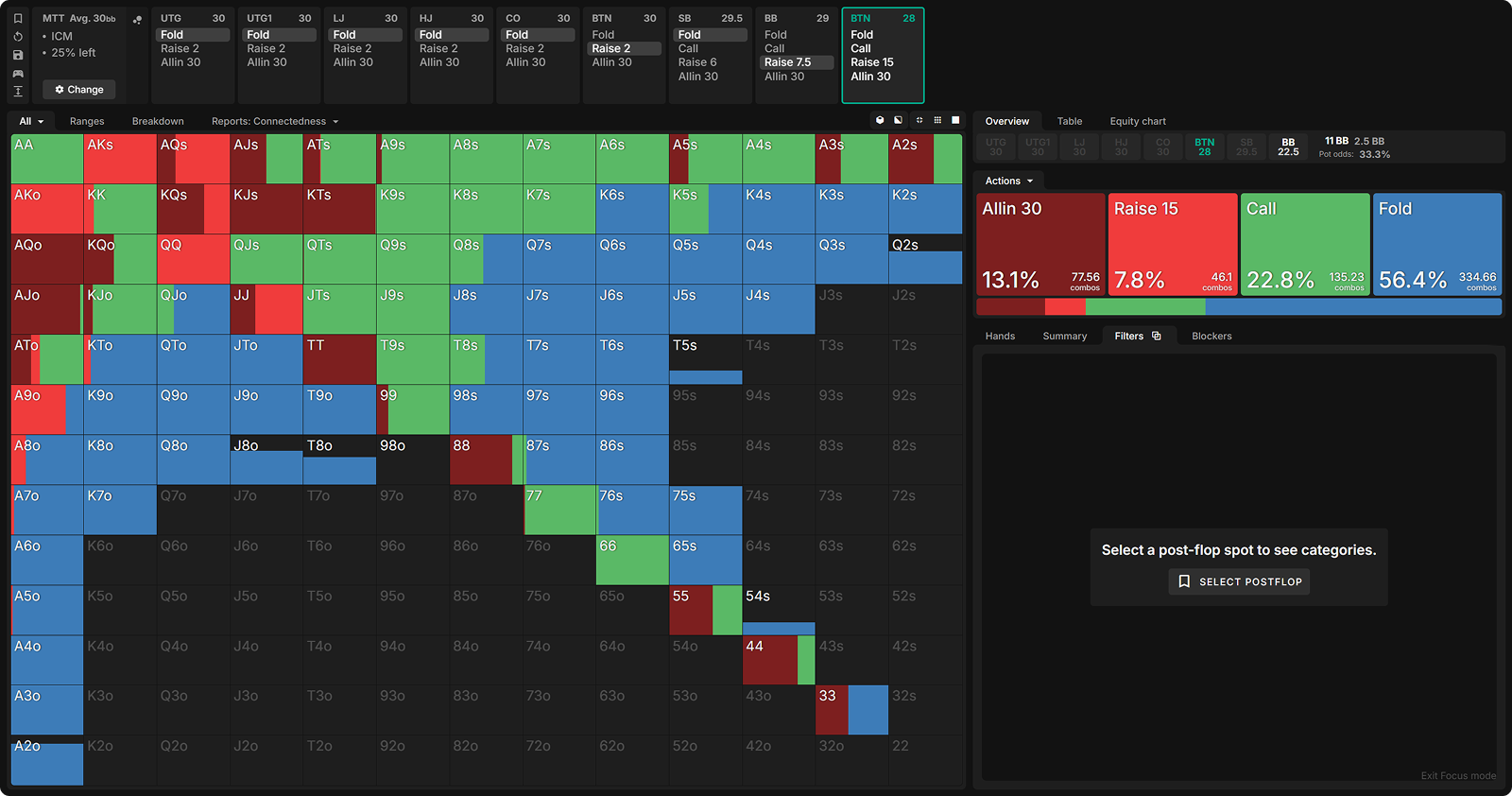 Even after you manage to find the not-so-intuitive bluff 3-bets preflop, however, there remains the question of how to proceed postflop. Unlike in other high-ICM configurations, the original raiser will more often call BB 3-bets, because they will benefit from playing in position (IP) after the flop.