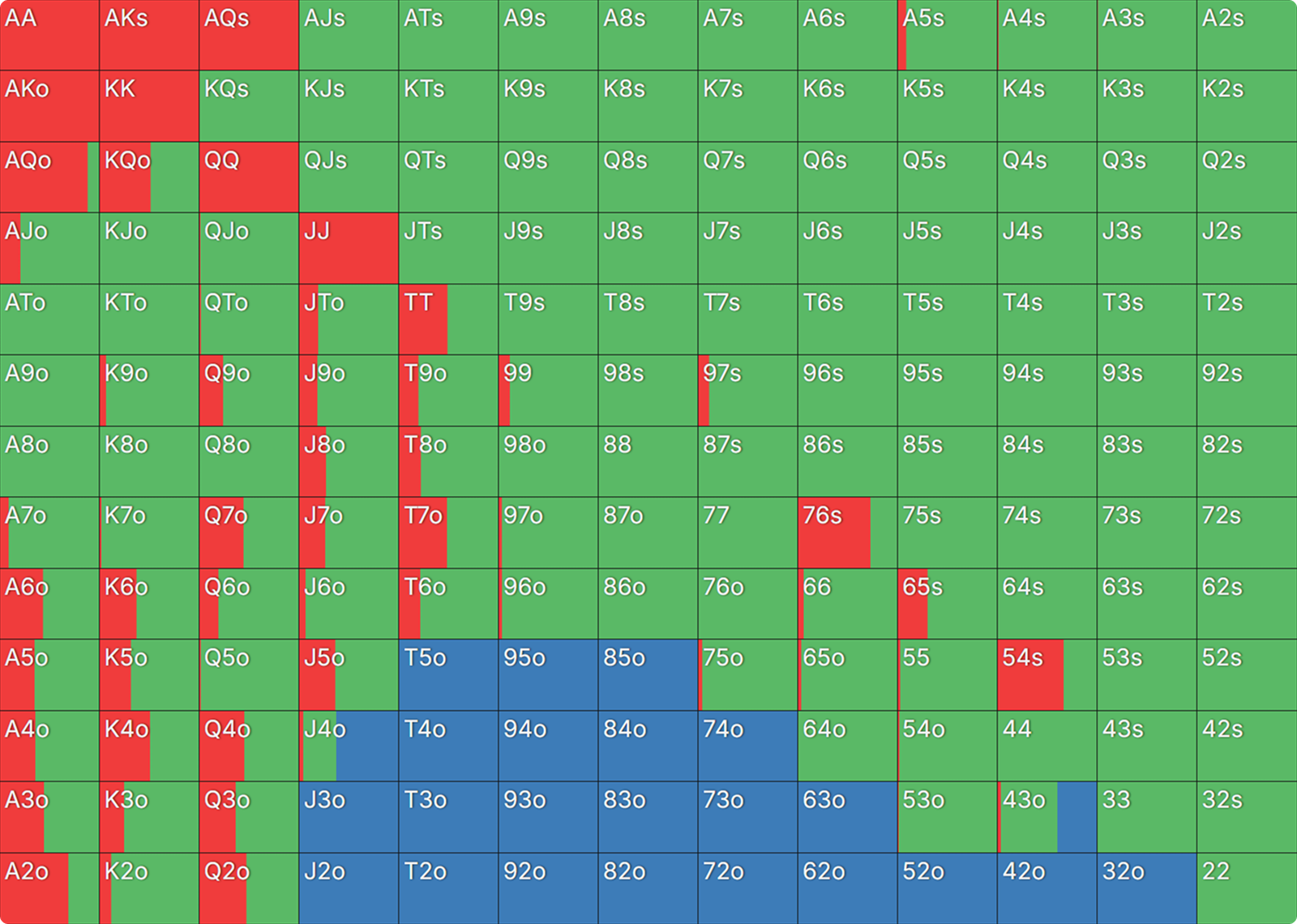 - Jamming over a BB 3-bet has become a more viable option for BTN than with 50bb, and calling is less appealing with less room to exercise their positional advantage postflop. A 3-bet often results in either a shove or a fold from BTN, making the cards BB chooses for their bluff 3-bets (the ones that won’t call a shove) largely irrelevant, except for their blocking properties. Thus, they’d prefer to use their worst hands for this purpose than waste a decent hand that could be profitably played as a call.