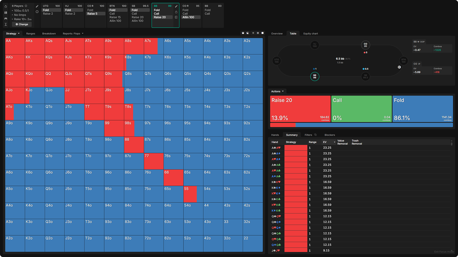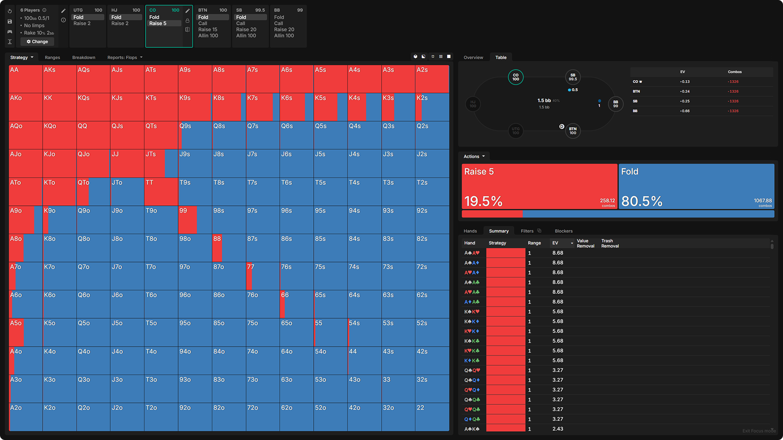 - Chip EV and Raked Solving – Match the rake structure of your games and see how it reshapes optimal strategies.