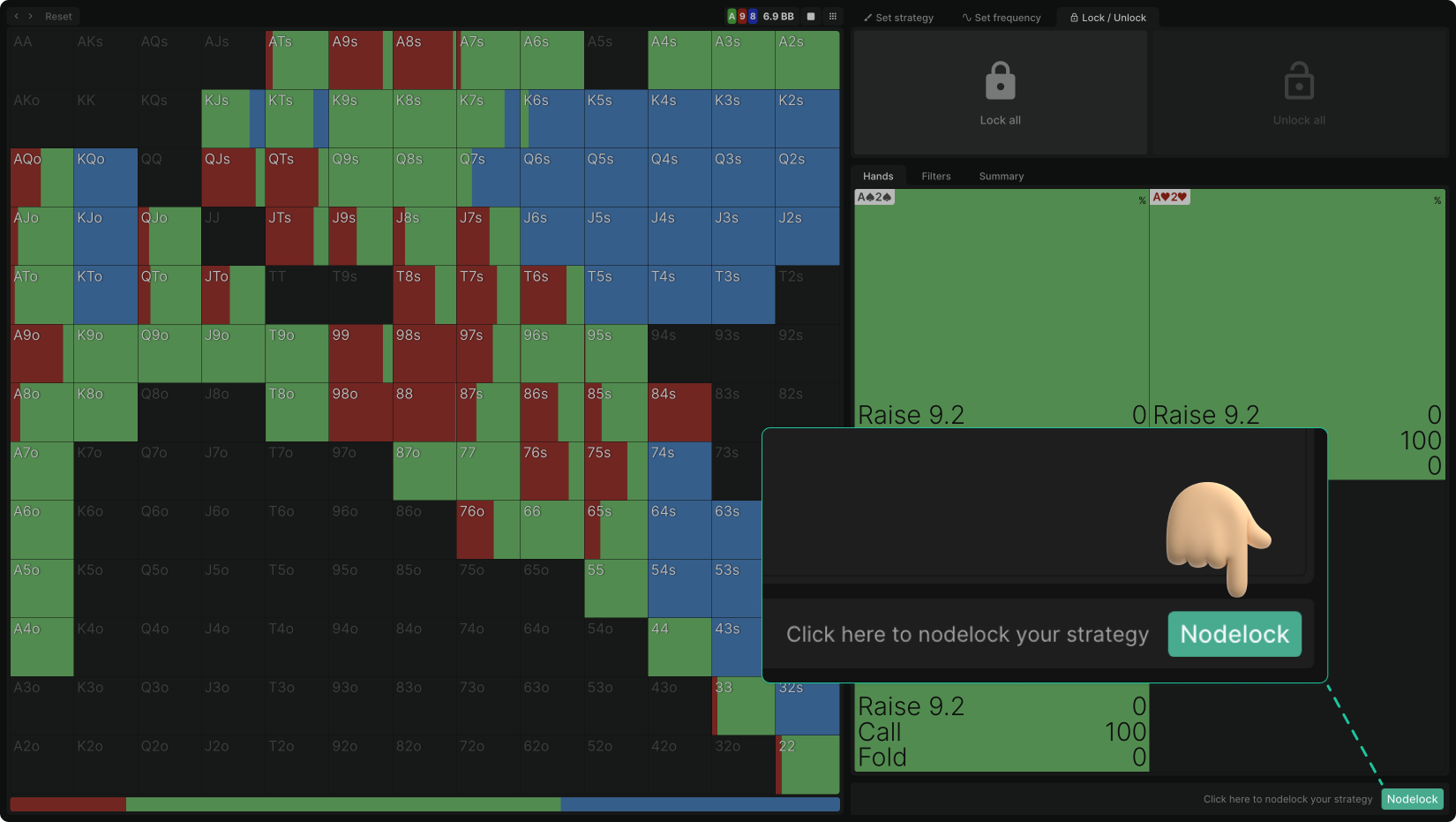 - Lock All – Locks your entire range. Locked hands retain their current strategy.