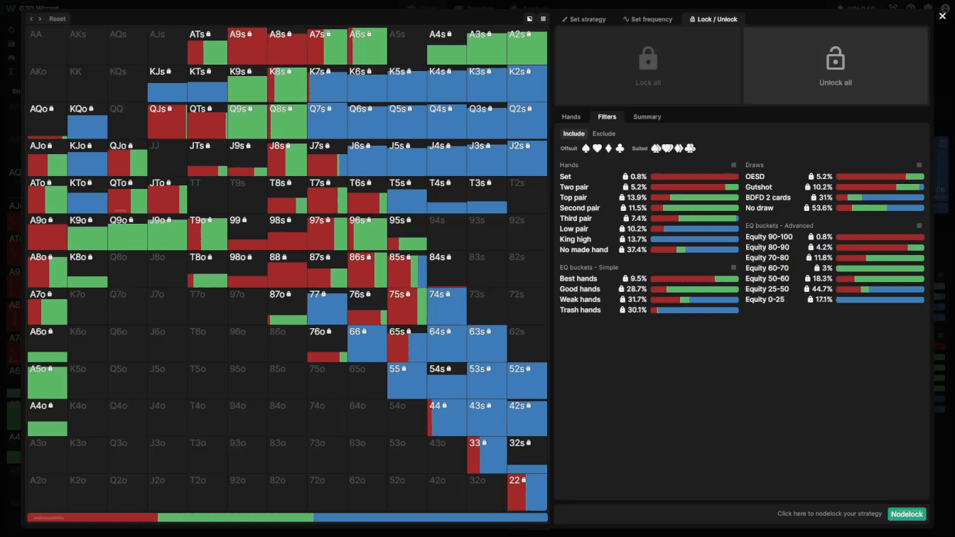 Once you’re done, select Nodelock in the bottom-right corner, and apply your strategy! GTO Wizard AI will automatically adapt to exploit the nodelocked strategy in seconds! Any unlocked hands within the nodelock will adapt to minimize EV losses, while locked hands are forced to play as you’ve defined.