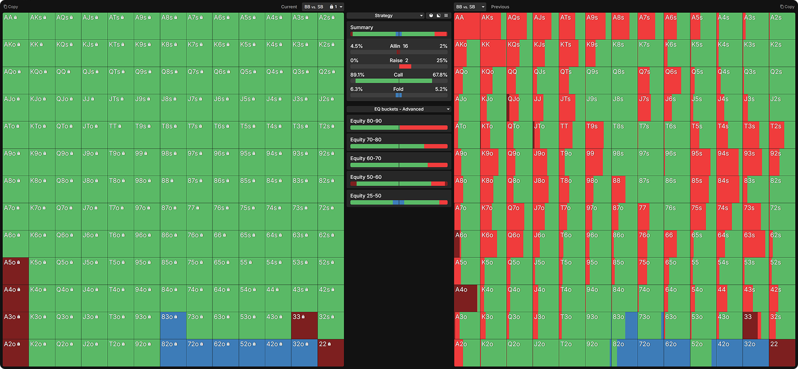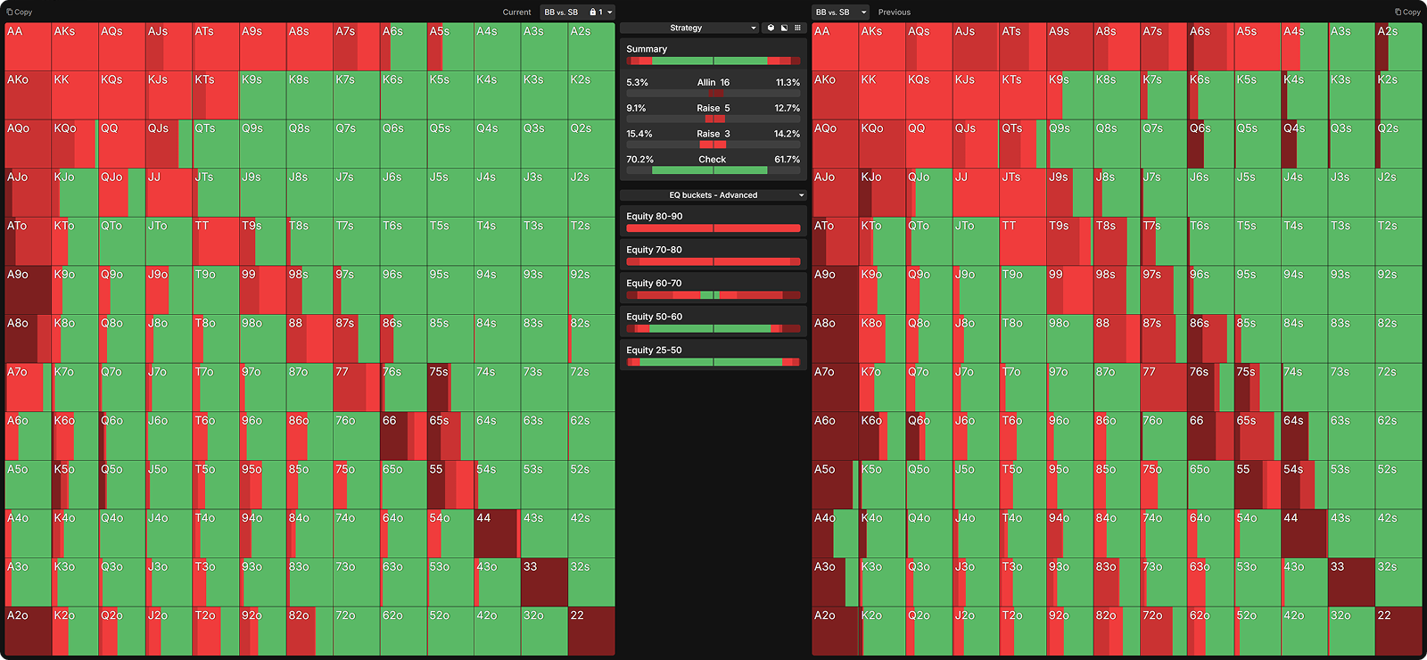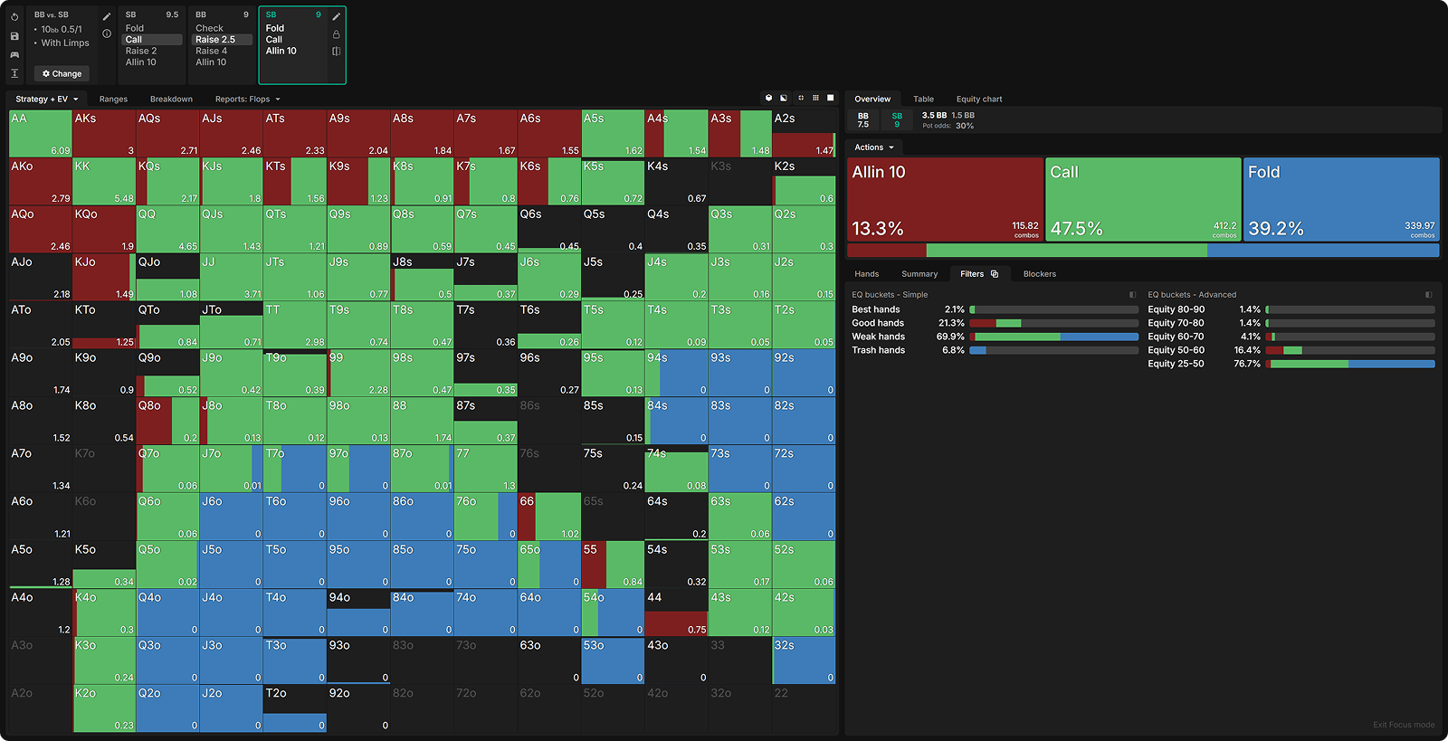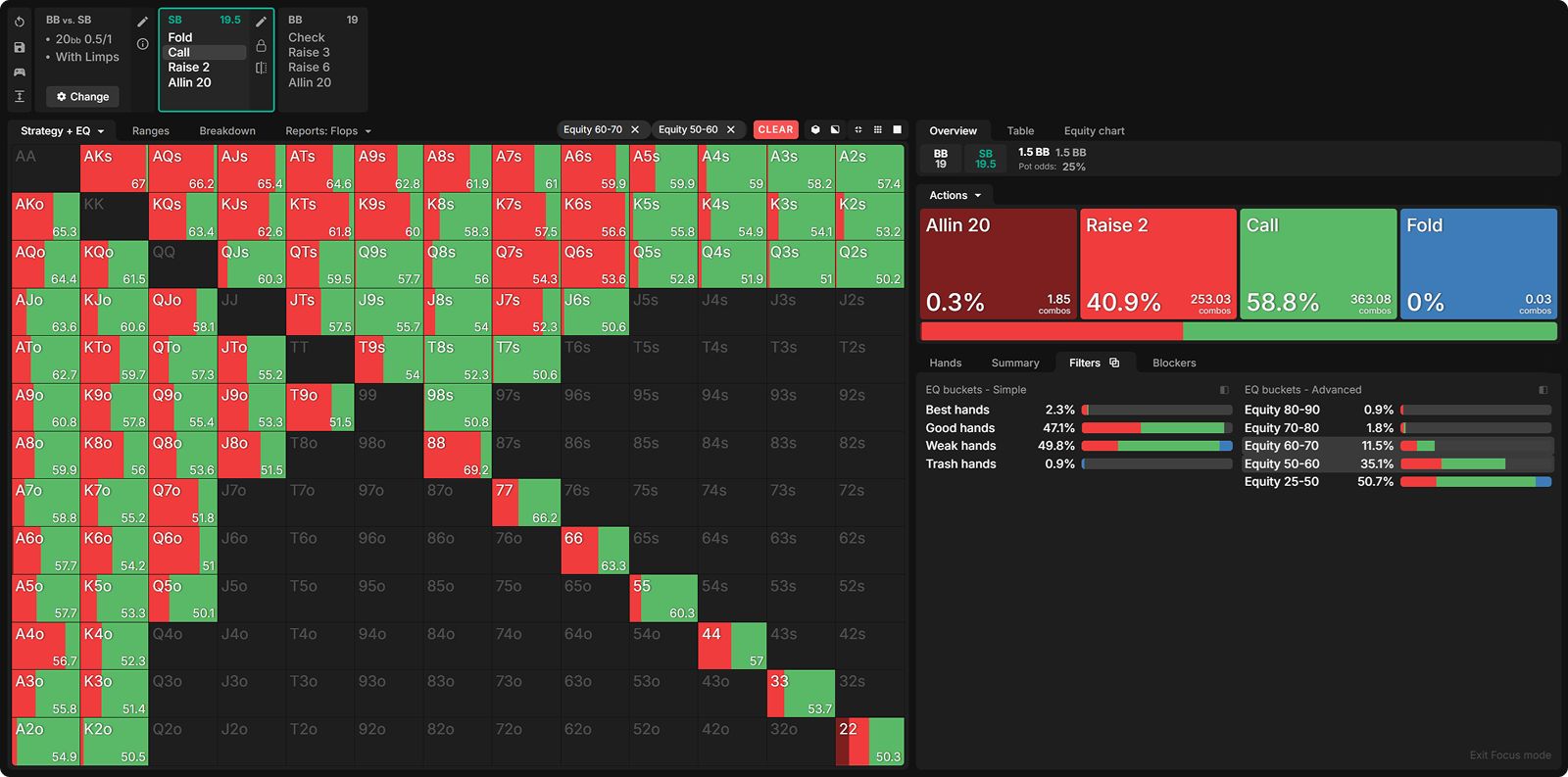 Many opponents mistakenly raise too many of their strong hands preflop. Below, I have nodelocked the SB to raise all hands with 60%+ equity.
