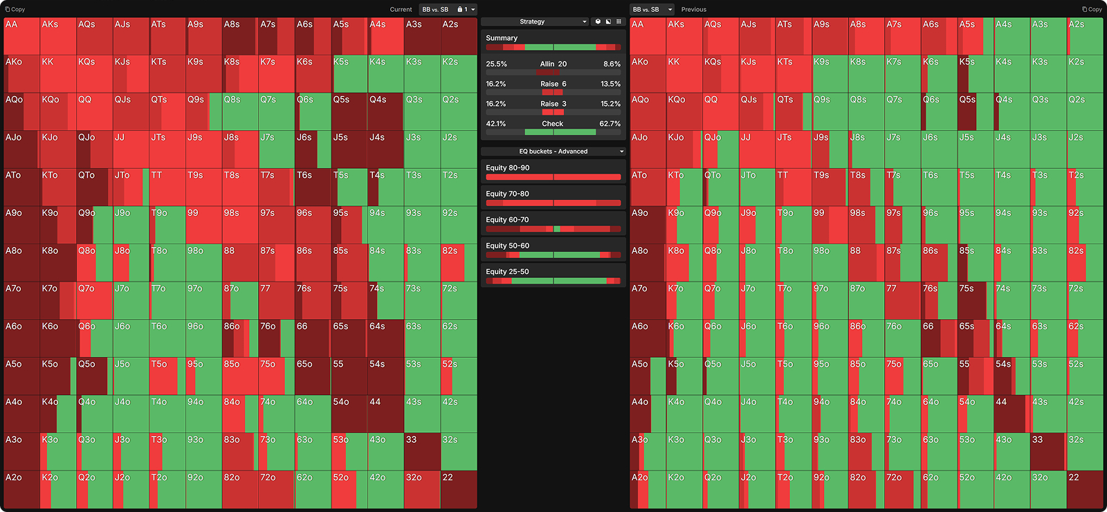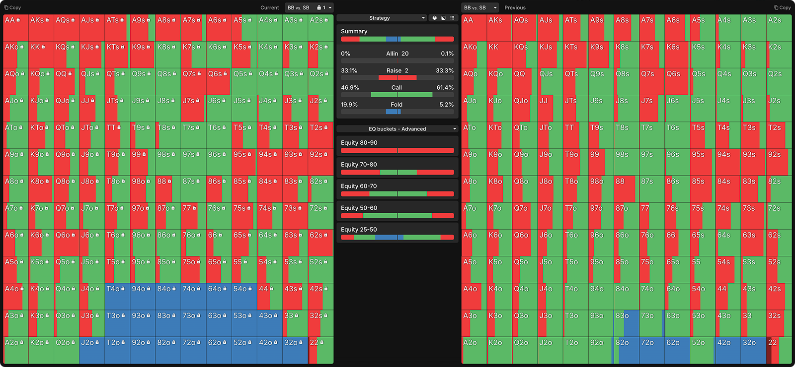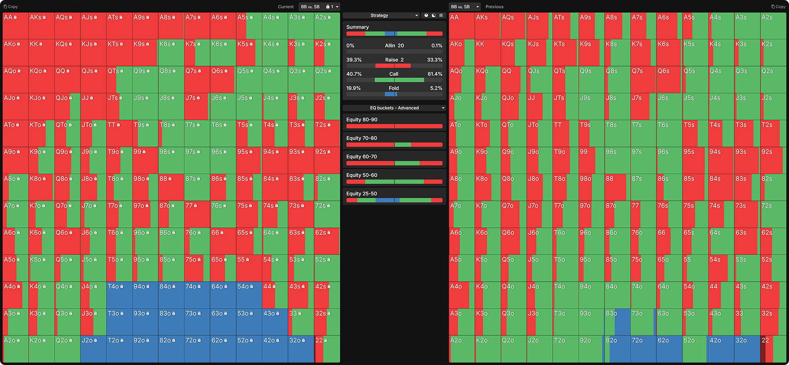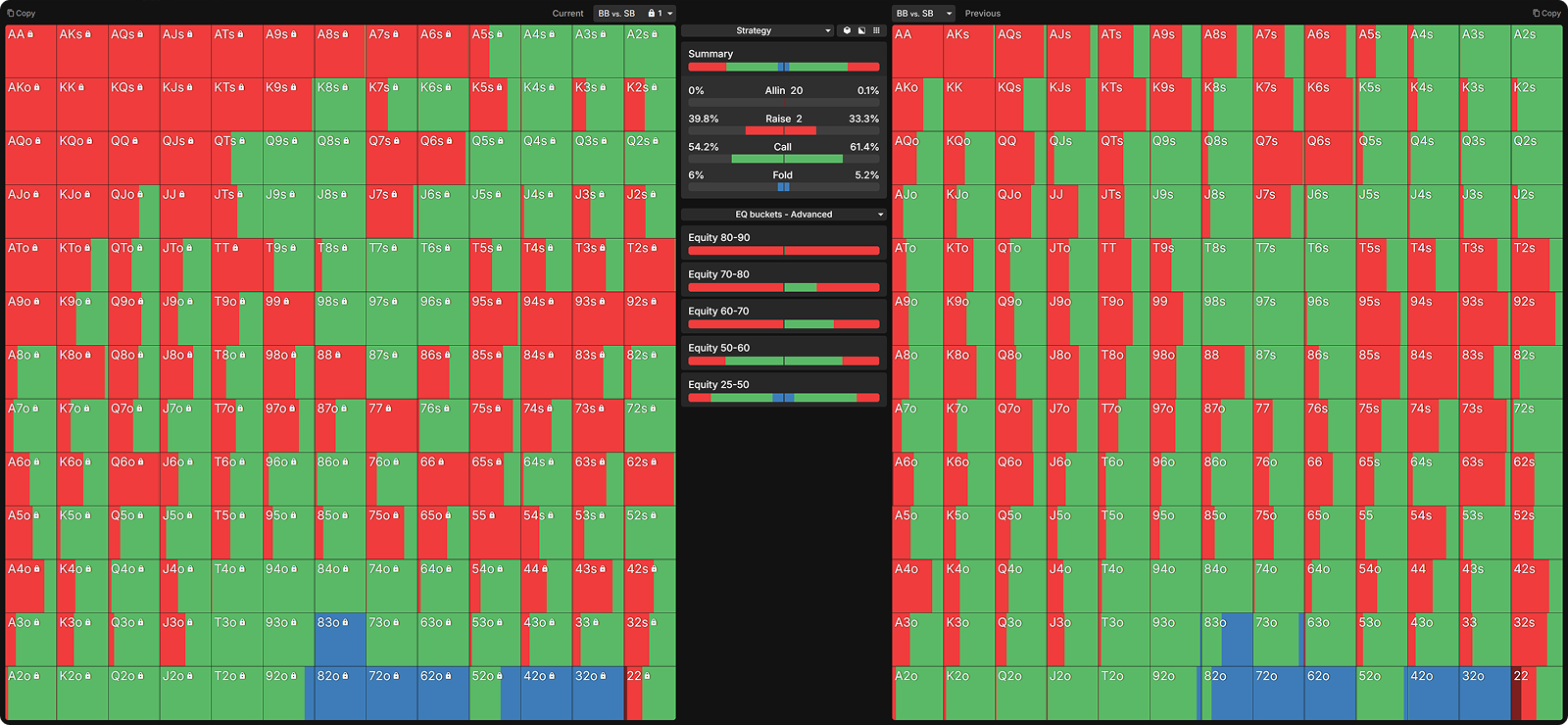Many opponents mistakenly raise too many of their strong hands preflop. Below, I have nodelocked the SB to raise all hands with 60%+ equity.