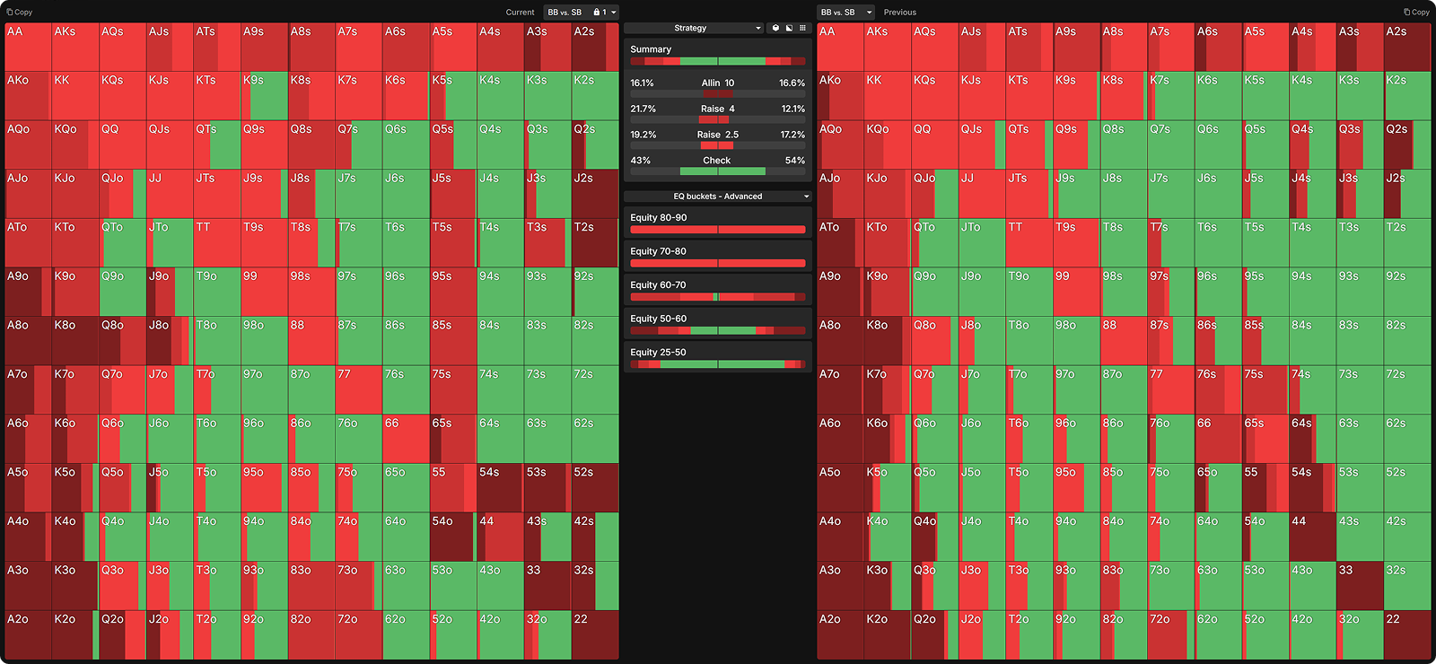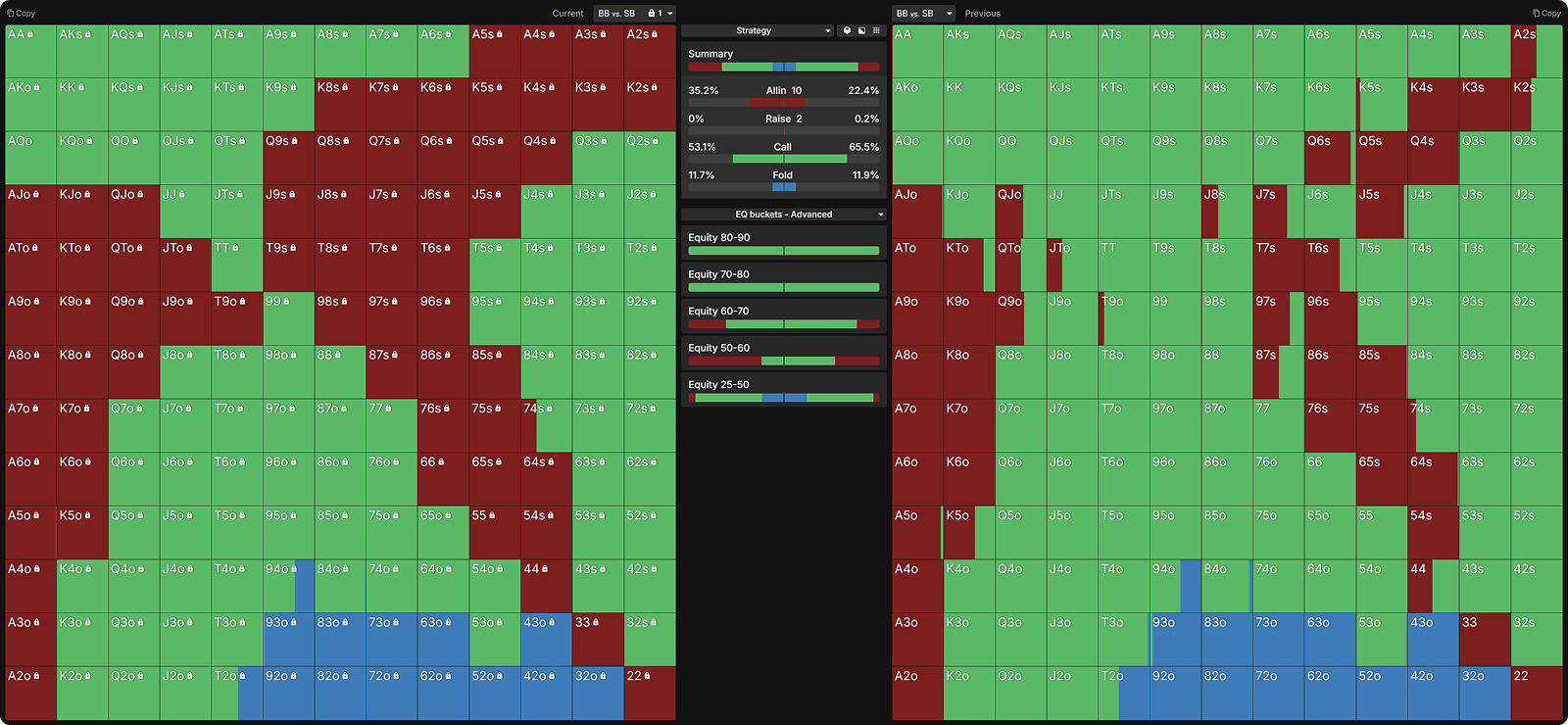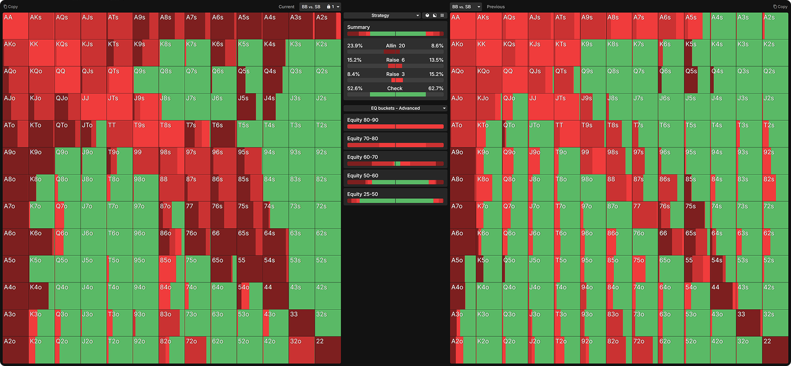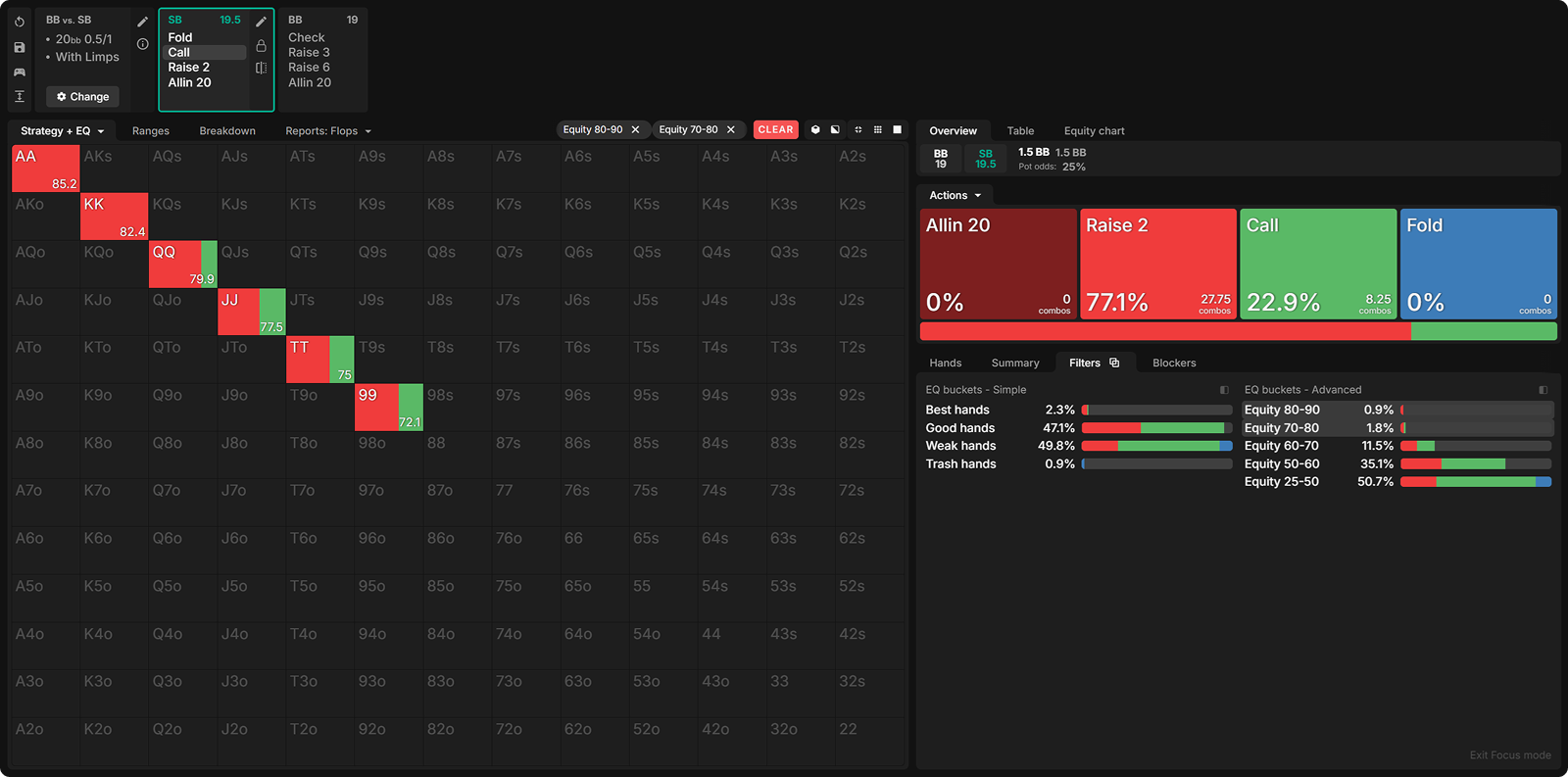 Many opponents mistakenly raise too many of their strong hands preflop. Below, I have nodelocked the SB to raise all hands with 60%+ equity.