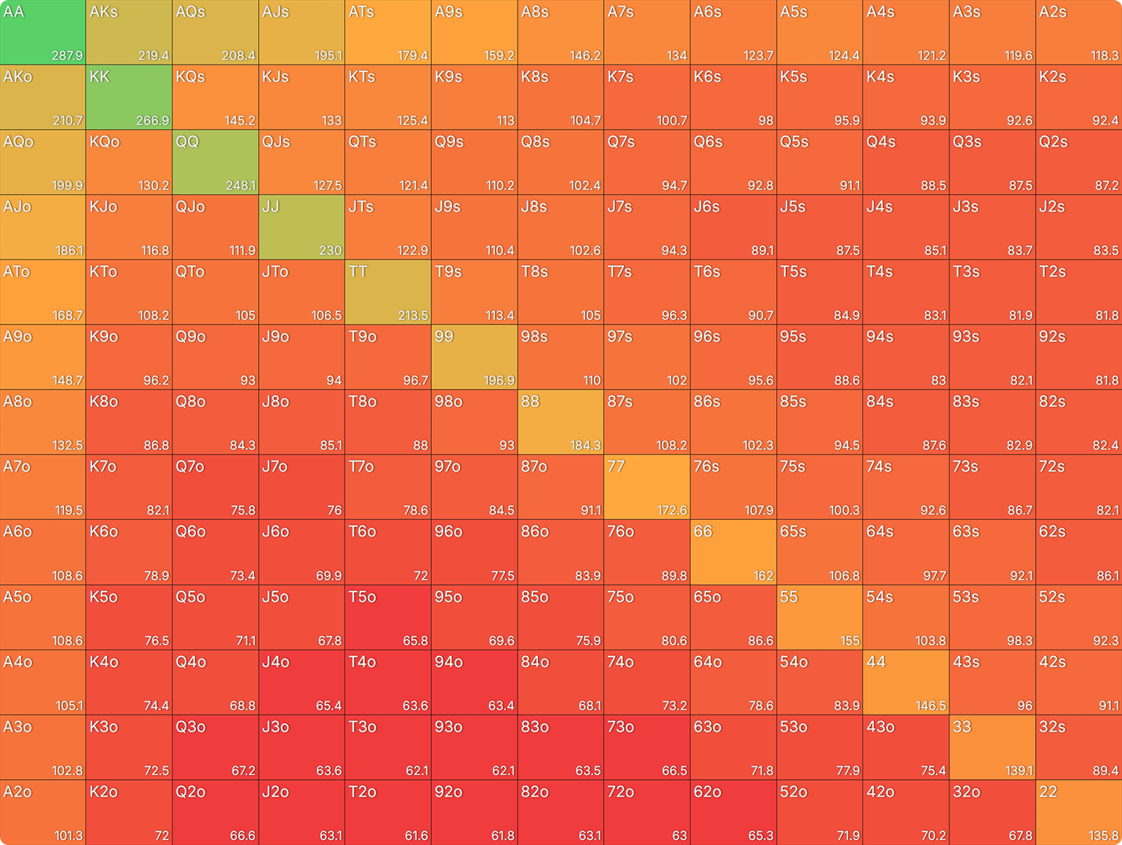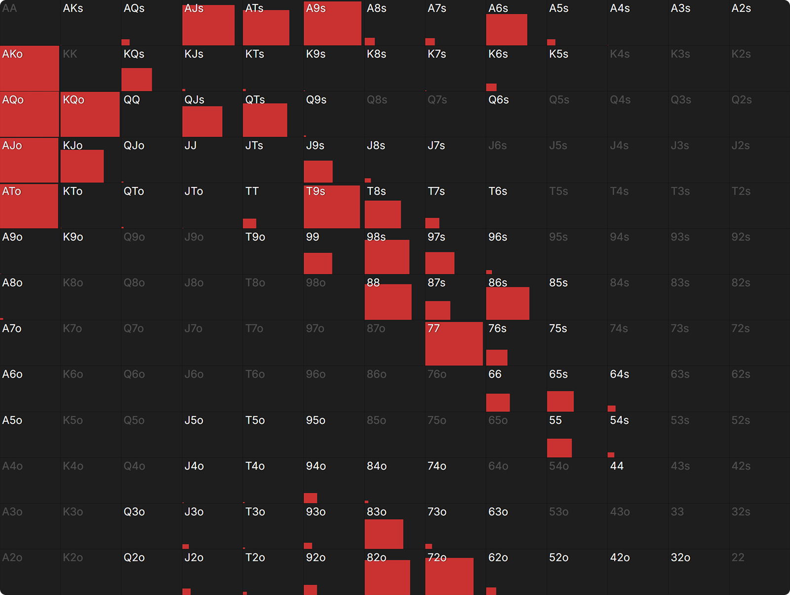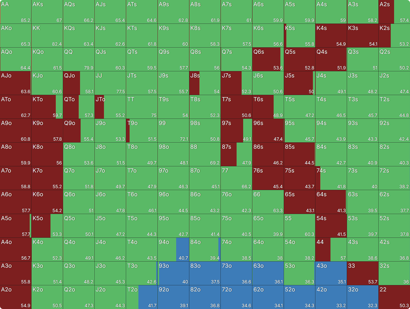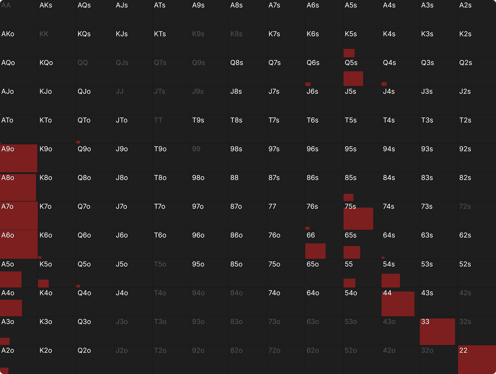 First, using the AI heads-up preflop solver, let’s study the unexploitable range at 20bb HU for the SB, to set the SB baseline.