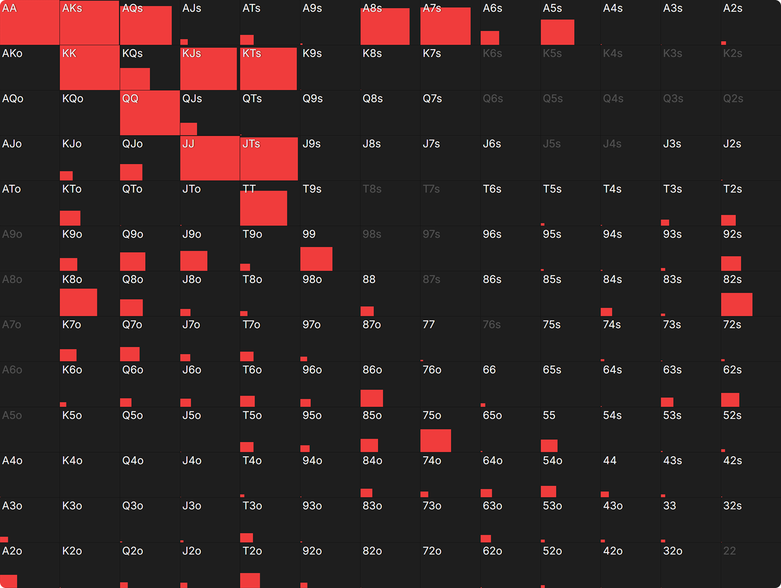 Due to the better risk-reward ratio, we can now use large isolation raises and all-in isolation raises at a higher frequency. The range composition of all-in raises starts to shift towards high-card hands and away from suited connectors.