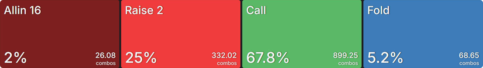A common thing to see from regular spin players is a no-min-raise strategy from the SB at an effective stack depth of 16bb or less. In the graphic below, you can view how the AI solver models the SB’s strategy when min-raising is not an option.