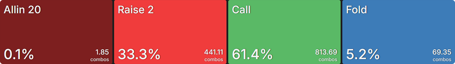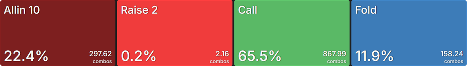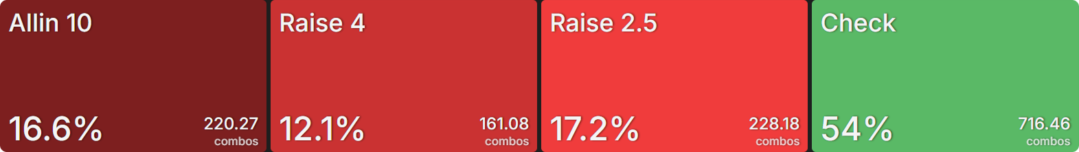 The only preflop raise size the SB baseline strategy used was all-in. This is not the reality we will face when playing recreational players. In fact, data suggests that at 10bb we can expect, on average, to see: ~33% limp, 20% all-in, 17% raise non-all-in.