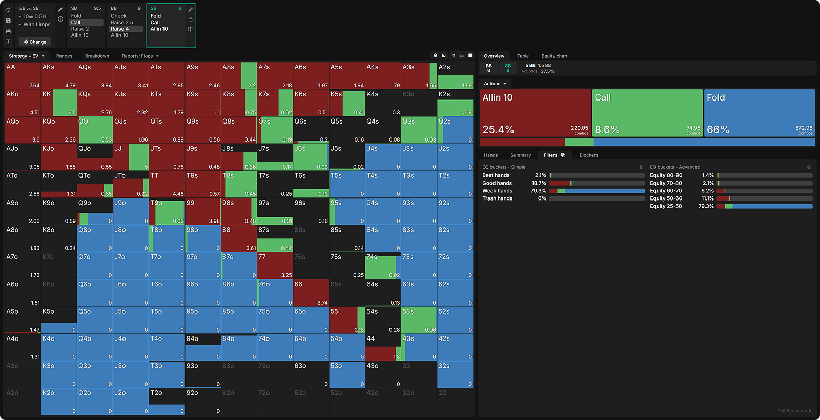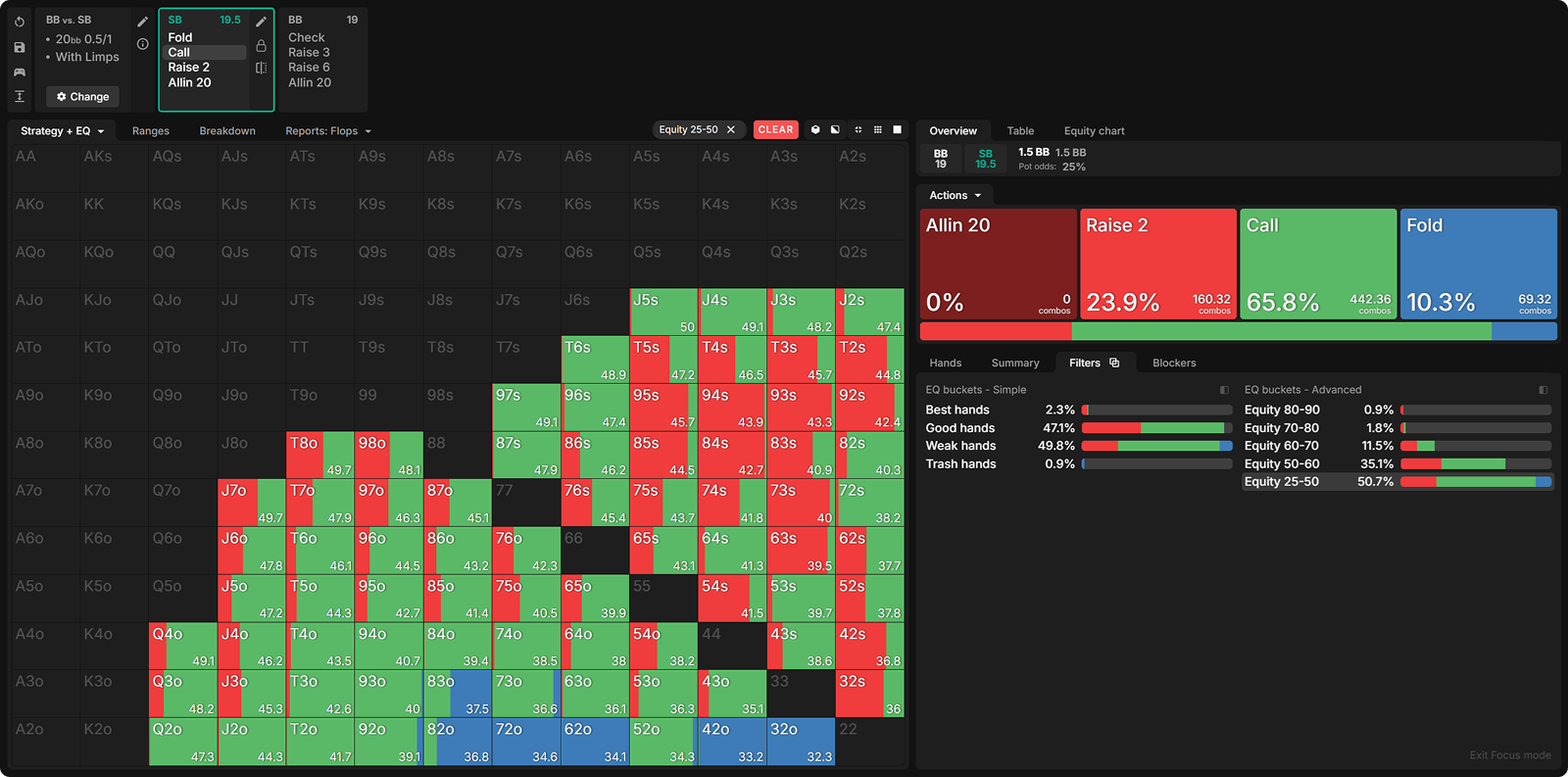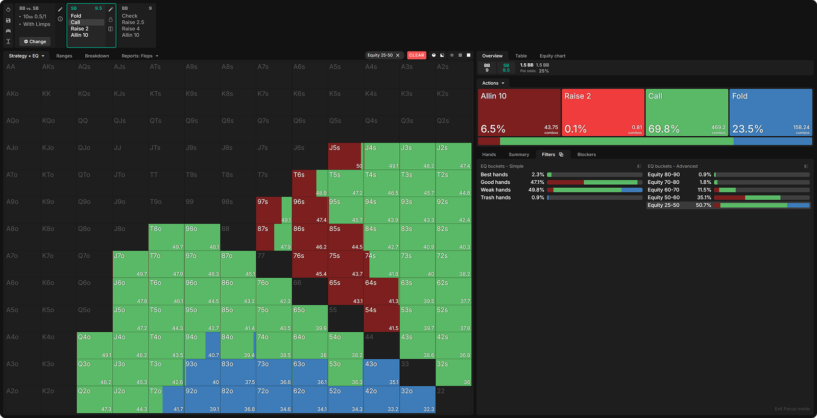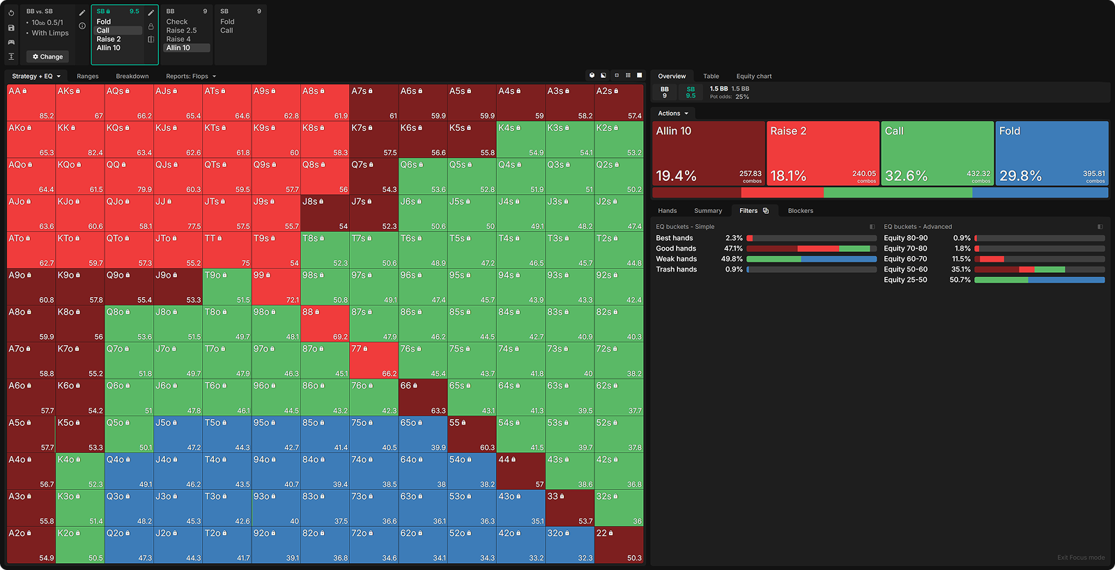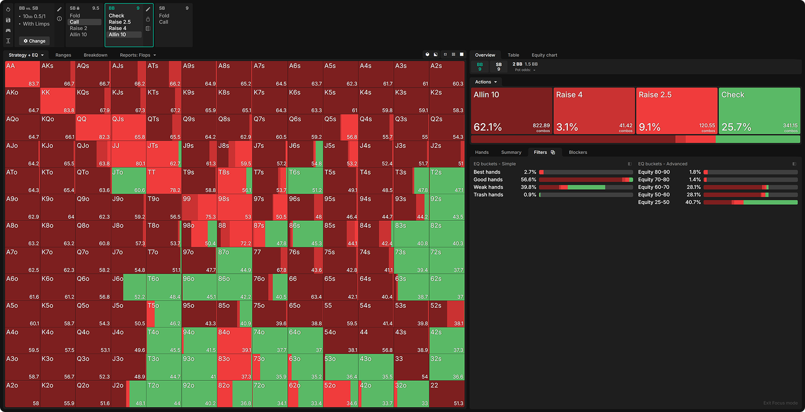 By raising all hands with 60%+ equity, the SB has significantly weakened its limping range. Let’s look at how the BB exploits this deviation.