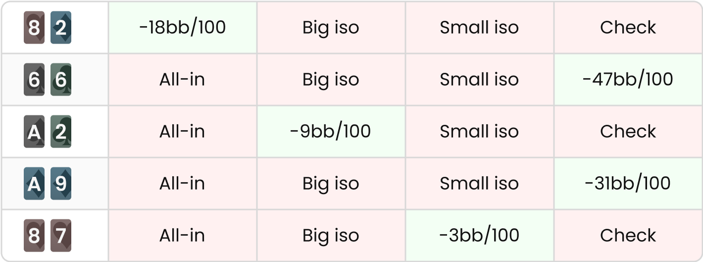 The BB exploit to the SB deviation is to reduce their overall iso frequency, which reflects the recognition that the SB strengthened its limping range by removing its weakest hands. Now, if you pay close attention, you’ll notice that it’s the small iso sizing frequency that decreases the most. This is a logical consequence since the small size targets the weaker parts of the SB range (which has significantly diminished, resulting in the reduction of VPIP).