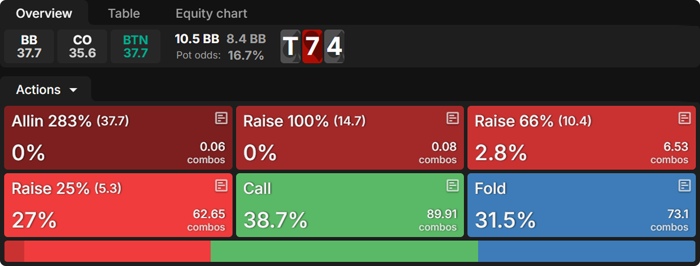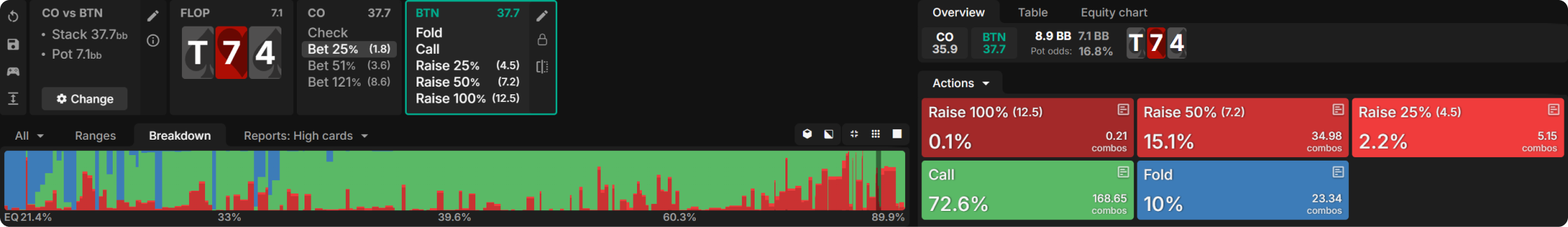 In order to put the 3-way strategy into context, we will look first at how BTN responds to a ¼ pot c-bet from CO in a heads-up pot on T♠7♥4♠. BTN plays ~10% folds, ~73% calls, and ~17% raises, heavily favoring the half-pot pot raise size. Their raising range is fairly polarized, as is appropriate when using a larger size and being last to act: