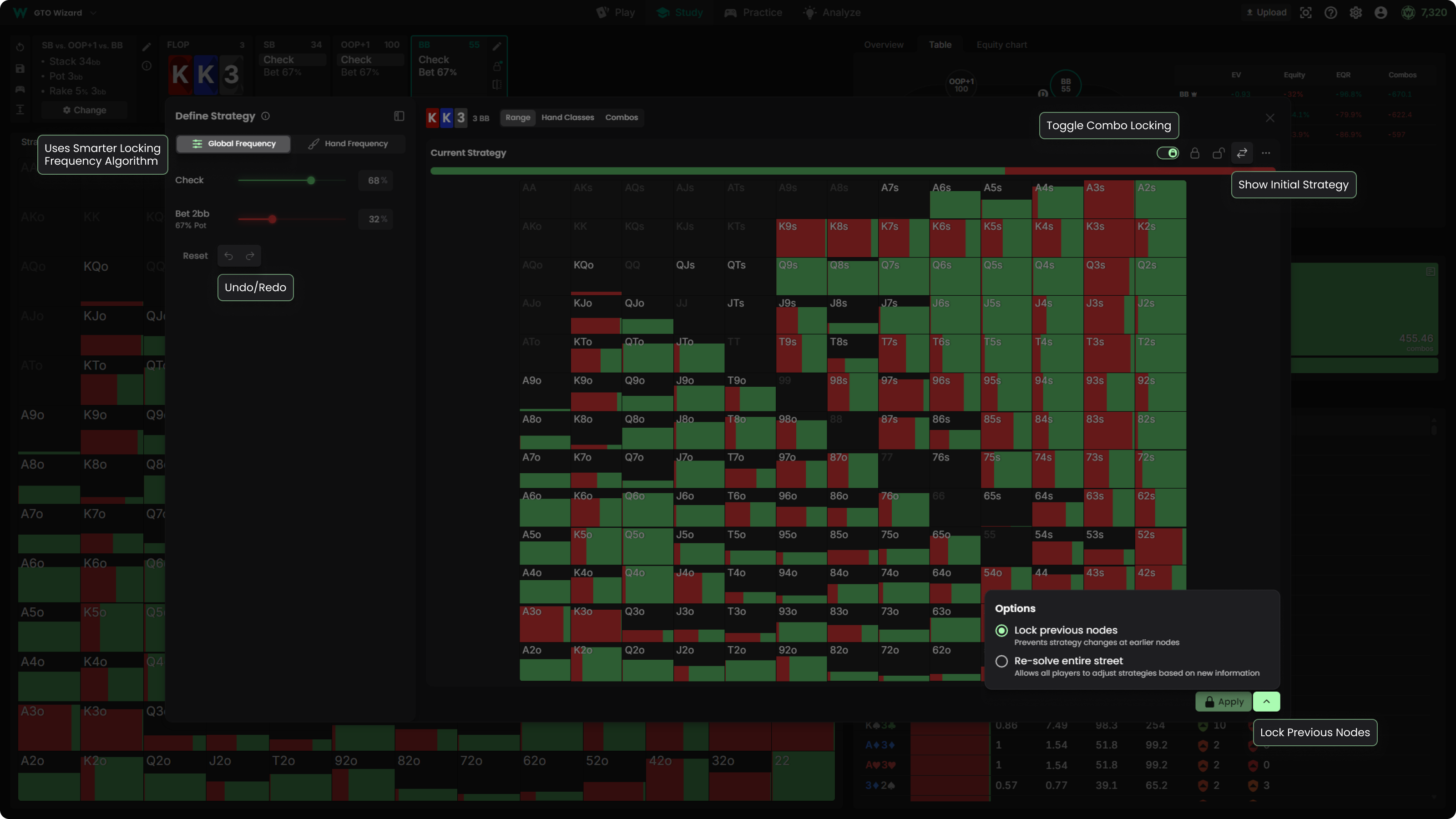 You can also sort a table of all hands in range (Combos) by equity or EV and lock strategies that way. Or use filters to isolate specific combos and adjust only those. The possibilities are endless!