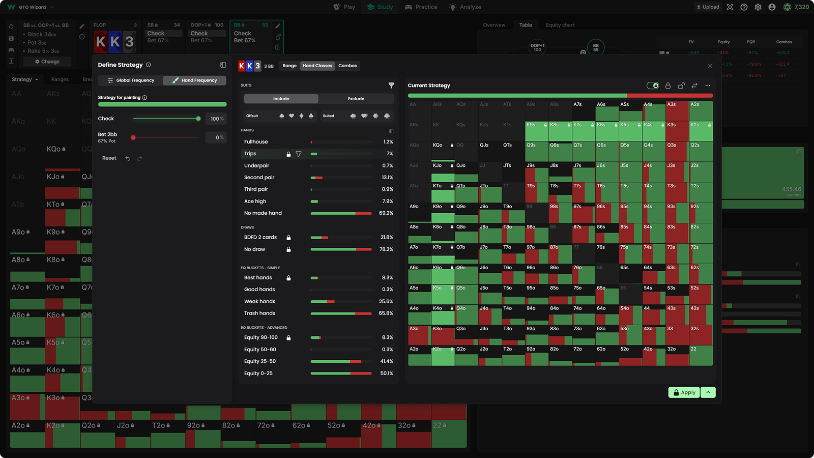 All our previous features remain fully accessible. For example, many users prefer nodelocking entire hand classes instead of clicking individual combinations. To do this, just select Hand Frequency, then click Hand Classes, and paint those instead.
