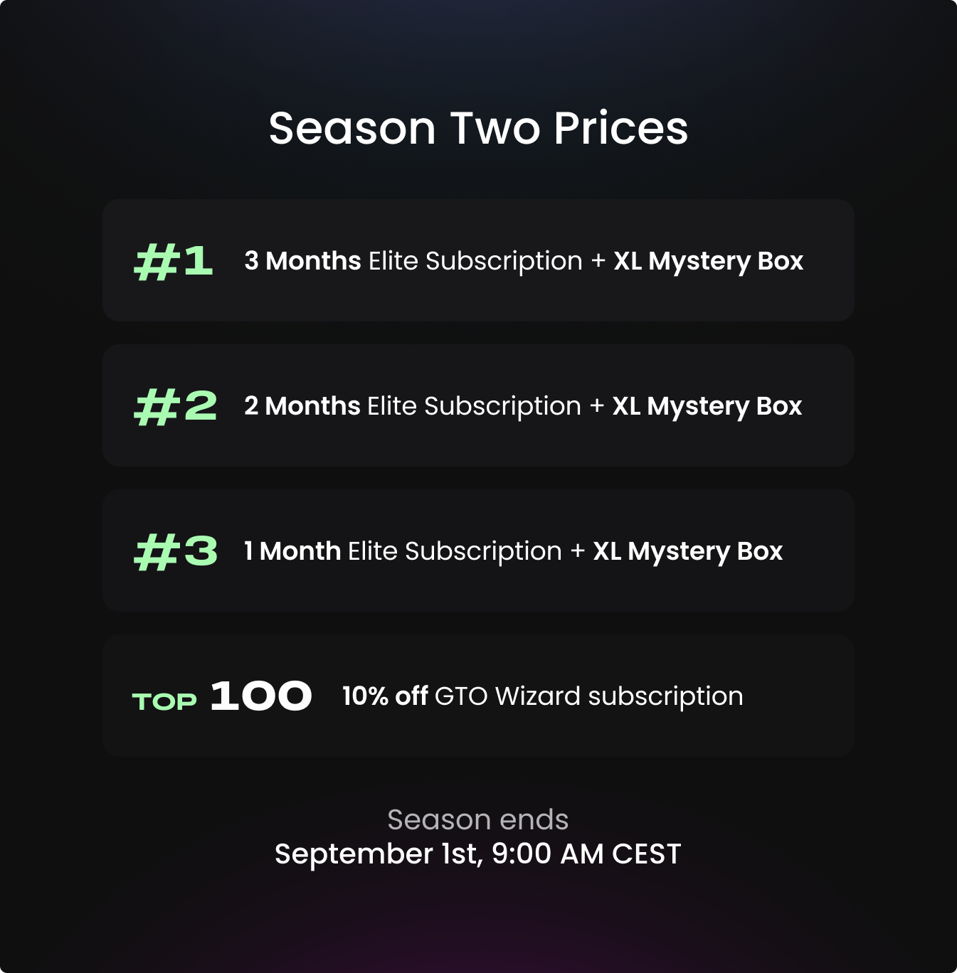 PokerArena is our free poker experience here at GTO Wizard, and Season One was a huge success thanks to our fantastic community. Thousands of you battled head-to-head, climbed the leaderboards, and sharpened your skills.