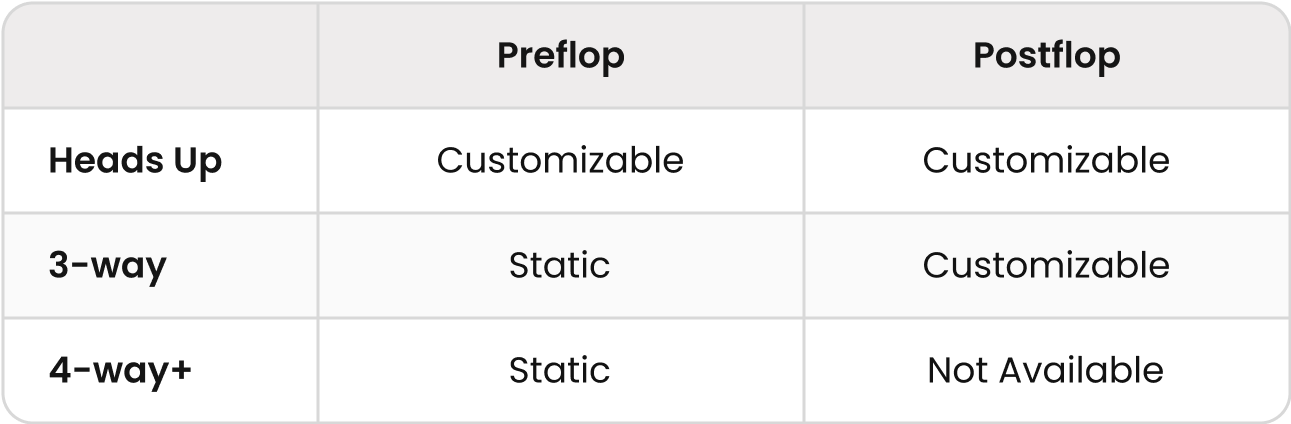 At the moment, you can customize any heads-up solution and 3-way postflop solutions. Multiway preflop, including 4+ players, is on our roadmap.