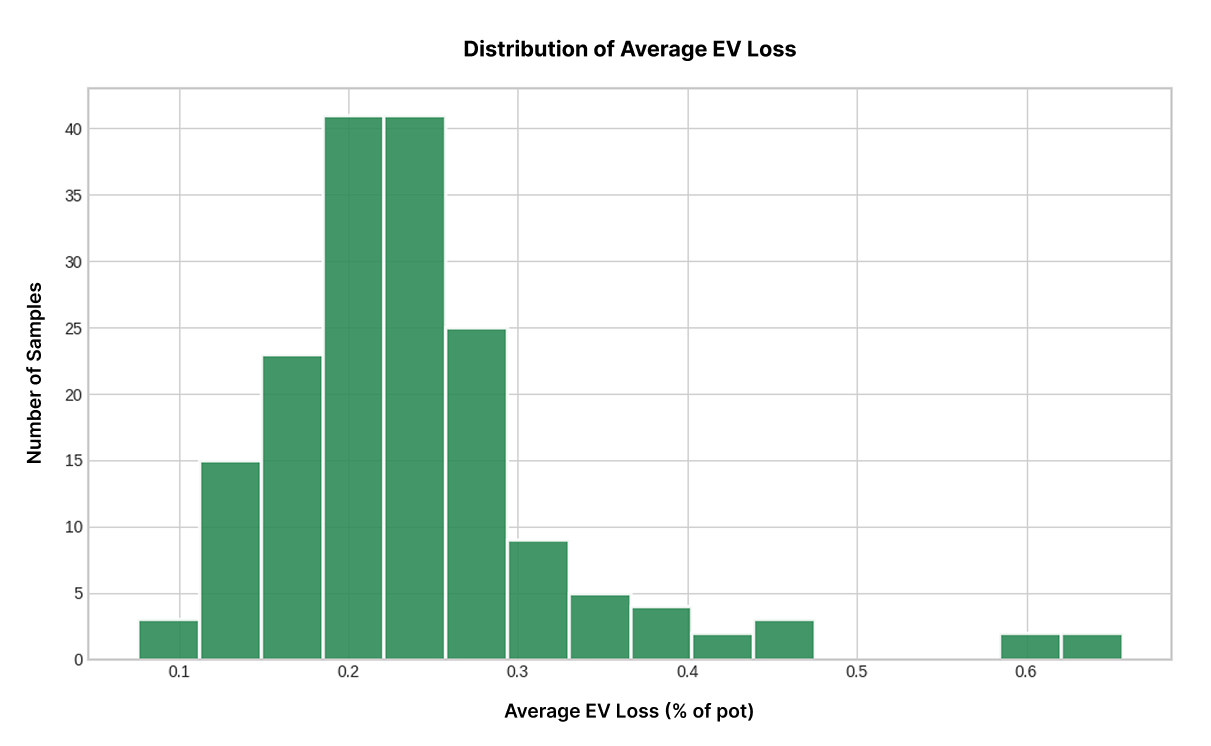 We tested 100 random river spots and shifted one random action by some random amount between -25% to +25%. We found that the new frequency locking algorithm is 3–6x less exploitable than the original algorithm!