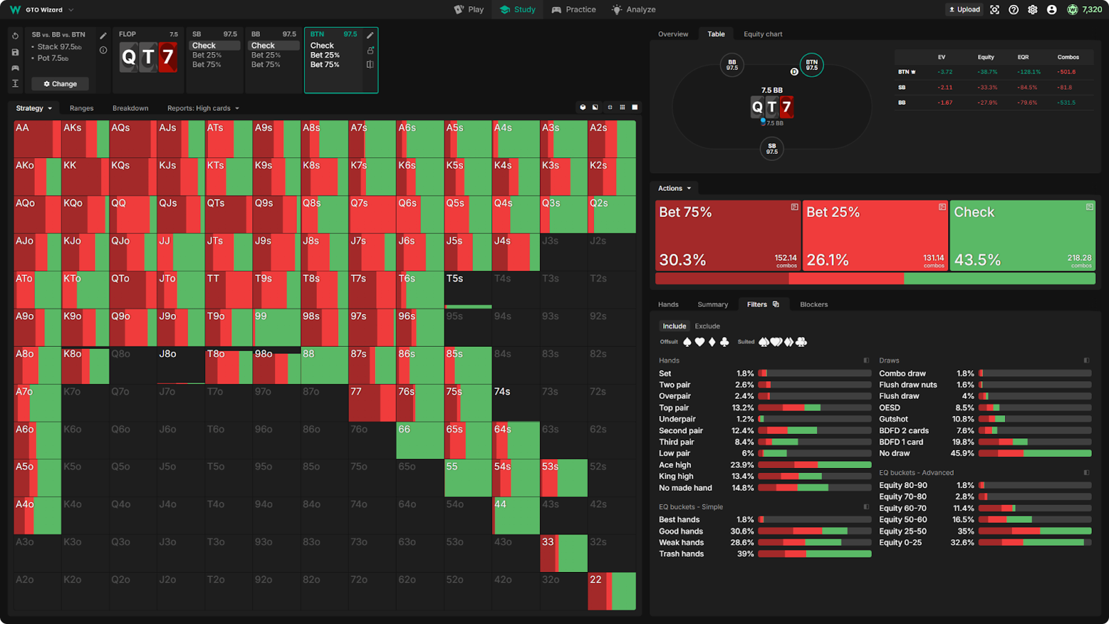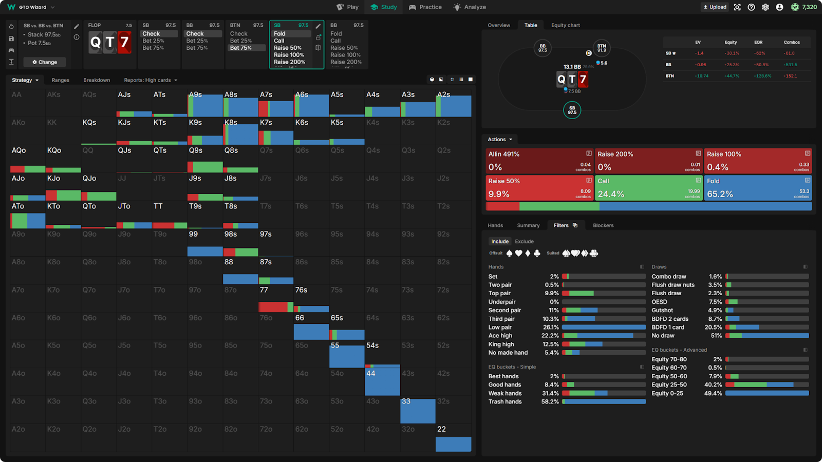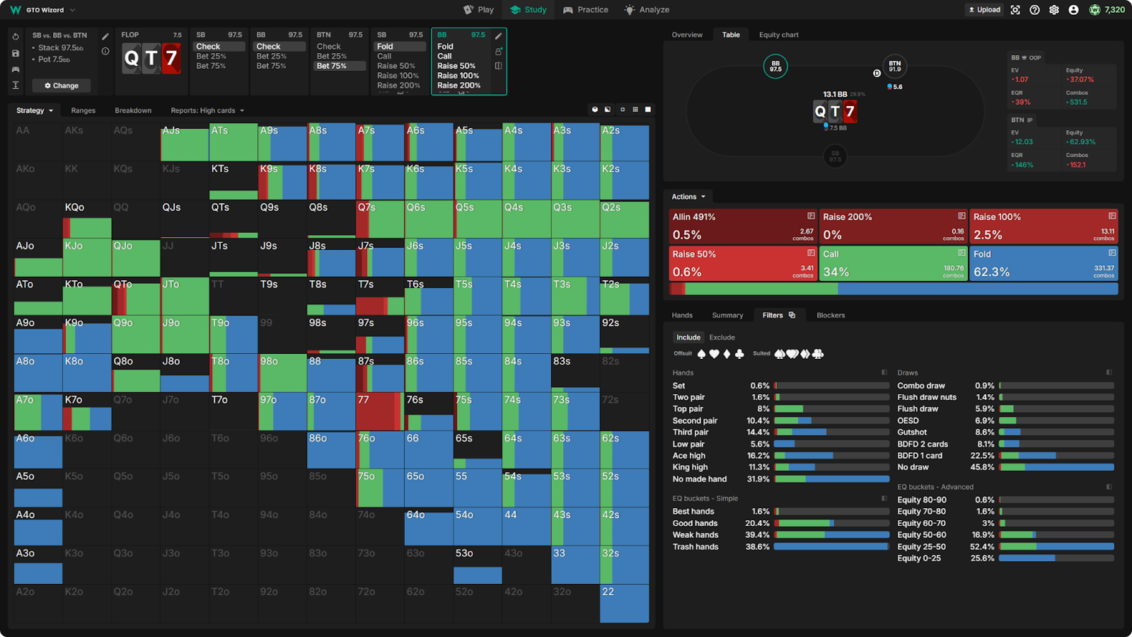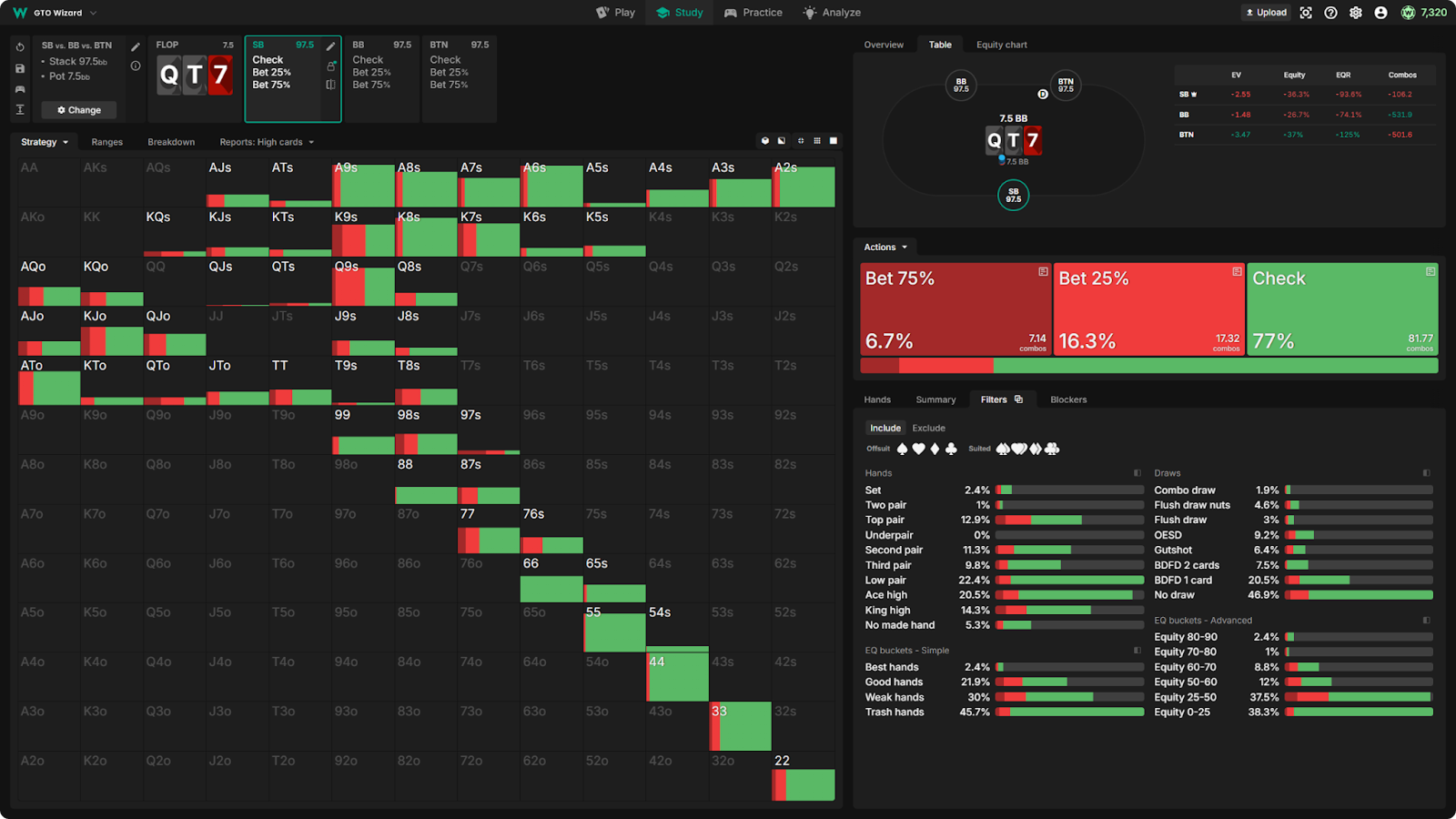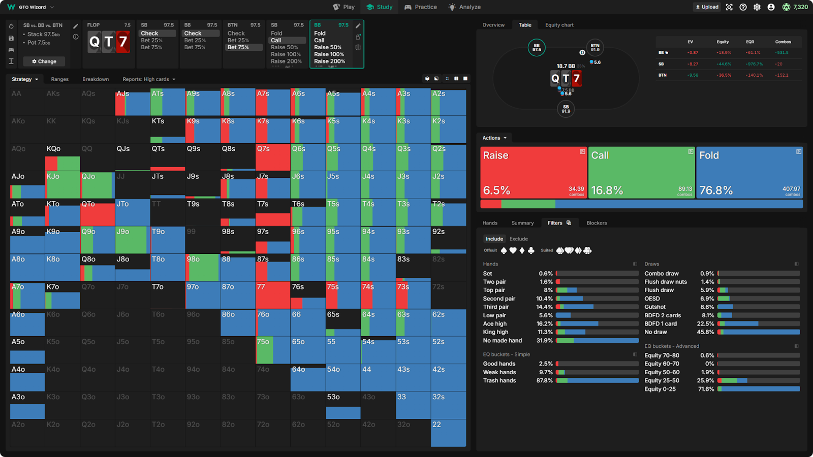 Custom multiway solving requires an Elite subscription, like all custom solving features and GTO Wizard AI usage. However, you can try before you buy: anyone can solve the flop Q♠T♠7♥ for free with unlimited usage.