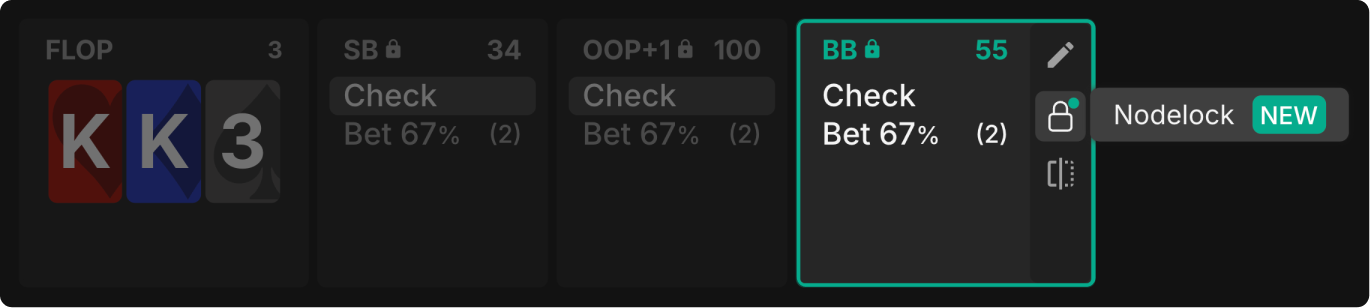 Nodelocking is an incredibly powerful tool that allows you to model player strategies and study exploitative tactics. However, we found that our previous interface was somewhat confusing and difficult to use. That’s why we’ve completely revamped the Nodelocking interface to make it smoother, more intuitive, and more powerful. Our aim is to make this tool as intuitive as possible. Feel free to let us know if you like the new interface, or what you want to see improved in our Discord server!