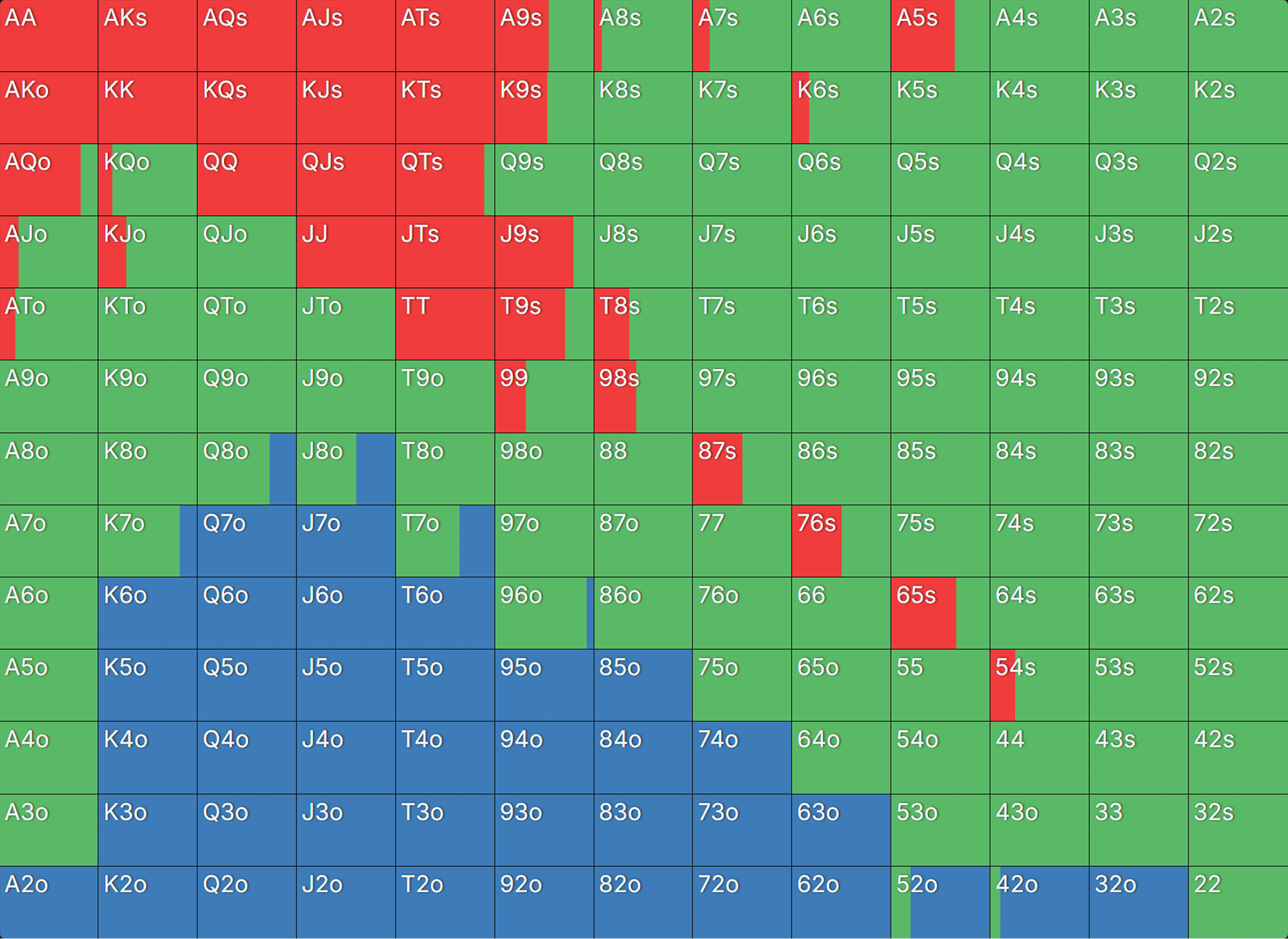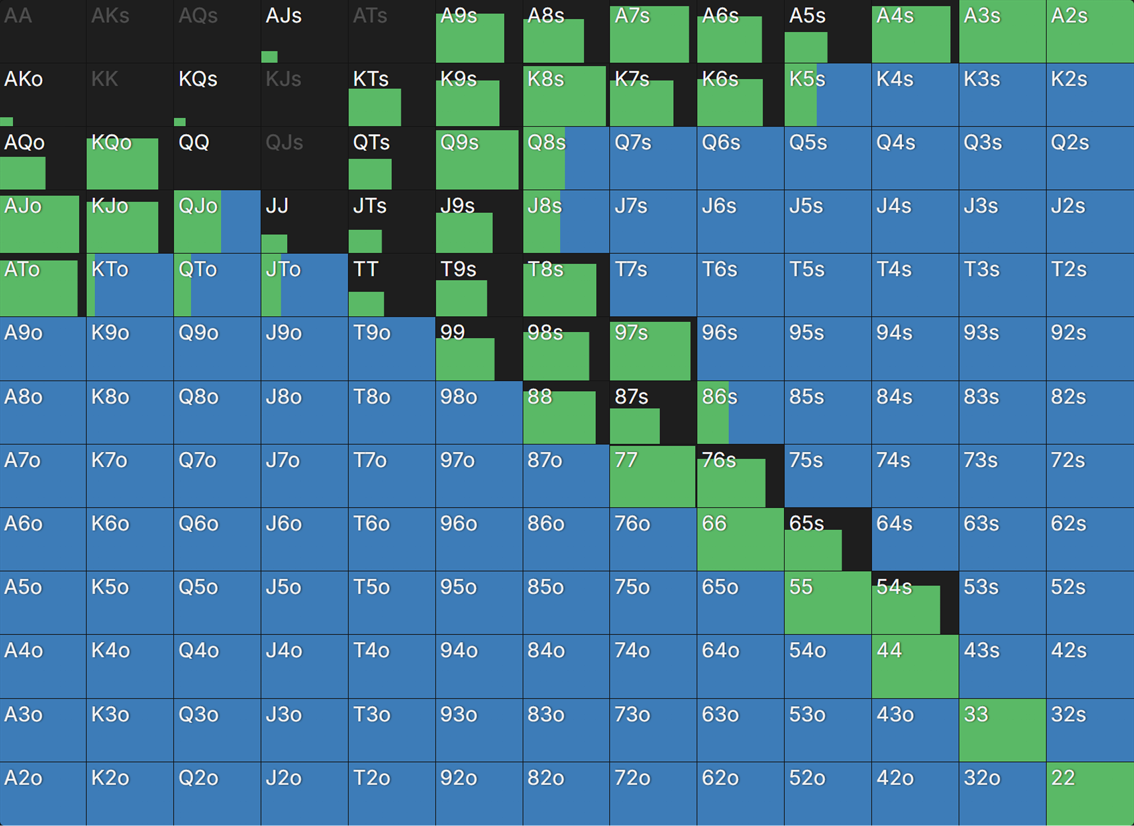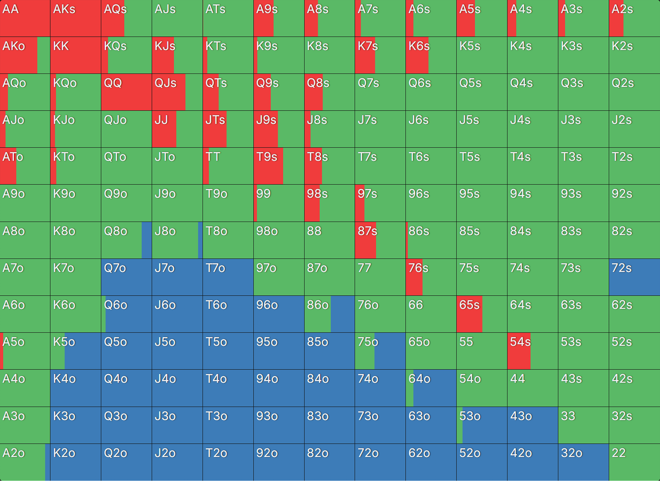 It’s worth noting here that the BB switches to an almost purely linear 3-bet strategy when the SB is in the pot. Now, suited Broadways become a pure 3-bet, as well as TT–JJ, while many lower-EV hands move from a mixed to a pure strategy (i.e., call). This is important because it removes several strong hands from BB’s preflop calling range, further reducing their EV on flop textures where the nutted part of their range is not present in a single-raised pot.