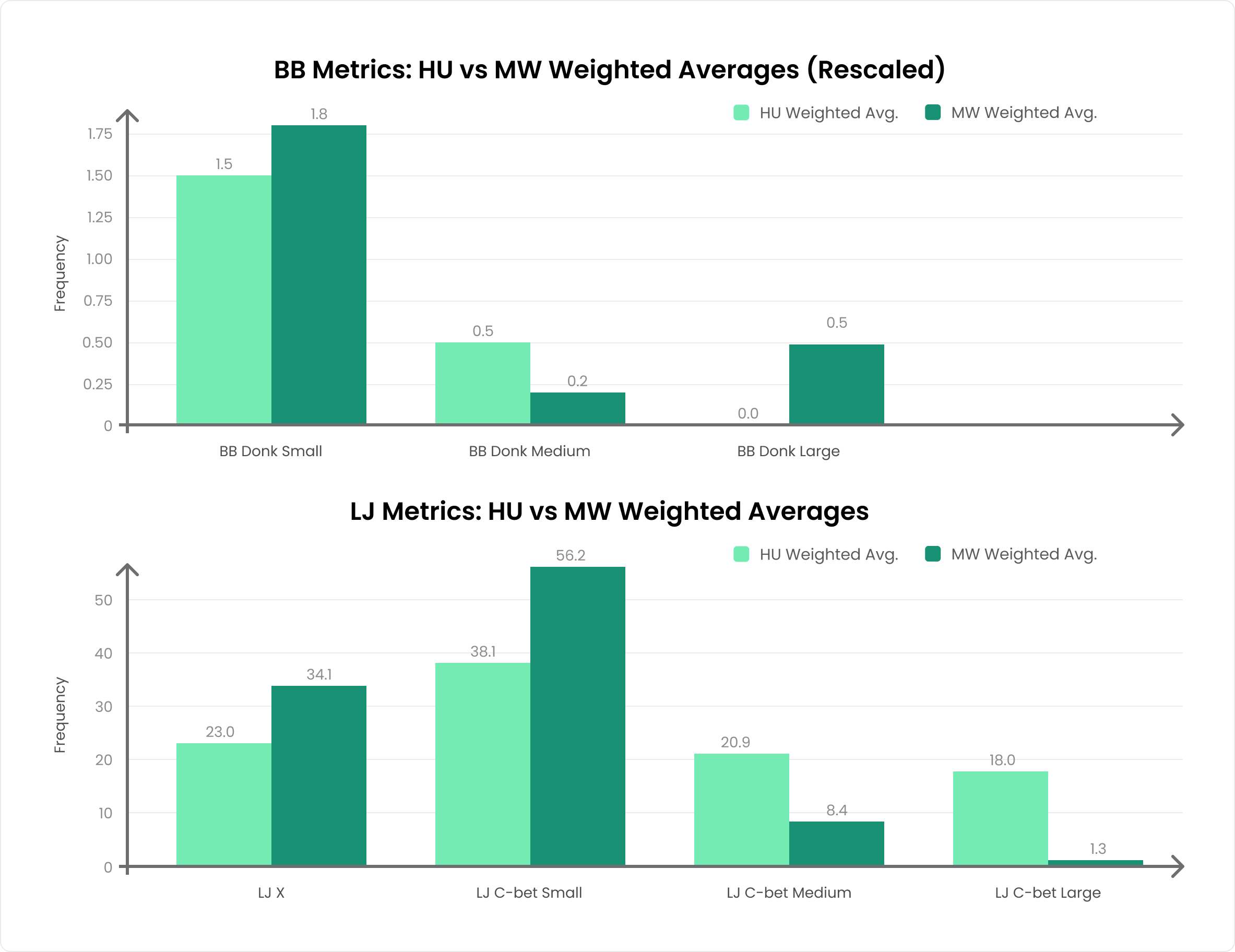 Our main takeaway from the data above is that LJ’s EV decreases for all their hands when comparing MW to HU pots, with the exception of A♠K♥9♠, as they have the nuts advantage on that board.