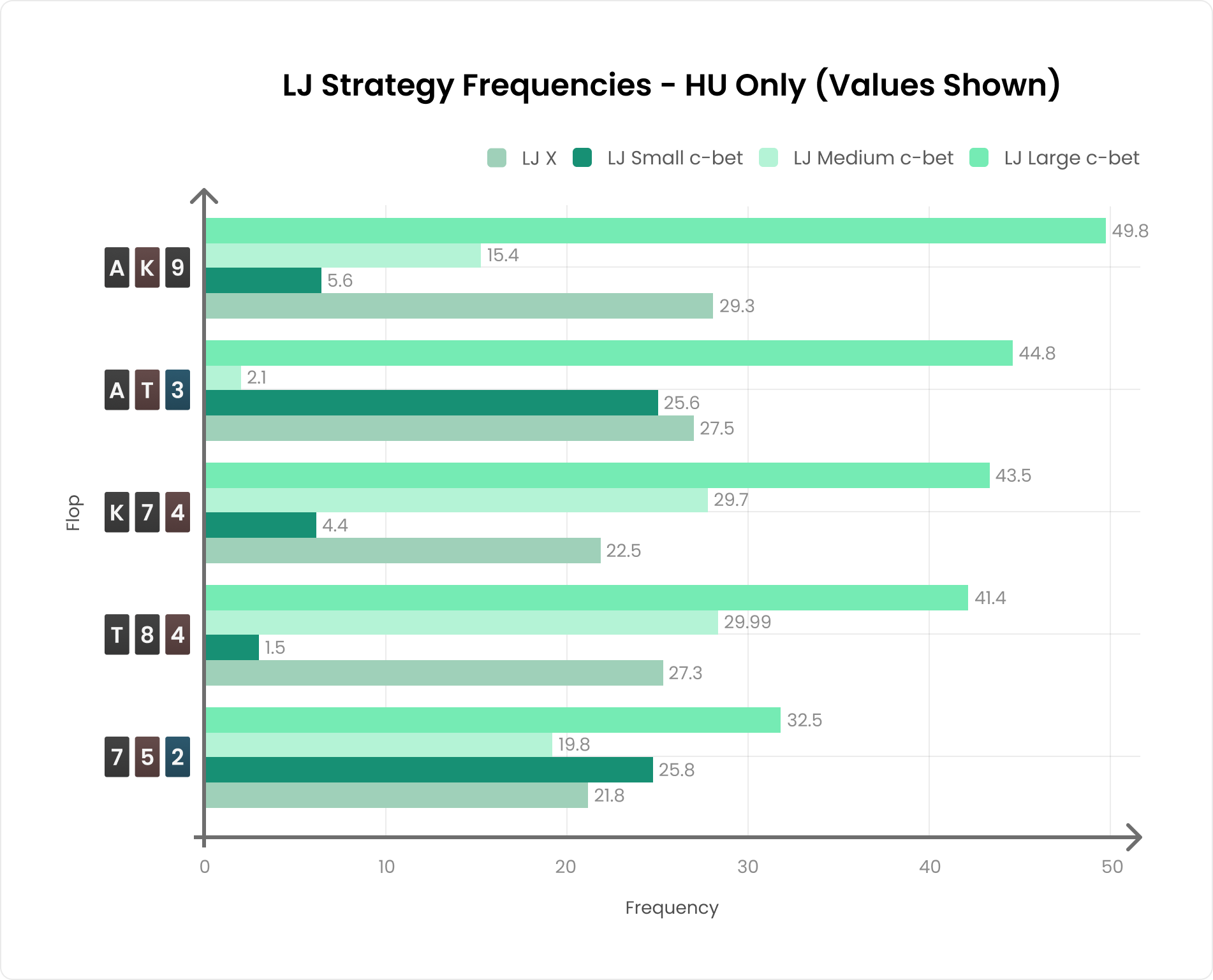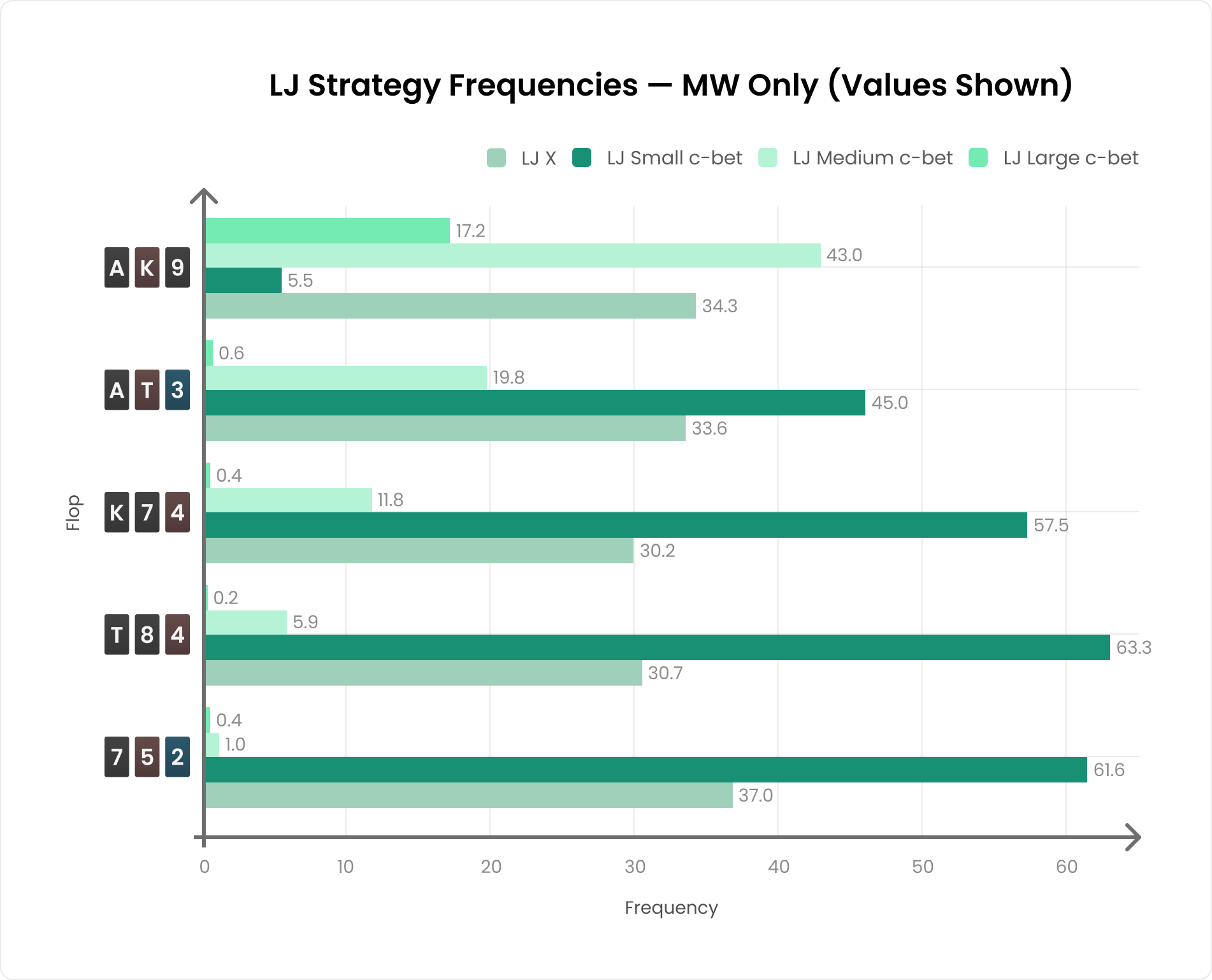 The LJ has reduced their c-betting frequency and sizings in our multiway (MW) solution. We can even see that the large (pot-sized) c-bet that was used 18% of the time heads up (HU) is now all but gone, being used only 1.3% of the time. As for the betting frequency, part of this is due to the reduced overall EV across flops when playing against two ranges, but part is also due to the lower polarity of LJ’s range when facing two opponents. We can see the following effect on flops where previously LJ used a large bet strategy: