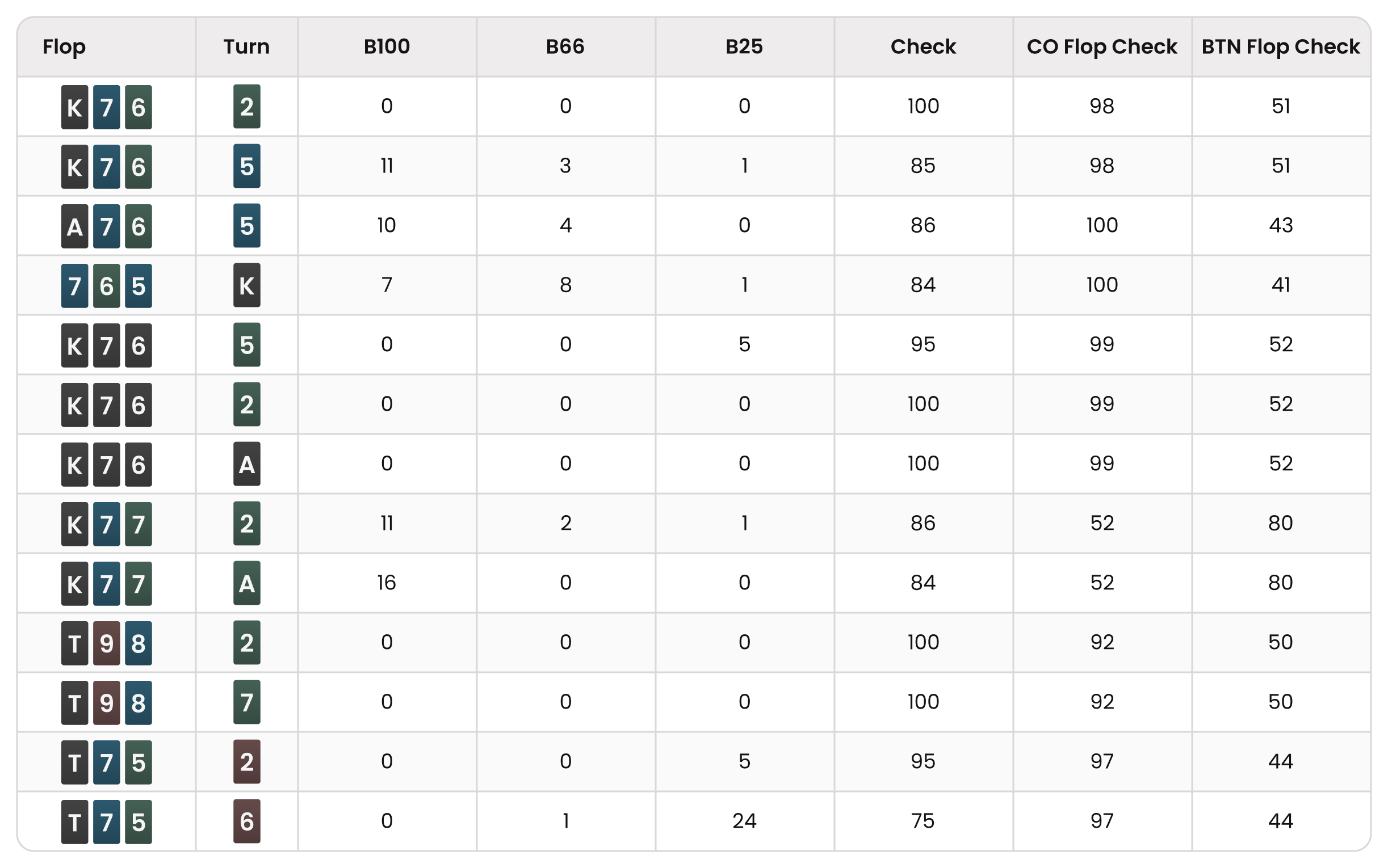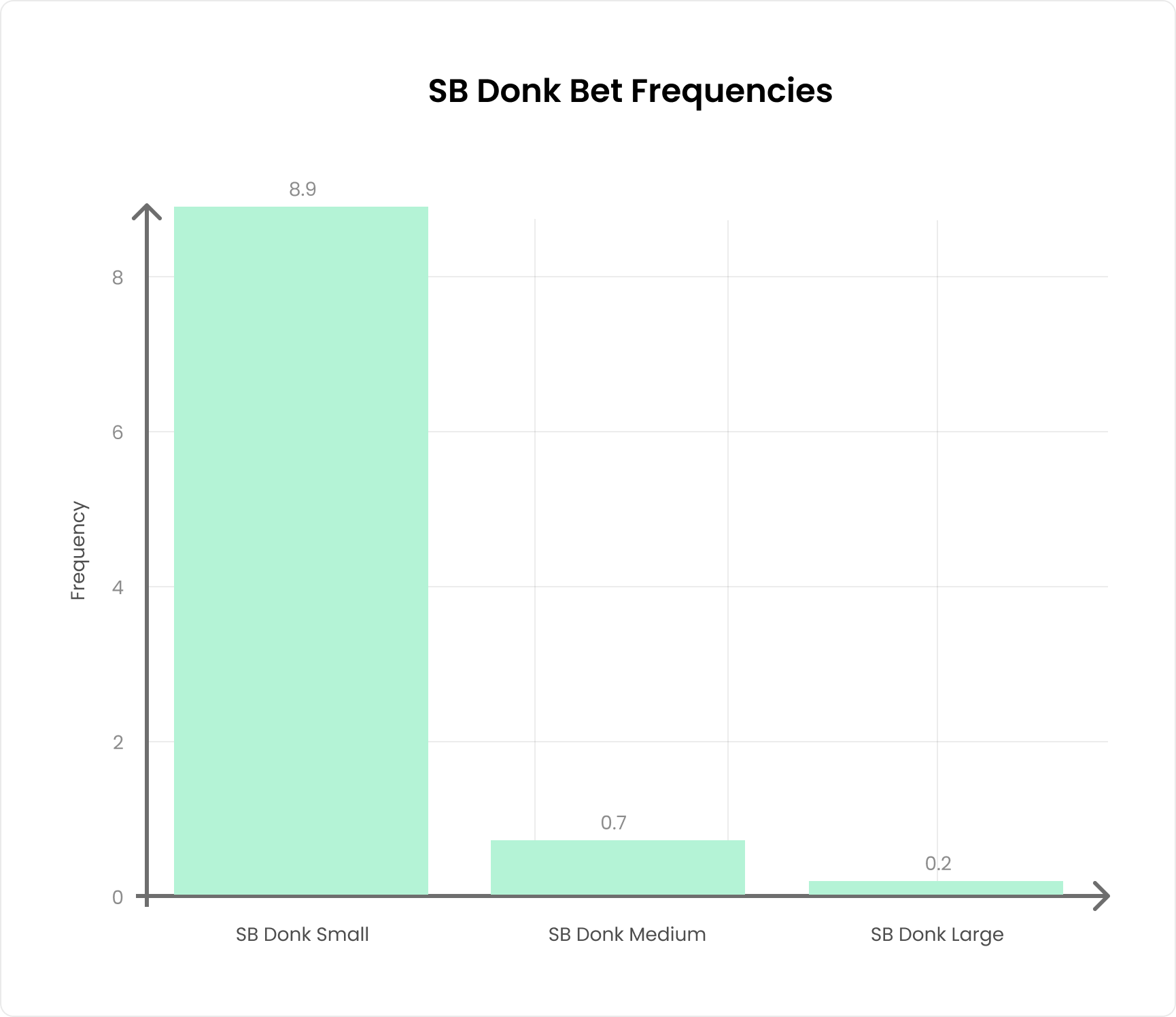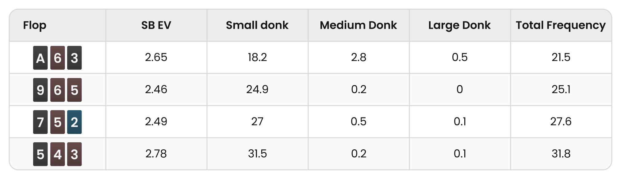 As you can see, the SB does donk 9.8% of the time, primarily using a small (33% pot) bet size. When we look more closely at the raw data, the following flops have the highest SB donk frequencies among those tested.
