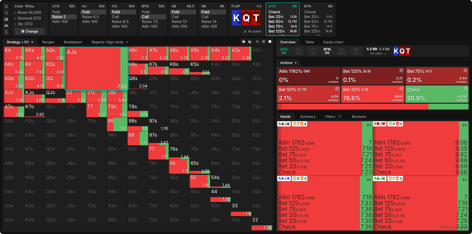 For example, here’s a 100bb cash sim for a UTG vs BTN SRP. K♦Q♥T♥ is one of UTG’s most bet flops, but the solver wants to check about 20% of the time, especially when UTG has 99 or 88 without a ♥. But it also includes very strong hands like sets, two pair, and even the nut straight in its checking range at some frequency: