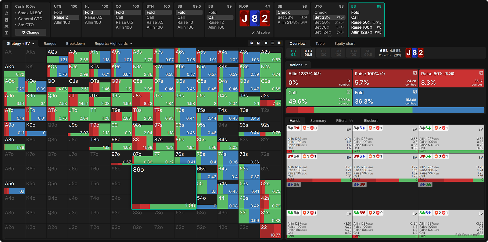 To some degree, solvers account for this by check-raising a more diverse range of hands, some of which may seem strange or counterintuitive. For example, in a 100bb cash UTG vs BB SRP, the solver advises check-raising sets, two pairs, flush and straight draws, but also some less intuitive hands like A♥5x, 6♥8x, and bottom pair on J♥8♦2♥: