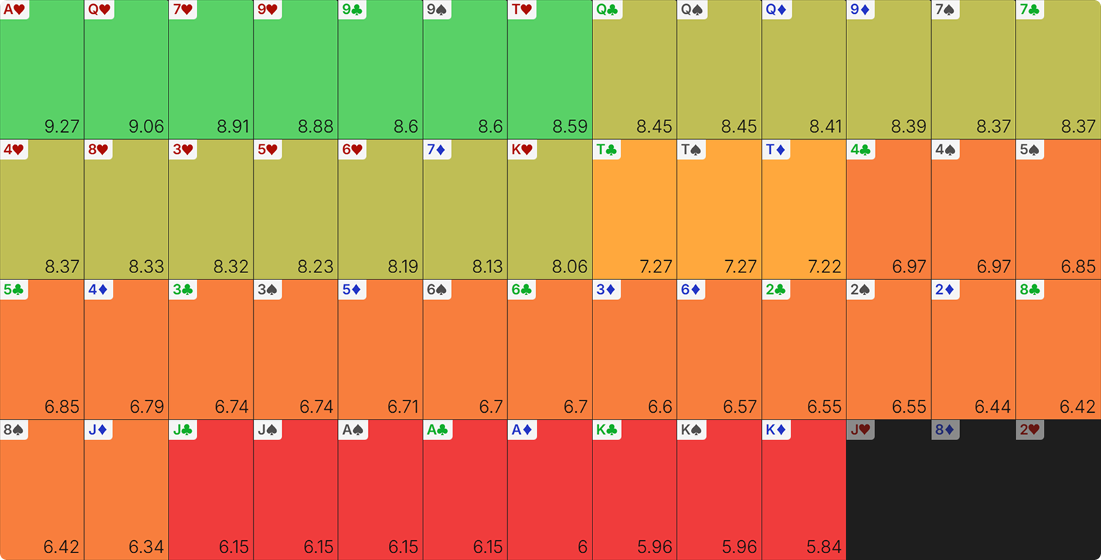 But not even a solver is perfectly “balanced” in this broad sense of the term. When UTG calls the check-raise, BB’s EV varies dramatically depending on the turn card: