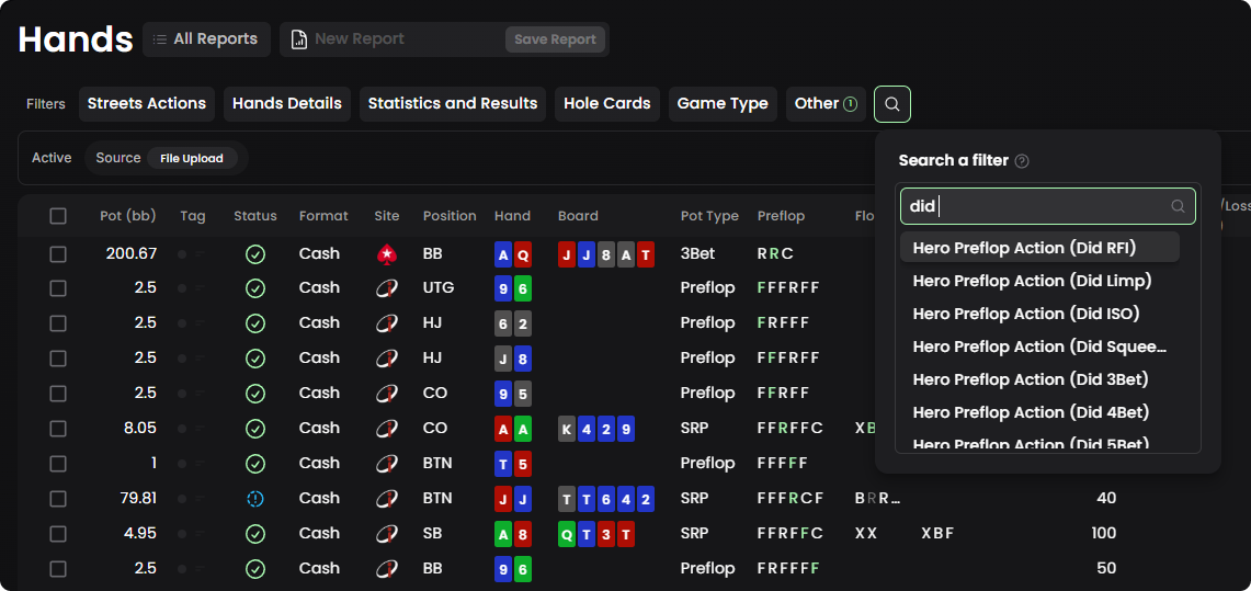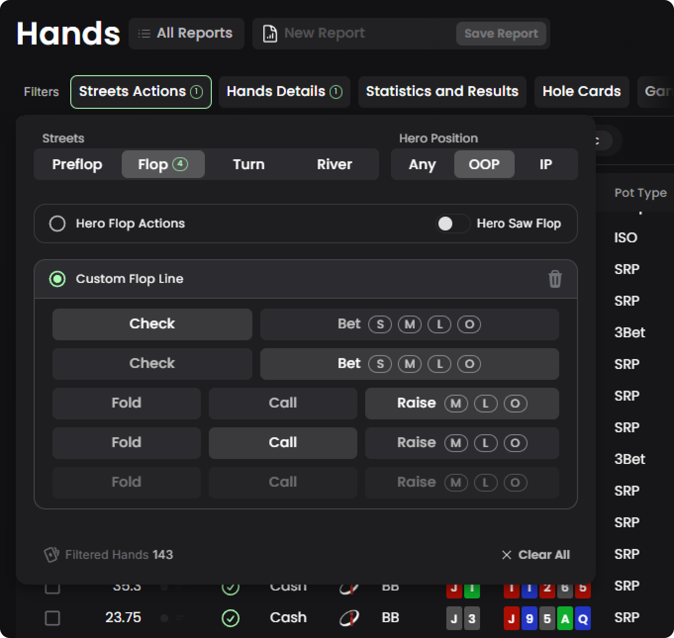 The Hands Table is the central place to review all your uploaded hands in the Analyzer. We’ve redesigned this table with a more efficient interactive layout. Now you can filter, sort, and navigate hands more easily, and jump directly into Study or Practice mode. Review more hands in less time, move directly from leak to drill, and keep your workflow tight for coaching, prep, or self-study.