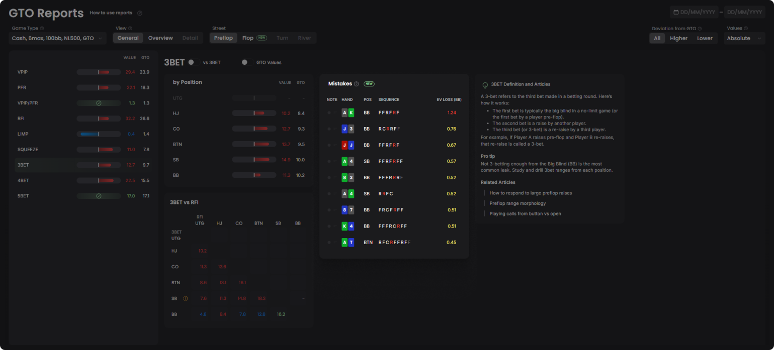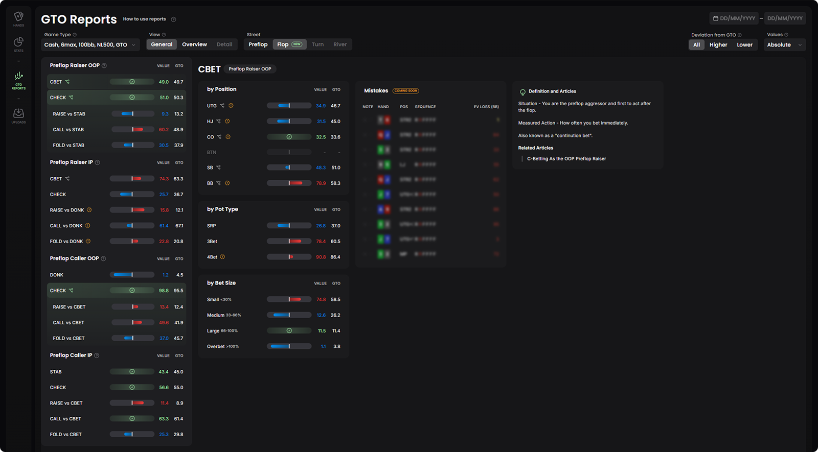 The redesigned Hands Table in the Analyzer makes reviewing sessions and finding leaks much more efficient with smart filters and seamless one-click jumps to Study or Practice mode. GTO Reports got a solid upgrade, now displaying your biggest preflop mistakes as well as a new General Flop View that makes it easy to compare your flop frequencies to GTO benchmarks.