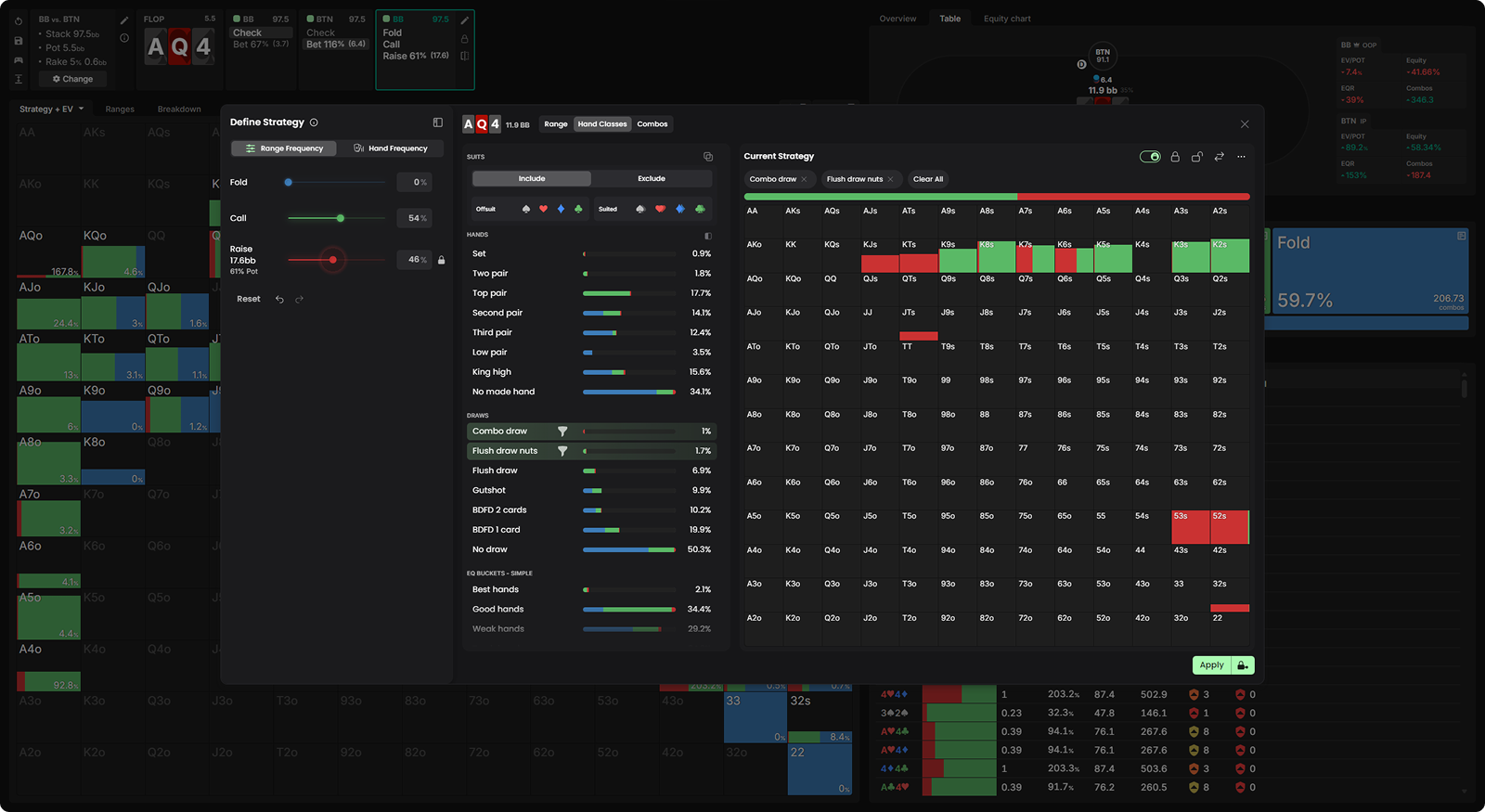 Before, frequency locking applied to the whole range. Now you can target a slice. For example, set top pair to bet 65 percent. The engine finds the least exploitable way to hit that target inside the filter.