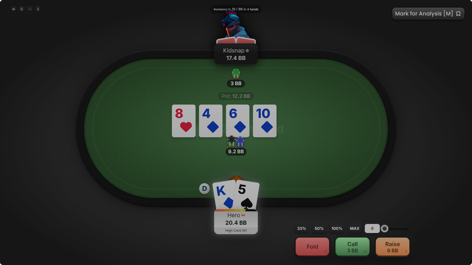 See a tricky spot during the game? Mark it with one click to easily retrieve and review it post-game in the Analyzer. Perfect for highlighting tough spots and learning from them.