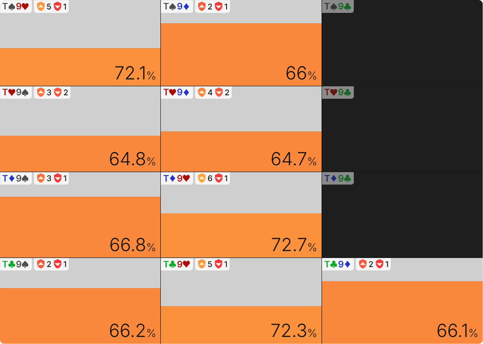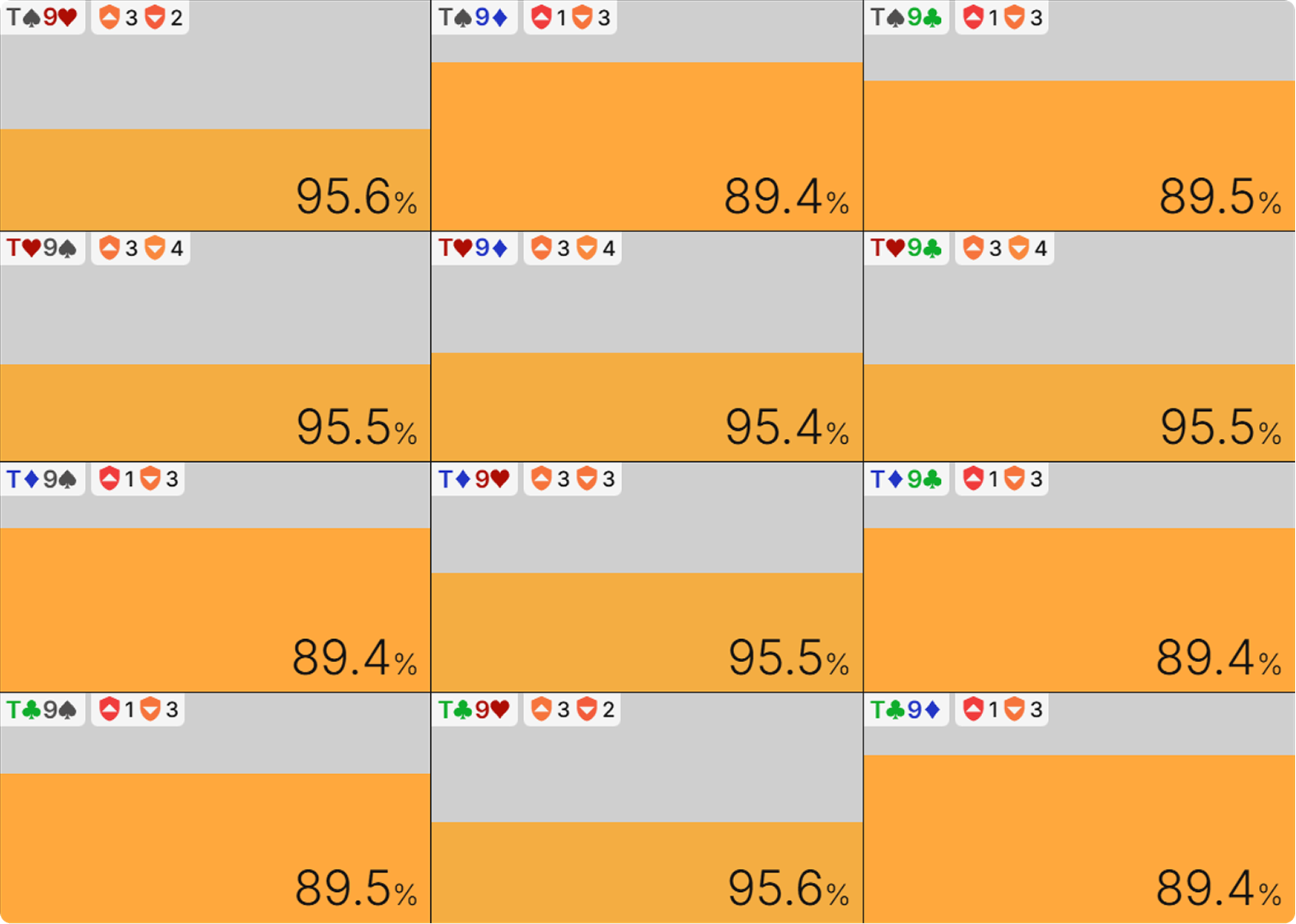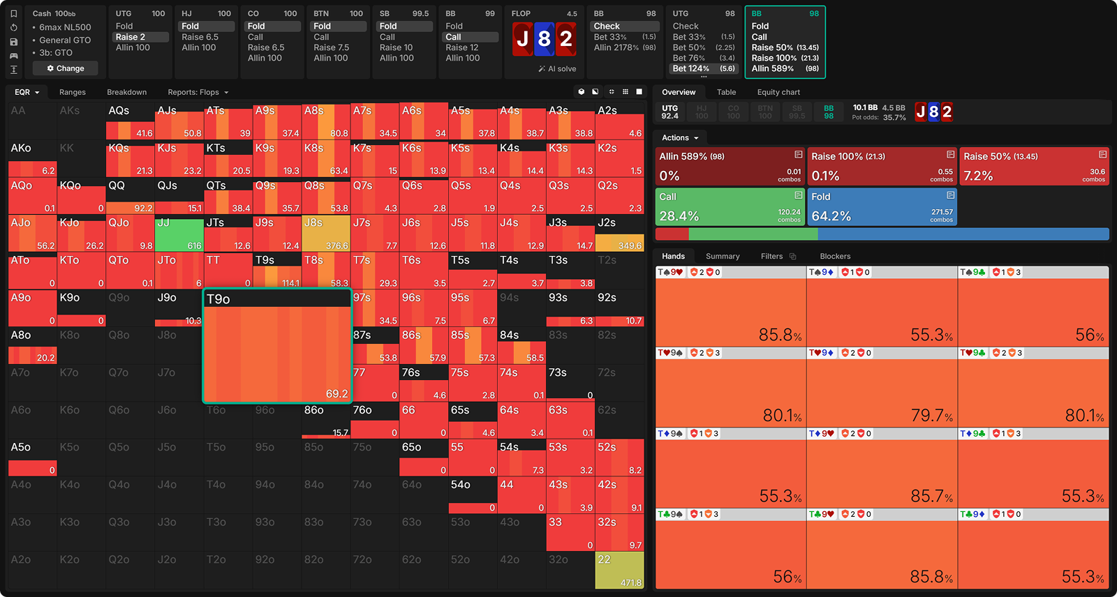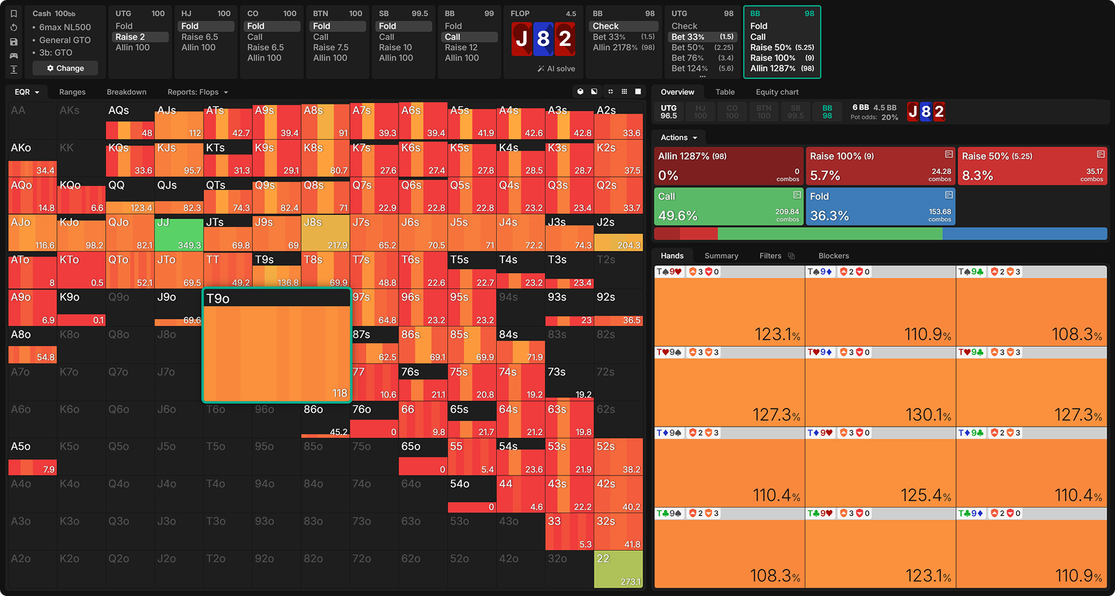 In a 100bb cash game spot, UTG vs BB single-raised pot (SRP), BB holds T9o on a J♥8♦2♥ flop. Facing a 33% pot c-bet, the solver expects all combinations of T9o to realize more than 100% of their equity, whether they raise or call, though of course it’s better to have a ♥ and best to have both a ♥ and a ♦, to reduce the chance of being beat when we hit something: