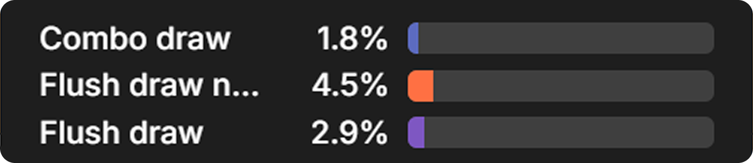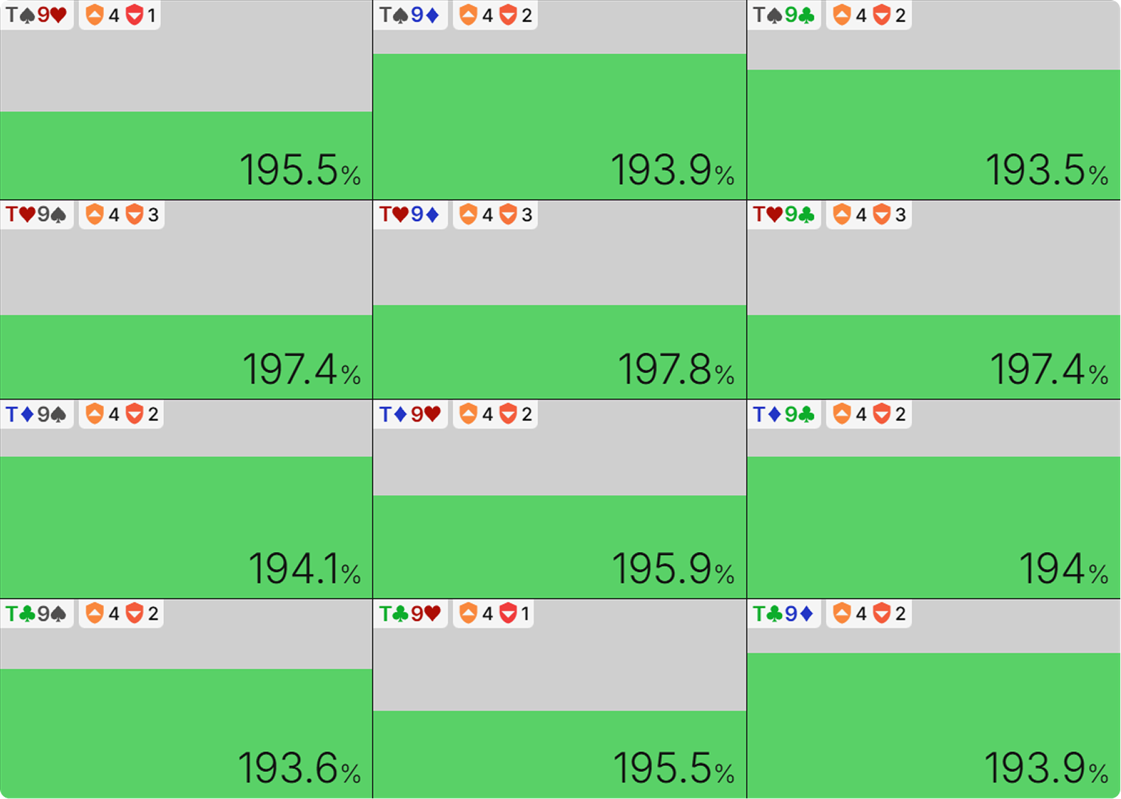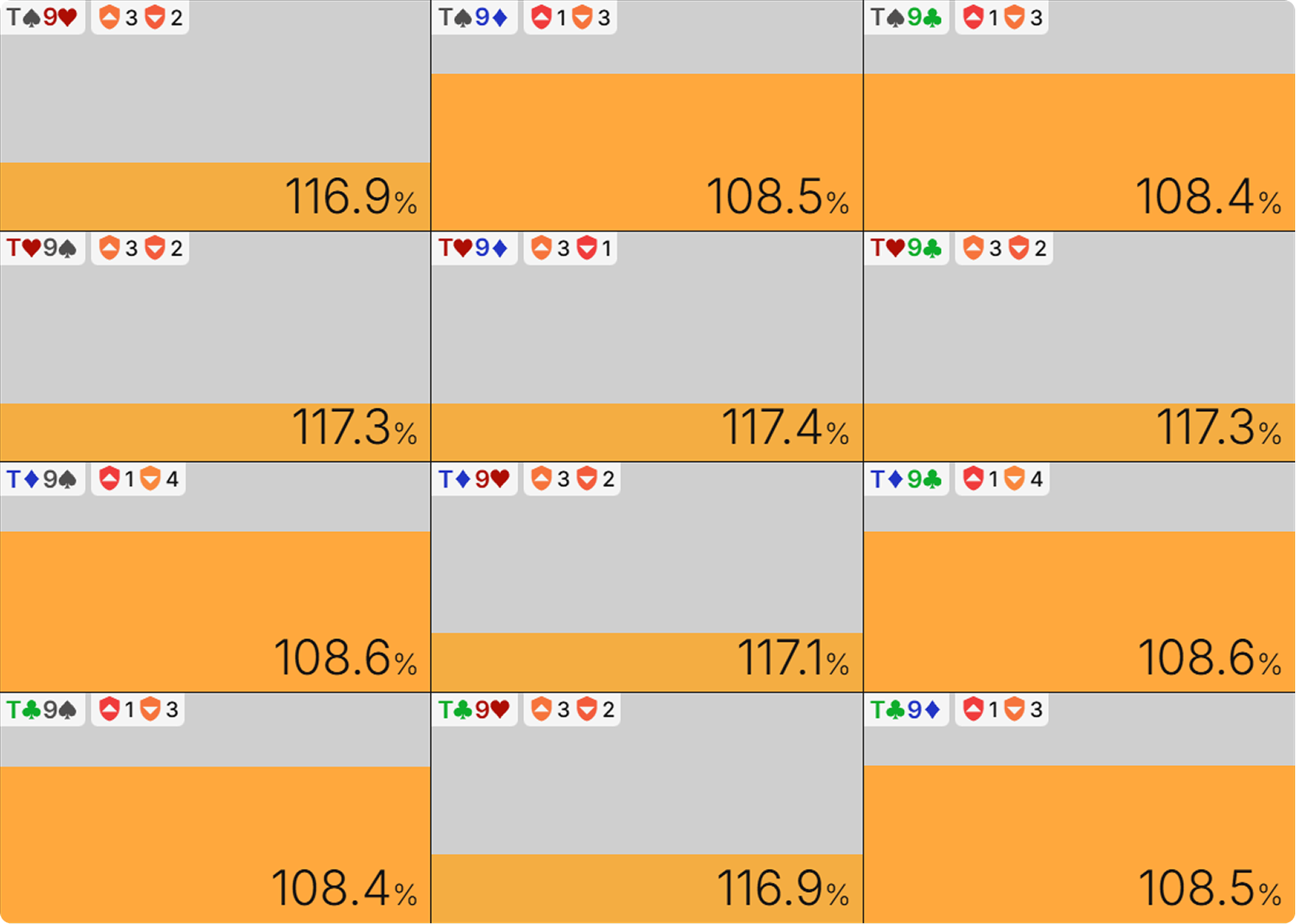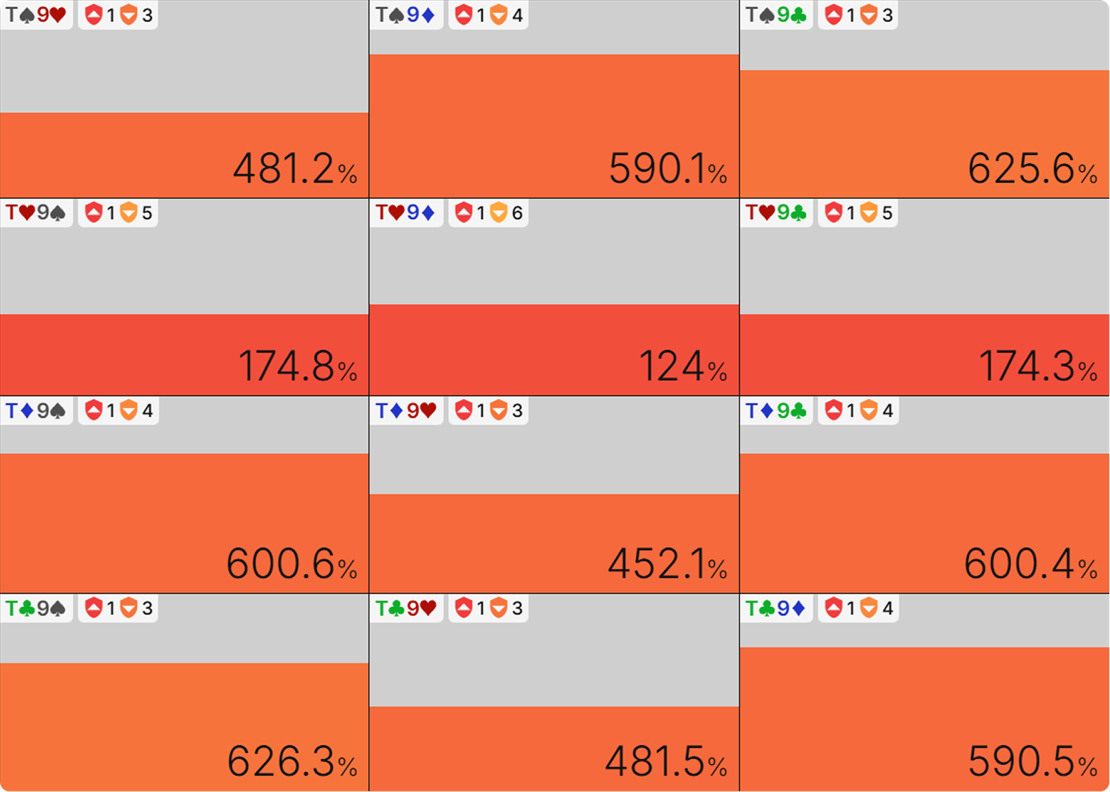 Using turn reports, we can filter for T9o and visualize its EV on all turn cards. Six of our outs make up the bulk of our hand’s expectation, two of our outs complete potential flush draws and are substantially less valuable. Yet, even when we fail to improve immediately, the remaining cards aren’t worthless. Bricks still carry some hidden equity: take the 4♠, for example, where T9o retains roughly 60% of its flop investment—a substantial cushion that highlights the persistent strength of our hand’s potential to bluff or realize equity on the river.