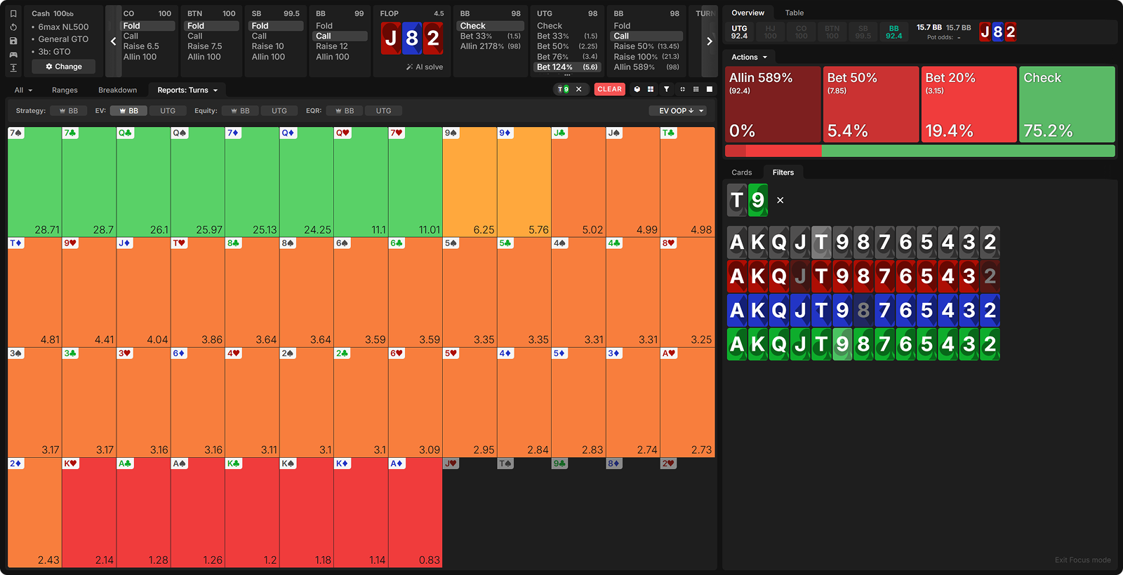 This is T9o’s performance on J♥8♦2♥ 2♣ 2♦ after UTG overbets the flop and checks back the turn.