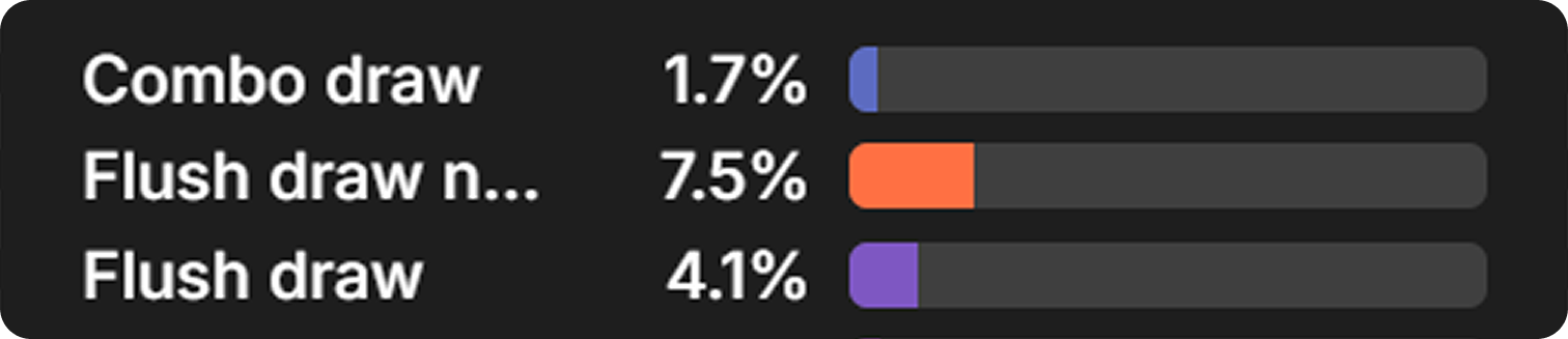 Compare this to the situation after calling a small 33% pot bet, where even combos without a ♥ over-realize on the same turn:
