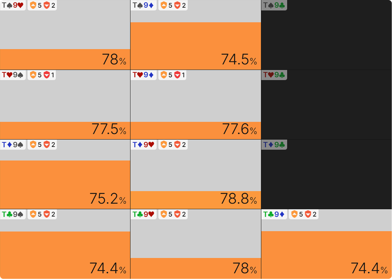 T9o realizes equity much less well against this large bet. The combos without a ♥ suffer the most, realizing barely half their equity. They still never fold, because they have enough equity that they can get away with realizing only half of it, but it’s worth digging into why the big bet is so much worse for them.