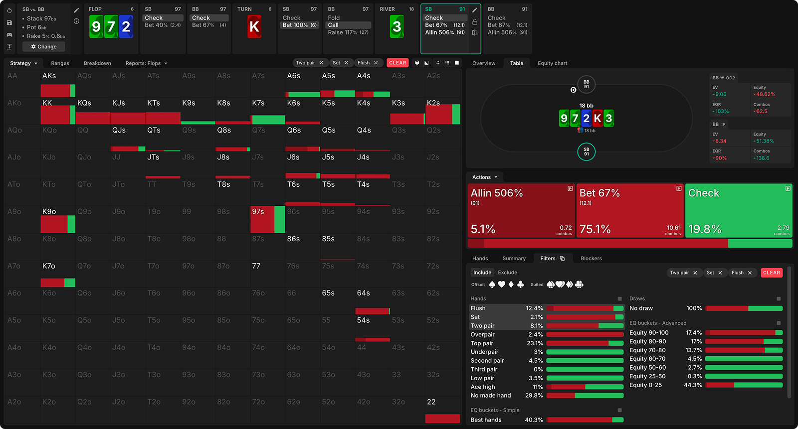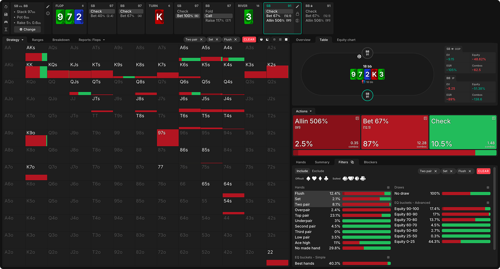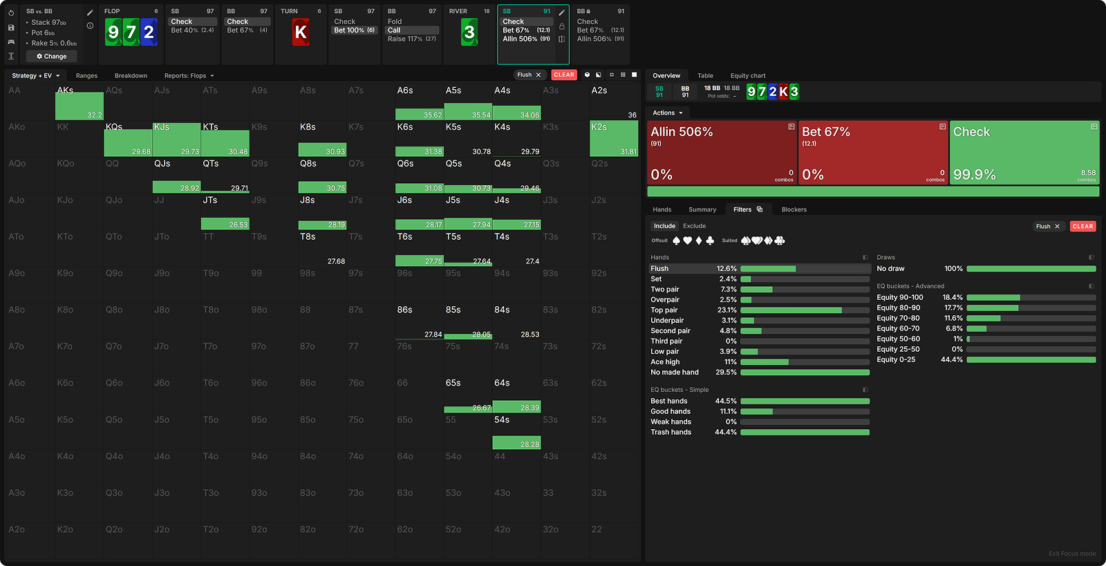 The flop checks through, then the SB pots the turn, and the BB flicks in the call. Here’s the SB’s GTO strategy with their strongest hands on a board of 972 K3.
