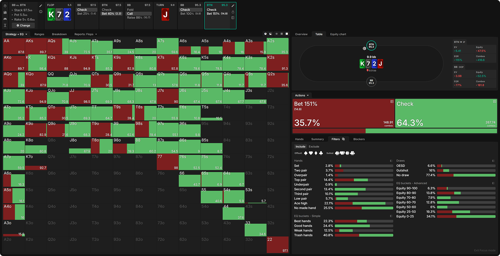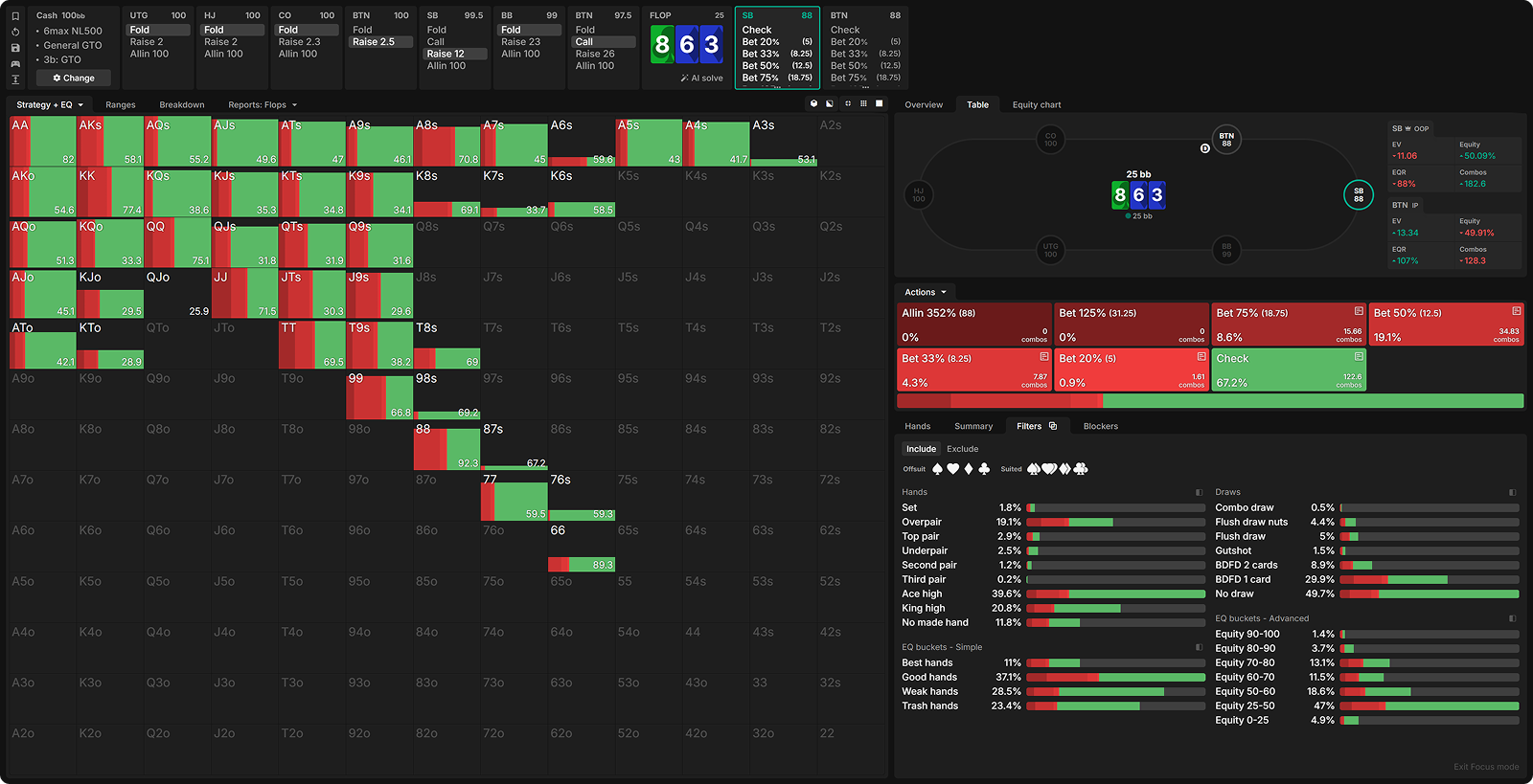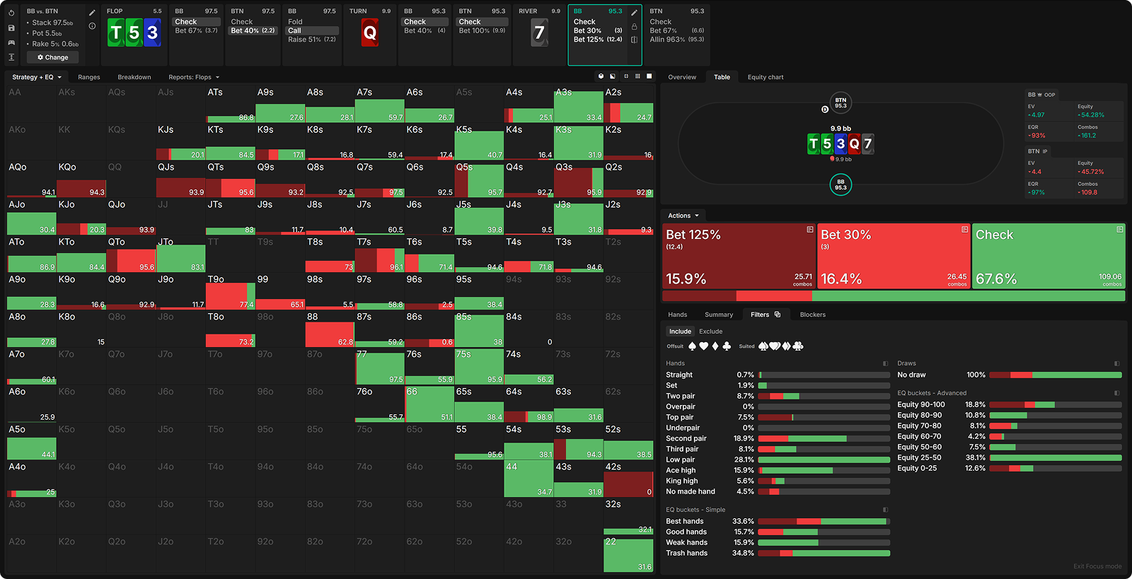 The flop checks through, then the SB pots the turn, and the BB flicks in the call. Here’s the SB’s GTO strategy with their strongest hands on a board of 972 K3.
